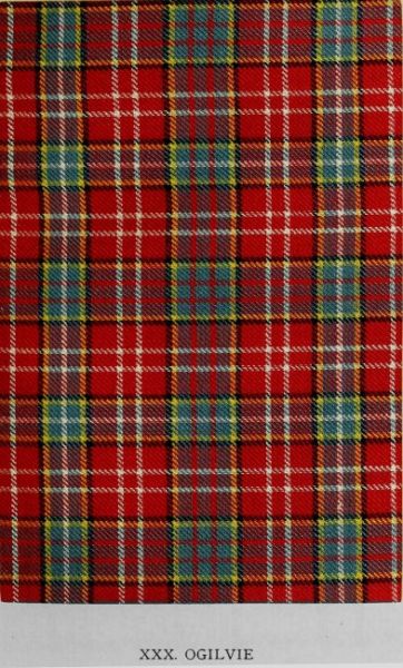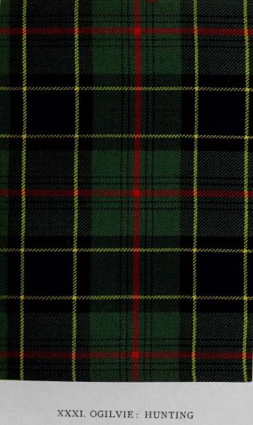 Generally styled the hunting Ogilvy, though sometimes merely the Ogilvy, this example is found in all early collections. That of the Highland Society of London (1822) contains an especially fine example. In the Moy Hall collection the specimen is labelled Ogilvy of Inverquharitie—its only appearance under that name. Nothing authentic has been ascertained as to its first introduction, but traditions of its long use are plentiful among the families entitled to wear it. An ancient legend of the Ogilvys concerning their tartan has been deemed to apply to this pattern, and to prove its antiquity. It is averred that the fairies, displeased at the appropriation of so much of their favourite colour (green) in the design, cast their influence against the clan in one of its feuds, and brought about its overthrow. Hence, according to the legend, the adoption of the pattern shown in the preceding illustration. The tale has likewise been attributed to the tartan commonly known as the Ogilvy, but restored to its proper designation in this volume as Strathallan Drummond, where the same hue is also predominant. But as that design was not adopted by the Ogilvys till 1812—long after the date of the legend—this application is obviously recent.