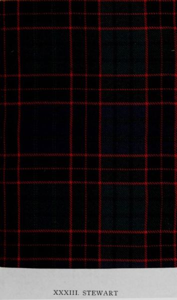 For the source of the present illustration reference must be made to the notes on the Stewart of Atholl tartan (Plate XXXIV.) The pattern is identical with the Royal Stewart as now worn, except that the present sett has four narrow green lines running through the large red squares. In the Grameid (pp. 142-3) it is stated, in connection with Dundee’s gathering at Lochaber in 1689, that “brave Stewart of Appin, ... with the whole body of his clansmen, leaves the shores bordering Leven, ... carrying blue banners charged with yellow figures, ... and wearing on their lofty heads fur bonnets.” The passage, unlike portions dealing with other clans, contains no mention of the tartan colours. During the ’45 the Appin Regiment bore itself gallantly for the Prince. The roll of the killed and wounded in the campaign supplies interesting evidence of the variety of minor septs often included in the larger clans. It is compiled from memoranda made by Charles Stewart, nephew of Fasnacloich, Captain in the Highland Army, and sometime Quartermaster-General and Secretary to Prince Charles Edward. The list is as follows:—
