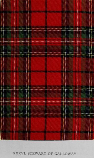 Like the preceding design, this is one of the five tartans omitted from the published Vestiarium Scoticum; and it differs from the Stewart of Appin merely in the number and the tint of the lines intersecting the red squares. In the same respects it differs also from the Royal Stewart, the evolution of which is somewhat remarkable. When the Royal Company of Archers adopted the Royal Stewart as their uniform early last century, the tartan presented an aspect not easily reconciled with its present setting—as the relics of the old dress show—but the change has been very gradual. The wedding coat of Charles II., preserved in the collection of the Duke of St Albans at Bestwood, is said to be adorned with ribbons of Royal Stewart. This example the author has not yet had an opportunity of verifying. The Stewart of Galloway is a family tartan, restricted in use to the house whose name it bears, and its more immediate connections. It was in considerable favour in the early years of the present century among families allied to the Galloway Stewarts; but of its earlier use available records afford no trace, though there is reason to regard its wear soon after the Union of the Kingdoms as highly probable.