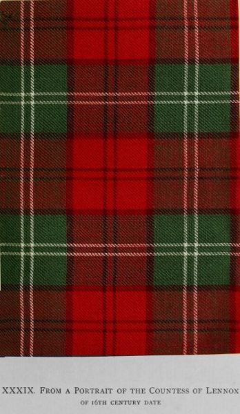 The accompanying illustration reproduces a tartan depicted in a sixteenth century painting which existed in Paris between forty and fifty years ago, and was known as a portrait of the Countess of Lennox, mother of Lord Darnley. Two copies of the work are extant. One owned by the family of the late Mr Charles Elphinstone Dalrymple has been kindly lent for the purposes of this volume. The other is in the collection of Mr Henry Burnley Heath, Italian Consul General, London. Mr Heath writes that he searched in vain for the original in Paris some years back; and subsequent inquiries have also failed to trace it. It is suggested by him that the painting may be a portrait of Queen Mary in the tartan of the Lennox district, to which Darnley belonged. Mr Elphinstone Dalrymple, an authority on portraiture careful as eminent, believed in the authenticity and age of the work; but, unfortunately, his papers contain few notes concerning it or its history. It is to be hoped the whereabouts of this interesting portrait may still be ascertained, especially as it is deemed the earliest coloured representation of tartan dress.