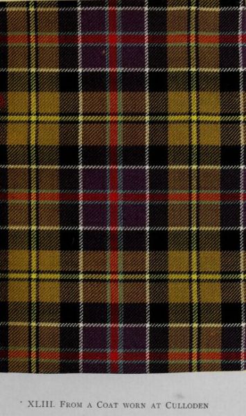 The fragments employed in the preparation of this illustration are portions of a plaid worn by Prince Charles Edward during his brief sojourn in Edinburgh in 1745. On his departure he presented the garment to Susanna, Countess of Eglinton, a belle of the day, at whose house in the Canongate he was a frequent visitor. Divided by her among her seven daughters, a portion was given by one of them—Lady Frances Montgomerie—to her grand-niece, the late Mrs Erskine of Torrie, who bequeathed it to the Rev. Henry Bruce, Dunimarle. Mr Bruce mentions that Mrs Erskine, who assured him of the genuineness of the relic, spoke of Lady Frances as having often conversed with the Prince. Well-nigh a century back the tartan was cut up for slippers by the daughters of Sir William Erskine of Torrie. It was thus greatly mutilated, but enough remained intact to permit the rendering of the design here given. Sir Arthur Halkett, Bart., in whose collection are some small pieces of the plaid, lent these to ensure the reproduction of the precise tints of the original.