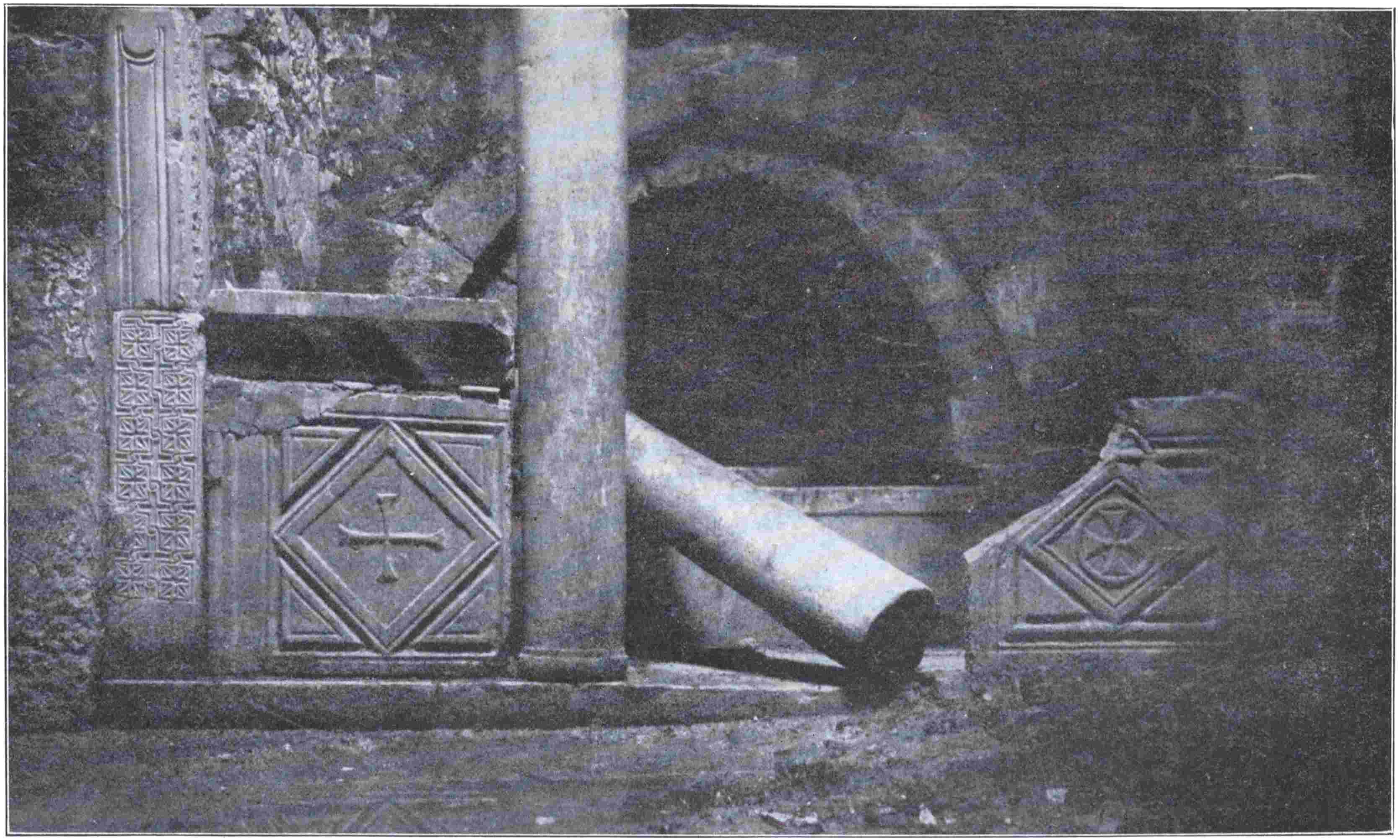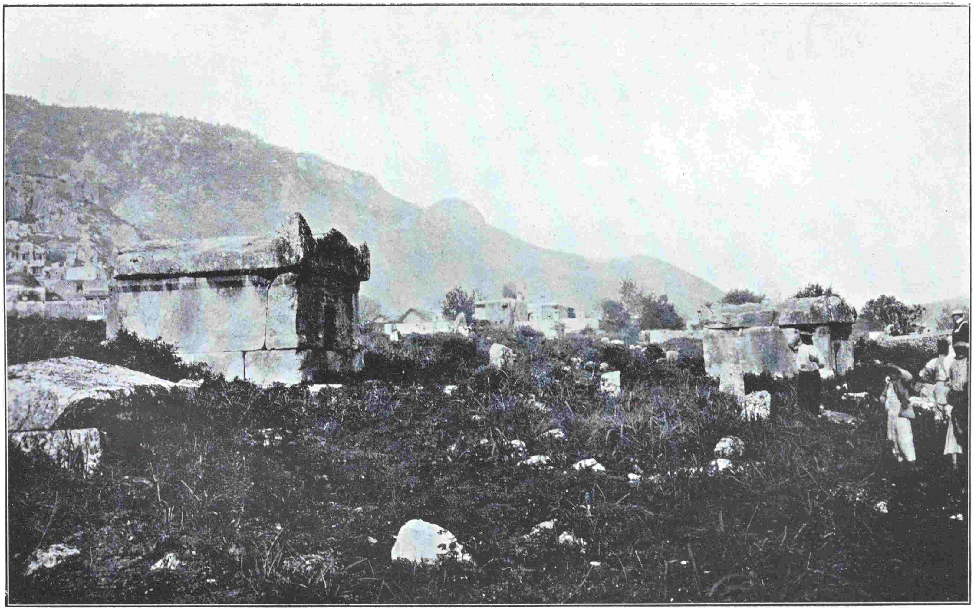 But here, as elsewhere, we scanned the few bare spaces in vain for potsherds of early style. Thick layers of late ruin and silt lie over them, and the three-foot corn-stalks stand above all. Only one noteworthy marble appeared on the surface, a pedestal with four reliefs, described by James Hamilton and other travellers. It is of fair workmanship, and inscribed with a greatly perished dedication not earlier than the age of the later Ptolemies. In the hollow between the two halves of the city, and over a wide area outside the walls, both south and north, innumerable dressed blocks stand upright, one behind another. With a field-glass one may see these puzzling files radiating from the city far out over the lower plain, ranged seemingly at random, as a baby might set toy bricks on end. I guessed at first they might be unwritten head-stones133 of poor graves; but, seeing they occurred within the walls, and mostly in the lower lying places—for instance, about the upper part of the central hollow, below the vaulted reservoirs—I came to suspect they had once carried wooden pipes, which distributed the Apollo waters over the lower plain and the contents of the reservoirs to a part of the upper city; and I still can find no better reading of their riddle.