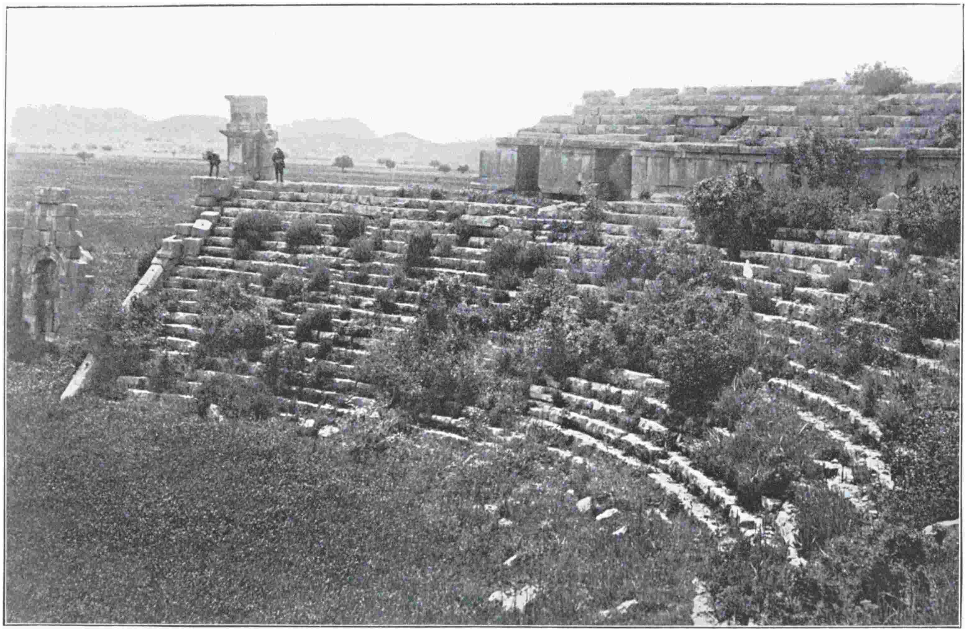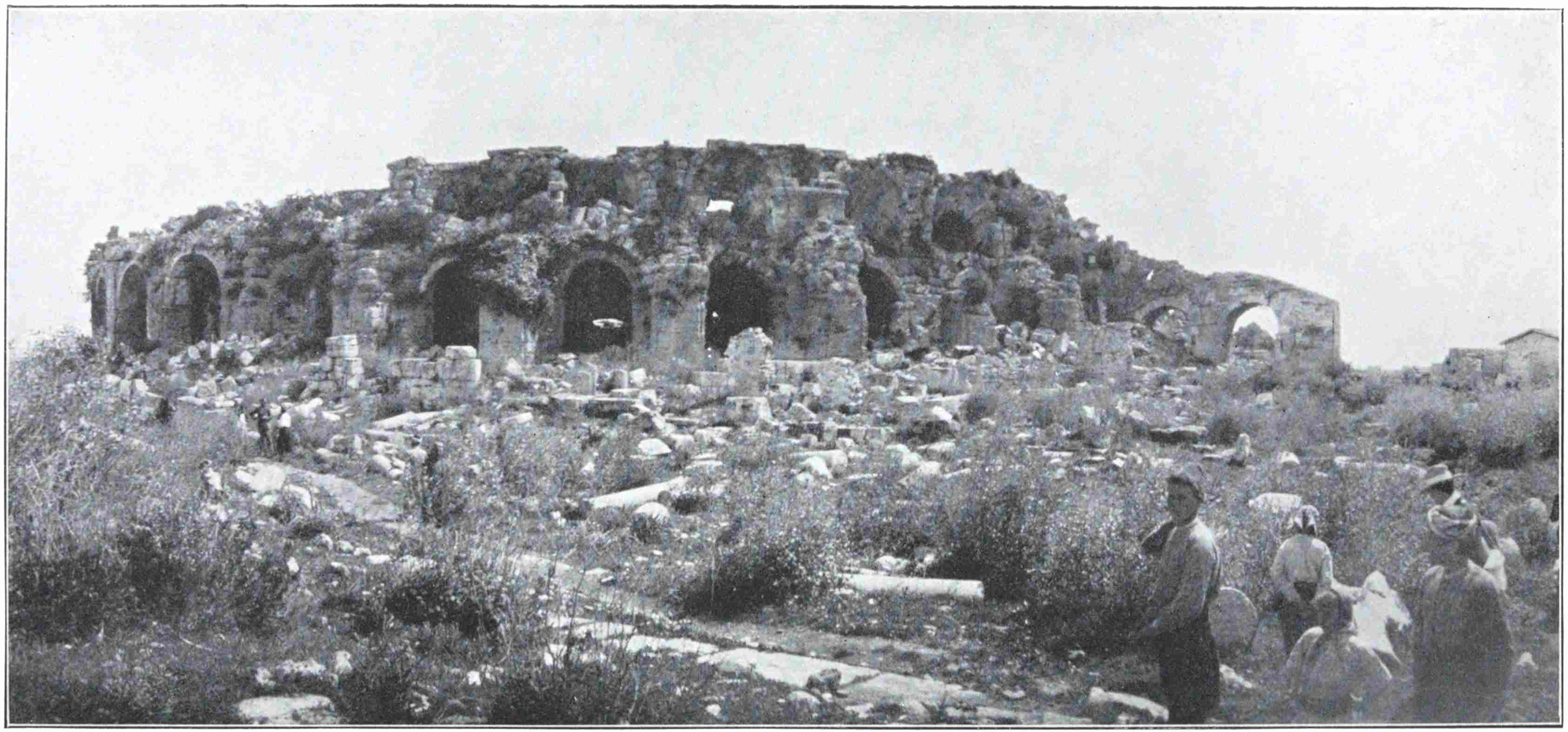 You may have seen amphitheatres in Italy, France, Dalmatia and Africa; temples in Egypt and Greece; palaces in Crete; you may be sated with antiquity, or scornful of it. But you have not seen the Theatre of Aspendus. It has at once the grandeur of scale which excites fancy, and that perfection in survival which, lulling the sense of strangeness, allows fancy to leap unastonished across119 the centuries. In every other Roman theatre, which I have seen, some part of the cavea is perished, the uppermost tiers at any rate being merged so irregularly into the hillside that one may hardly know where seats end and naked rock begins; or else jungle intrudes on the auditorium, and the scena wall, even if so perfect as at Orange, stands a dreary skeleton, with not only its marble statues lost, but all marble mouldings and casing whatsoever. Thus, whether one look up or down, all illusion that the building might still serve its first purpose, is cheated. But at Aspendus, not only is every bench in its place and perfect, but the cavea is still crowned with the original arcade which served as a finish and coping to the whole. Vegetation has hardly been able to take root in the close joints of the masonry, and the ancient drains and gutters, which are still serviceable, have suffered little silt to settle in the orchestra. From the stage buildings little is missing, and from the scena wall nothing, except the contents of the niches. All stones are still square and sharp, and the courses are true as if laid yesterday. The whole building, moreover, is of gigantic size, erected not at divers epochs by the city, but all at once by the pious munificence of one wealthy individual, desirous to outdo all other citizens of the Empire in gratitude for the victorious return of Lucius Verus from the East; and under the inscription by which this his act is recorded for all time to come, one enters the main portal to right of the stage. A taciturn officer of the Adalia police, who had ridden up with us, stood stock still a moment under this great doorway, and then went off by himself, looking curiously at every part of the corridors, stage and seats. At last he came back, accepted a cigarette,120 and stared slowly round the great horseshoe. “What sort of men,” he asked, “were here before us? No Osmanli built this.”