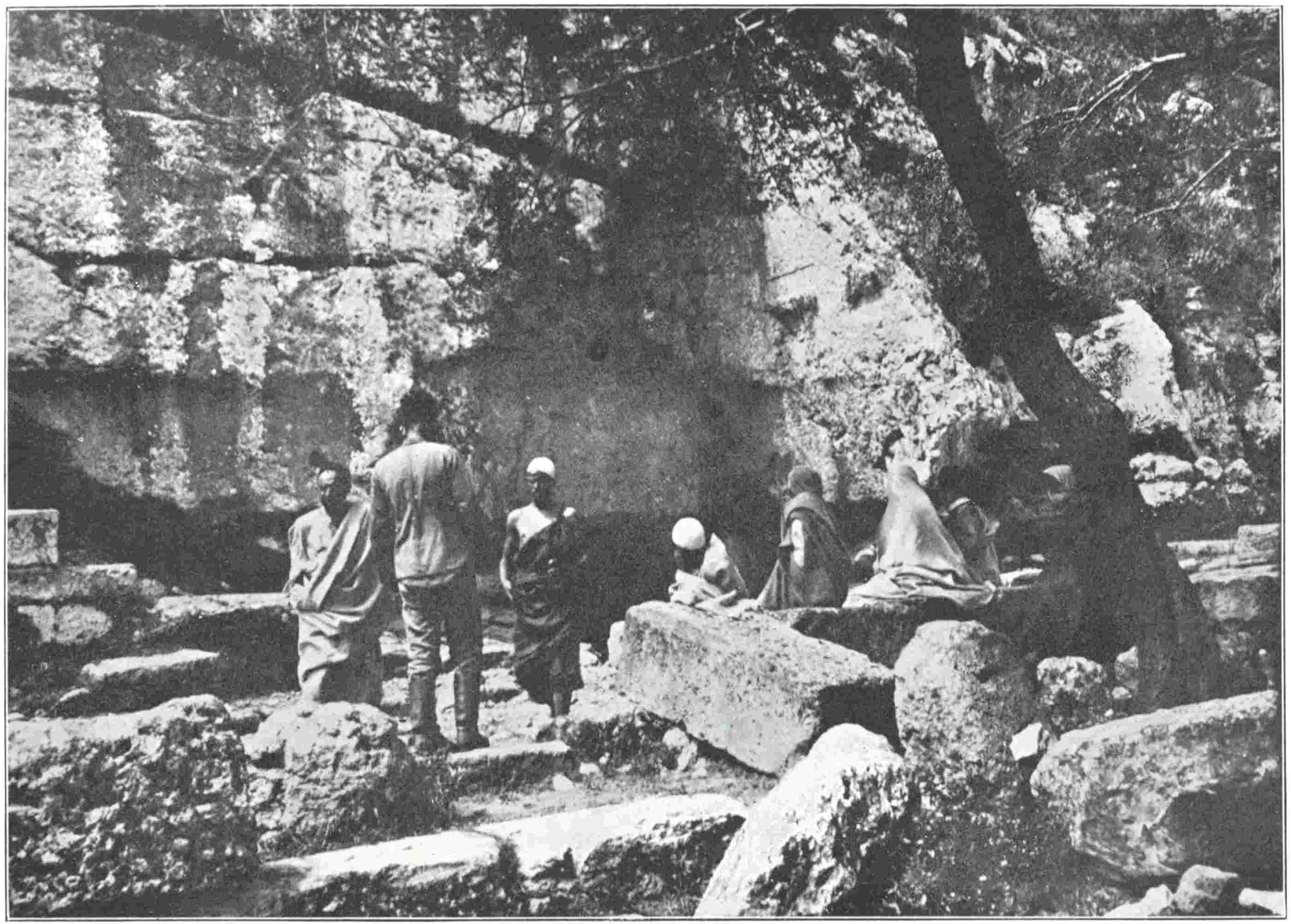 Our walk brought us at last to the Apollo fountain, the cause and centre of Cyrenian life. The cliff, from whose foot its stream flows forth, has been cut back and scarped. A gable-mark some twenty feet up its face bears witness that a portico once shadowed the basin, and a rock-inscription on the short returning face records its restoration in the early Imperial age. The stream can be followed upwards for some distance into the rock, if one cares to crawl among stalagmites; but the tunnel has narrowed since former days. The Bedawis say the water is each year less. As we drank of it and bathed our tired feet, we found it cool, not cold, and even on an April morning, in scirocco weather, only a few degrees below the air. Two or three Bedawis, who were washing their cotton garments, withdrew at our approach, and no women were visible. Other Bedawis, armed with long guns or spears and driving laden beasts, were passing to and fro on the path of the Senussi convent, the focus of modern Cyrene, which has created a broad belt of garden ground, frayed out over the lower plain.