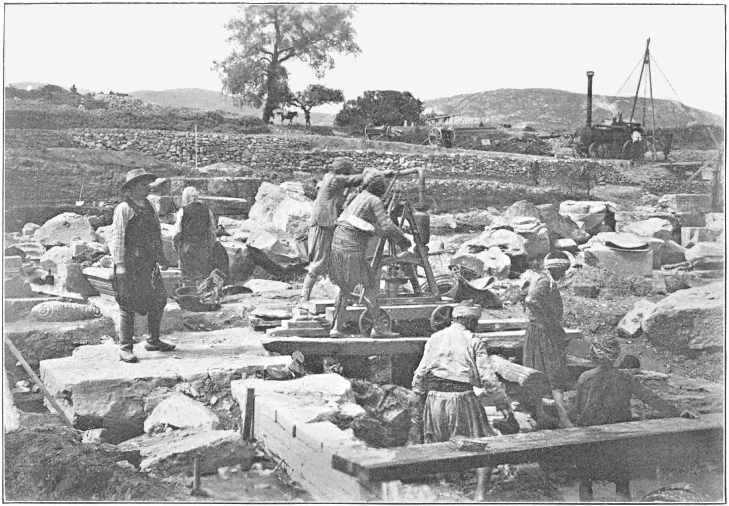 The site looked then as hopeless as an ancient site can look—an immense water-logged pit choked with a tangled brake of thorns and reeds; and when axe and billhook and fire had cleared the jungle, it looked, if possible, more hopeless still. The shallow surface waters, however, when no longer sheltered by leafy canopies, dried quickly under the early October sun, and144 I got to work with little delay on the platform of the temple which King Croesus had helped to build. A hundred men were enrolled, and every local means of carriage was pressed into their service. I got mule-carts and horse-carts, asses with panniers and asses with sacks, barrows and close-woven country baskets to be borne by boys. A central way was cut through the hillocks of marble, and from right and left of it broken stuff was sent up the ramps to dumping-grounds on the plain. But we were only reopening an earlier explorer’s clearance, and could hope for little strange or new among his leavings. Not twice in a ten hour day did a scrap of carved or written stone, unseen or unsaved by Wood, reward our painful levering of tumbled blocks and sifting of stony soil. A common ganger with a hundred unskilled navvies could have served science as well as we.