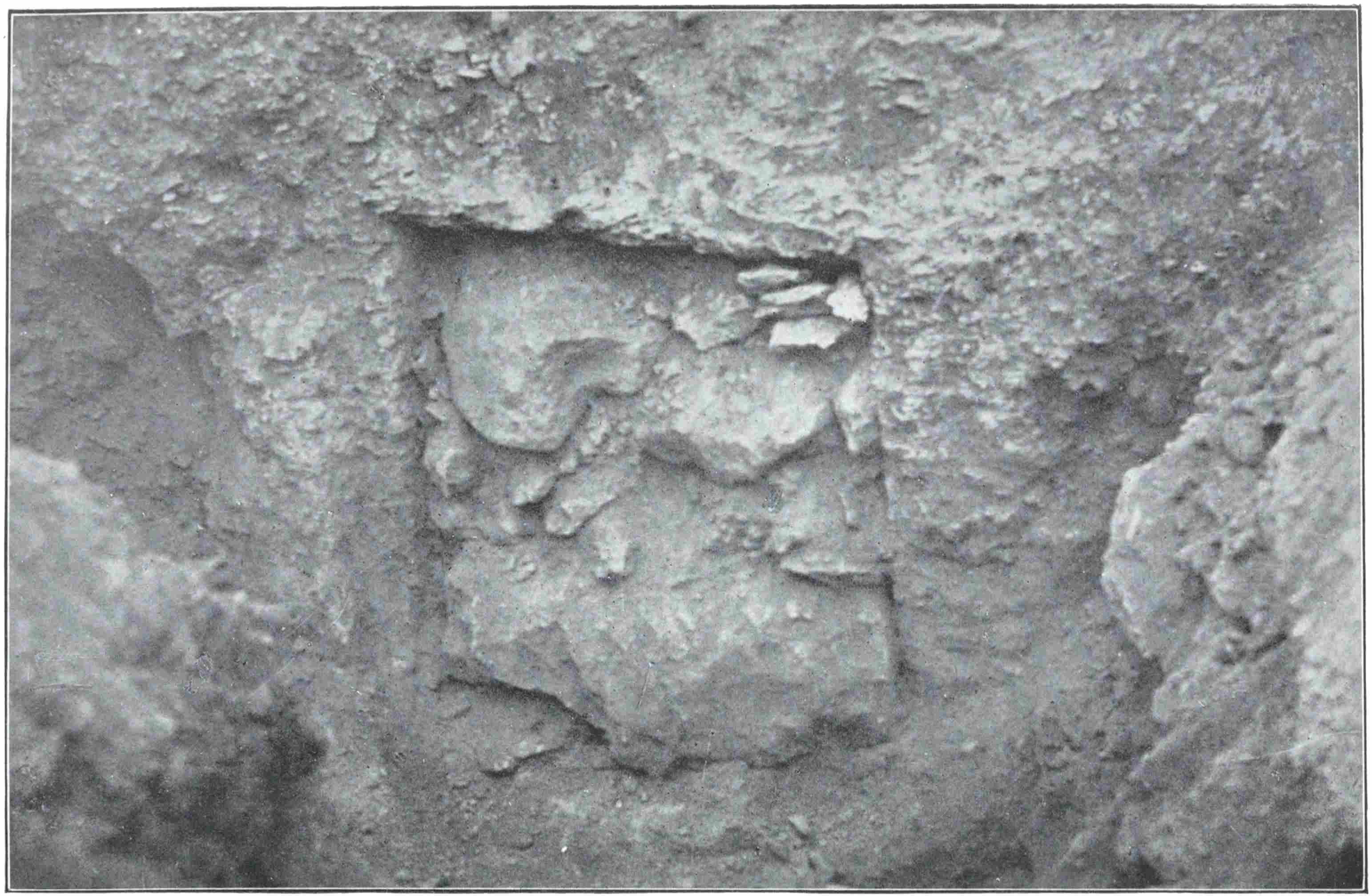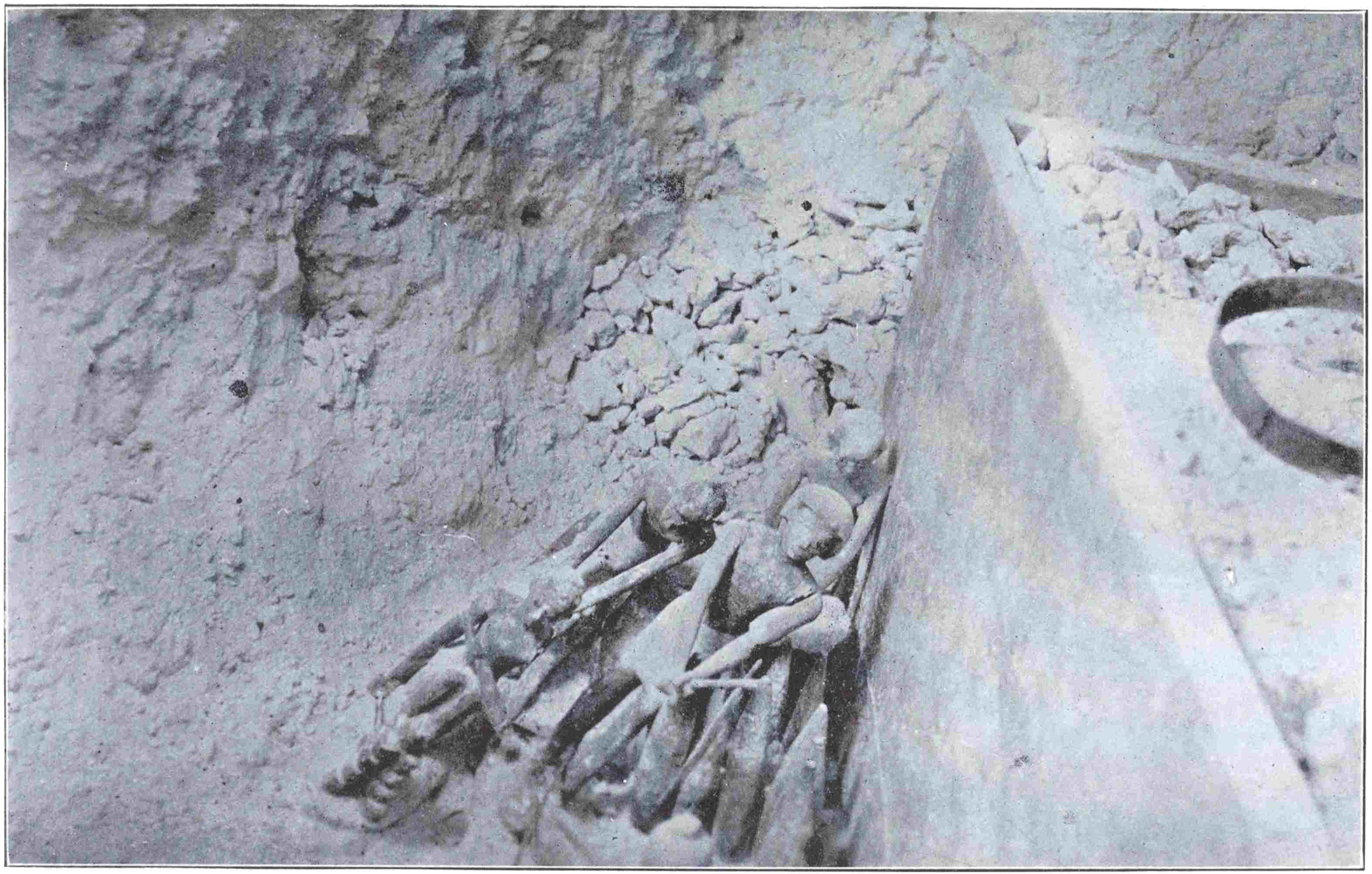 The most bitter disappointment was caused by a great collapsed grotto through whose choked portal we had quarried our way to find the central grave-pit still covered with its lid of ancient palm-trunks. We lifted these and dug into the clean chips below with ever brighter hopes; for the shaft was so virgin that the white dust made by the original chiselling hung still on its walls. Down and down the men delved, keen as their masters, and for five-and-twenty feet into the depths of the hill the filling was pure of all sign of disturbance. Then at last the chamber appeared, doorless, pure and empty as the shaft. The tomb had never been used for burial at all.