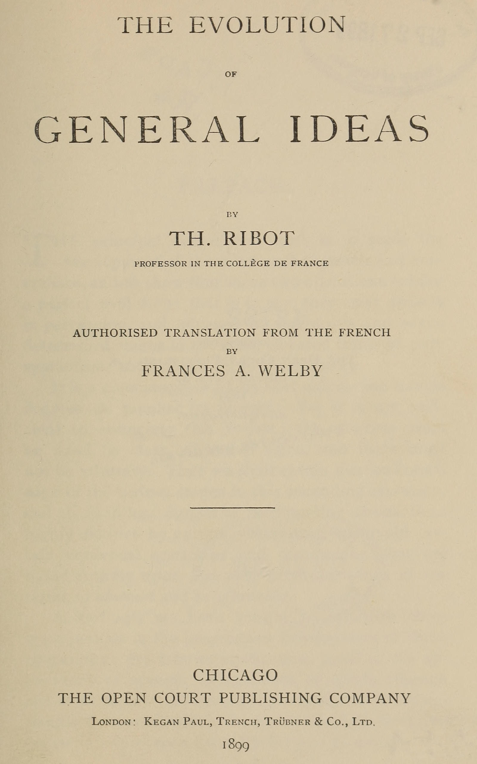 THE EVOLUTION OF GENERAL IDEAS. By Prof. Th. Ribot. Pages, 231. Cloth, $1.25. (6s. 6d.)