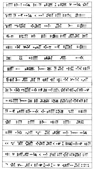 Colophon of a tablet from the Palace Library of Ashur-bani-pal containing incantations in the Sumerian language, with interlinear translations in Assyrian. For an English rendering see following page. From Rawlinson, Cuneiform Inscriptions of Western Asia, Vol. IV, Plate VI, col. 6 (K. 4870).