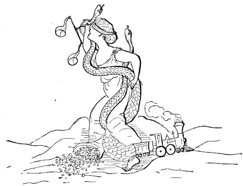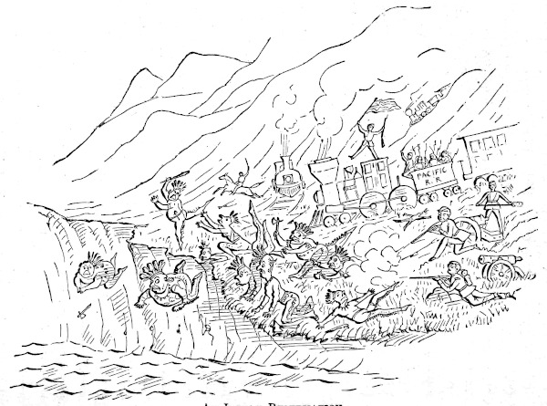 We also take for granted, that the railway system of the United States will be wonderfully simplified. 546We now make it a matter of boasting that since the beginning of our railways, in 1829, we have extended them until, in forty years, they have reached a length of 38,500 miles, or a circuit around the earth one and a half times; costing in their construction and equipment $1,700,000,000, or a sum equal to two thirds of the debt of the United States; employing 8,000 engines and 135,000 cars, or enough, if placed side by side, to reach from New York to Chicago, and carrying annually 145,000,000 of passengers, or a number more than four times the whole population, men, women, children, and John Smiths put together. We are jubilant over the completion, in four years, of the Pacific Railroad, 1,900 miles in length, forming a line from New York to San Francisco of 3,353 miles, straining across prairies, chasing off herds of buffalo, spitting Utah with a skewer, climbing the Sierras 8,000 feet high, and levelling the Rocky Mountains with iron maces.