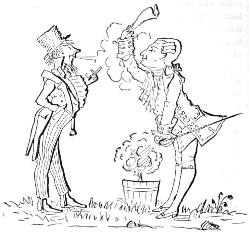| Some American Grounds, like Coffee, unsettled.—Some Settlements pulled up by the Roots; others chilled by Fever and Ague.—Moist Soils objected to except by Doctors.—Unexpected Crops of Tomahawks from Wheat sown.—Settlements in America because of impracticability of making any at Home with Creditors.—Wild Oats sown between 34th and 38th Parallels.—Frequent Settlements make long Friends.—Settlements of Old Tavern Scores in Chalky Districts.—Religious Squalls prostrate some Plantations.—Indian Tempests uproot others.—Growth of Virginia, although Queen Elizabeth a femme sole.—Clergymen’s Settlements.—Brides unsettled.—Drake around the World. | ||