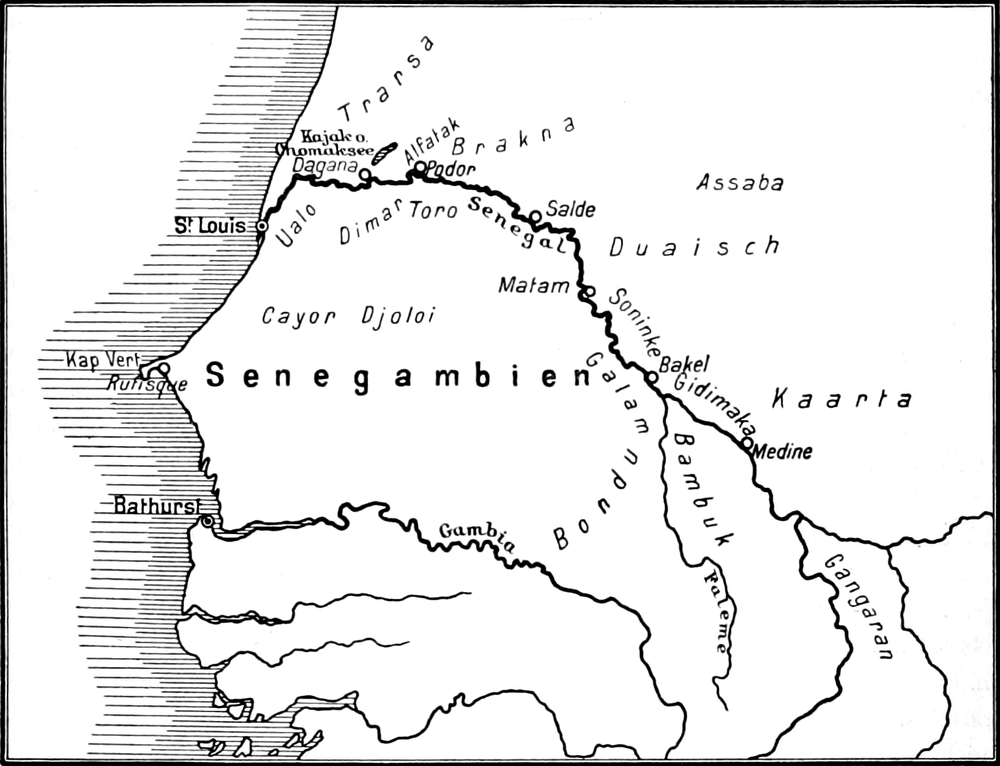In Afrika: Tunis, Algier, Marocco (Mogador, Mazagan), Sierra Leone, Gambia, Kamerun, Senegal (Conakry), Angola, Benguela, Mossamedes, Senegambien (Bissao), Deutsch-Ostafrika, Mozambique, Mombassa, Sansibar, Madagascar, Ägypten (Alexandrien, Cairo), Abyssinien.