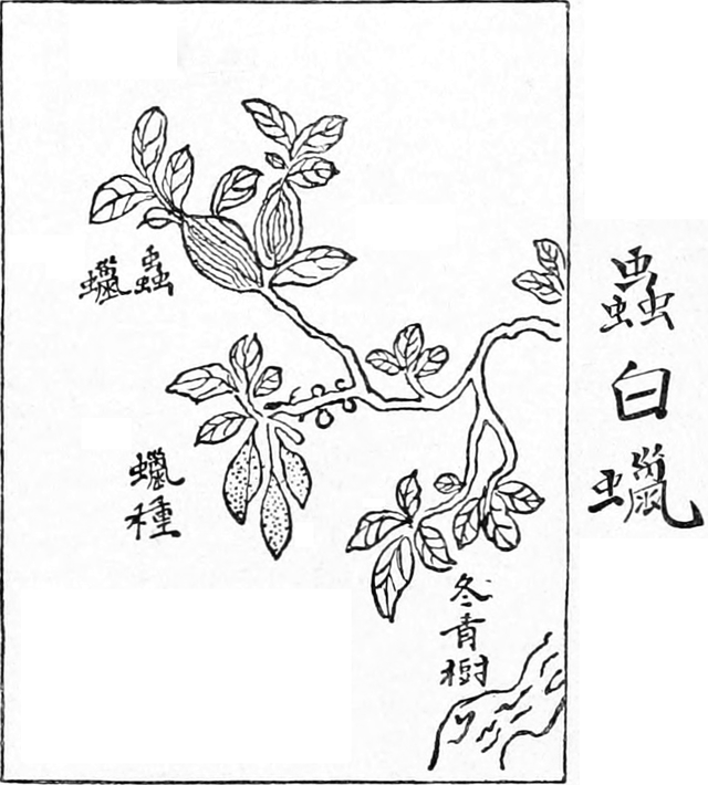 Das chines. Wachs ist das Produkt einer Schildlaus, Coccus ceriferus FABR. (C. pela WESTW., pe-lah chines. = weißes Wachs, C. cereus WALK., Ericerus ceriferus GUER. MÉN., E. pe-la KÜNCK.), die auf verschiedenen Bäumen Chinas, besonders auf Ligustrum lucidum, im Tale Tschien-Tschang lebt. Man überträgt aber das Tier in Schantung, Honan, Tschekiang, Szetschwan, Anhwei auf am Rande der Felder kultivierte, etwa dreijährige Eschen (Fraxinus chinensis ROXB.), löst, sobald die Wachsproduktion ihren Höhepunkt erreicht hat, die Rinde von den Bäumen, erwärmt sie in eisernen Töpfen mit Wasser und schöpft das Wachs ab, das dann umgeschmolzen wird. Hauptproduktionsgegend ist Chiating in der Provinz Szetschwan. Die jährliche Produktion beträgt c. 200000 kg Wachs, früher beträchtlich mehr. Aber die Produktion und der Preis sind seit Einführung des Petroleums stark zurückgegangen. Nur in der Provinz Anhwei und im Distrikt Pochou und der Provinz Tschekiang hat Produktion und Handel mit diesem Wachs nicht merklich abgenommen (1900). Nach der Stadt Kiu-hua wurden 1887 gegen 300 t gebracht (SEMLER). Hauptdistrikte sind die Provinzen Szetschwan, Anhwei und Tschekiang, aber auch in Hainan, Kwangtung, Hunan, Schantung und selbst im Amurgebiet wird Wachs gewonnen.