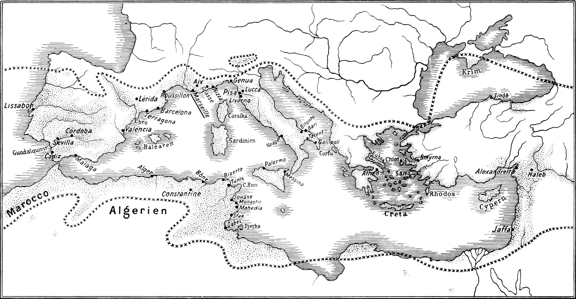Haupthandelsplätze sind Algier, Triest, Wien, Genua, Marseille, Havre, London, Liverpool, Lissabon, Hamburg, Bremen.