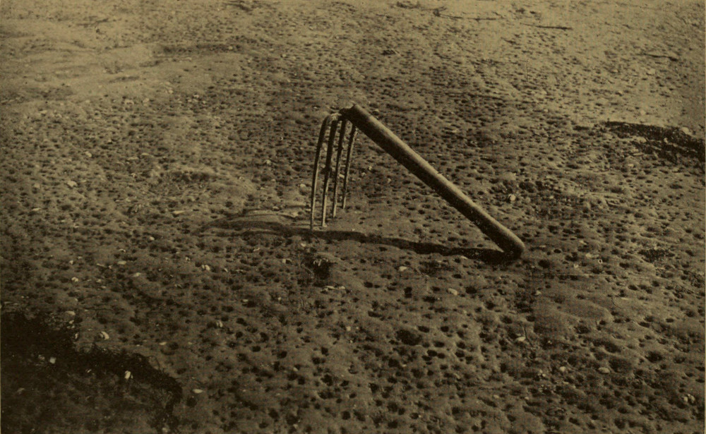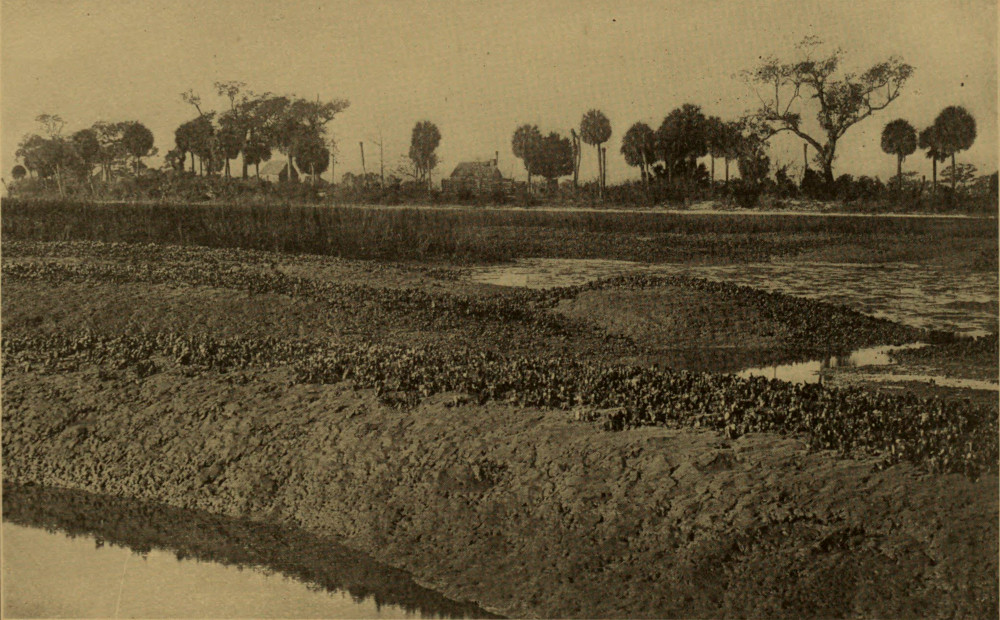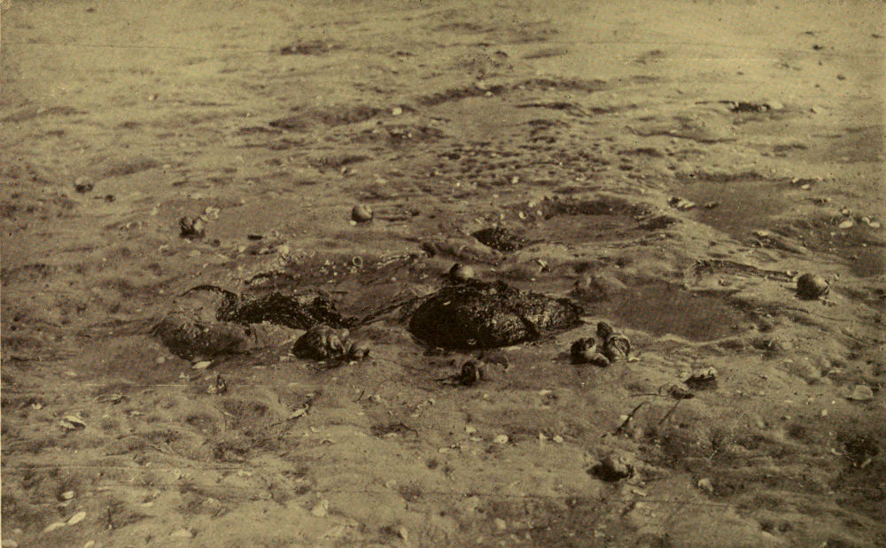 Fig. 1.—Oyster Bank in South Carolina. Showing colonies of “coon” oysters growing in area between tides. Consult Möbius, Dean, and Grave for the ecological conditions of the animals on oyster banks. This is a representative animal community. Photo. by B. Dean, loaned by U. S. Bureau of Fisheries.