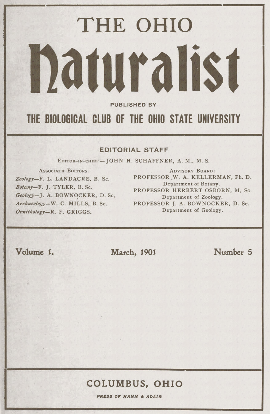 A journal devoted more especially to the natural history of Ohio. The official organ of The Biological Club of the Ohio State University. Published monthly during the academic year, from November to June (8 numbers). Price 50 cents per year, payable in advance. To foreign countries, 75 cents. Single copies 10 cents.