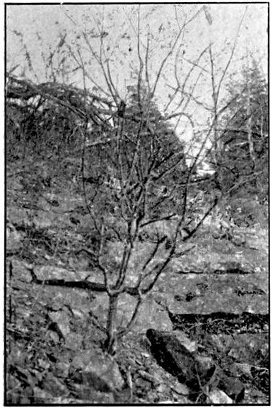 Habitat of Rhamnus Caroliniana.—The manuals give the habitat of this species “in swamps and on low grounds” (Britton), “swamps and river banks” (Gray), “river banks” (Wood), and “fertile soil” (Chapman). It has been previously reported that this species was found in Ohio last November. Several specimens were found near the Ohio river in Adams county at the mouth of Brush creek, and a few were seen in Brown county. In a little ravine on Cedar creek, a tributary of Brush creek, in Adams county, fourteen miles north of the Ohio river, an enormous number of plants were growing. Some were nine to eleven inches in circumference at the base and fourteen feet high. None occurred in “swamps,” though many were in “low grounds” where the soil seemed to be fairly fertile. The majority were on rocky hillsides or quite on the top of very high ground. The annexed cut shows a 77specimen near the top of a rocky bluff or hill perhaps one hundred and fifty feet above the valley at Cedar Mills, Ohio. This southern Buckthorn still retained its shining leaves though my visit was late in November when nearly all the other trees except the oaks were bare. This, with the great quantities of black fruits, presented a charming spectacle. The plant is also reported in Stanley Coulter’s catalogue of Indiana plants, discovered in the southern counties by Mr. W. T. Blatchley, “growing on rocky hillsides.”