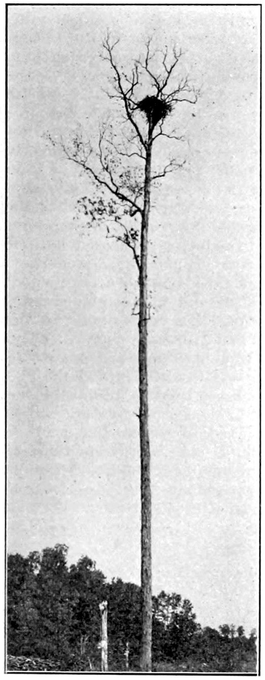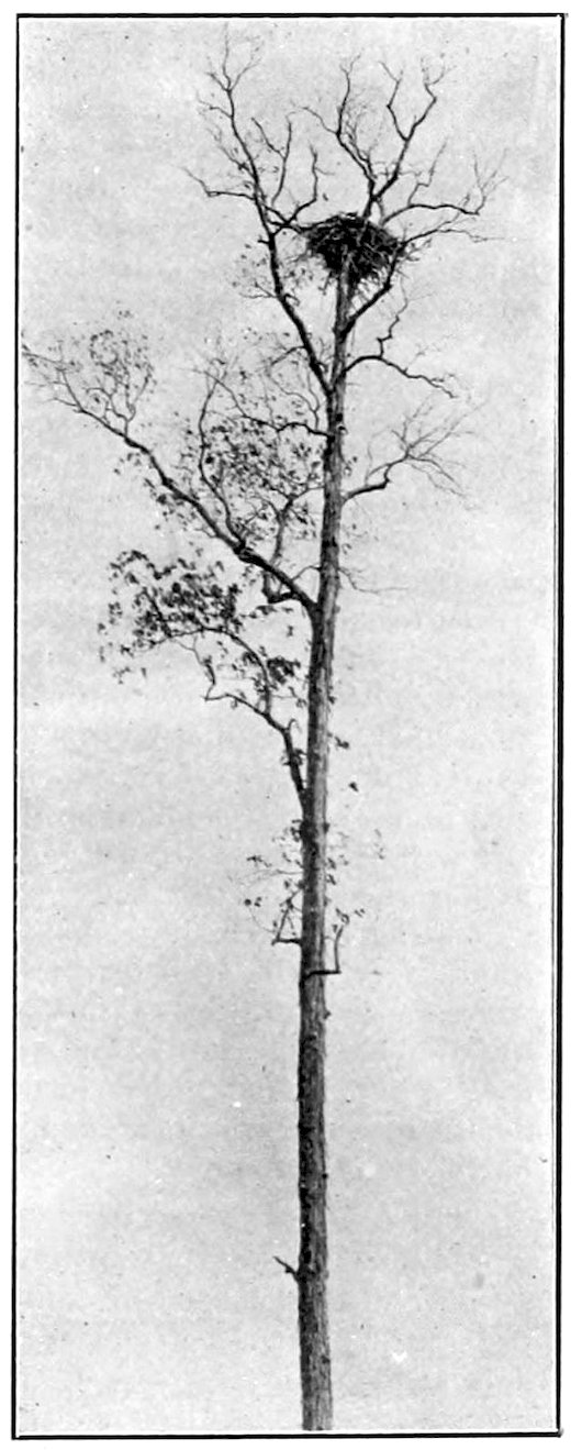 Other nests occur on Kelly’s Island, and we made a trip to that locality for the purpose of noting them and taking photographs, which, however, on account of the day being unfavorable, are not very clear, and cannot be reproduced to advantage. They are about a mile and a half eastward from the steamboat landing, one occurring in a Maple tree about seventy-five feet in height, and the nest at a height of about sixty-five feet, being at least six feet in height, fitting the somewhat acute crotch, and at least five or six feet across the top. The other is in a Burr Oak tree, some distance from other trees, in a vineyard, and plainly to be seen from the lake steamers when to the southeast of the landing. The tree is about a hundred feet high, and the nest is about eighty or eighty-five feet from the ground. It is similar in form to the one just mentioned. Portions can be seen to contain very large branches, which show out conspicuously from the ground.