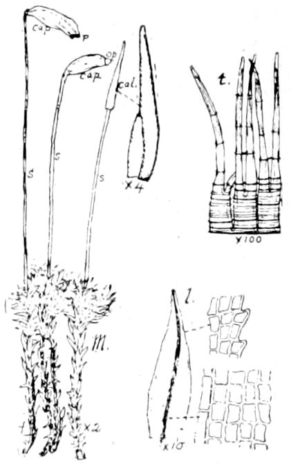 2. Fig. 1.—A common Moss (M) bearing fruit (s and cap.); one capsule is old, one fresh, one immature and covered by the calyptra (cal.); the teeth (t) of the peristome (p), and a leaf (l) magnified, are also shown.