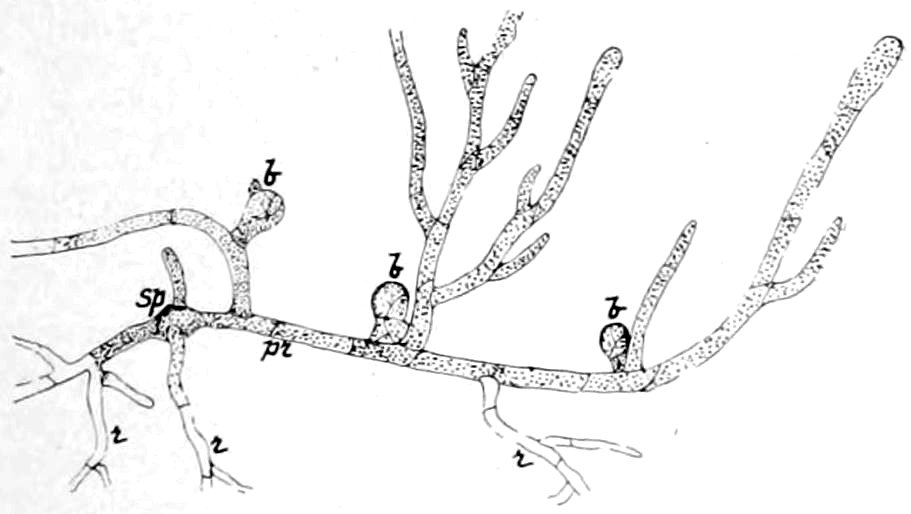 3. Fig. 2.—The growth or protonema (pr.) from the spore (Sp.), having rhizoids (r), and buds (b), from which stems develop.