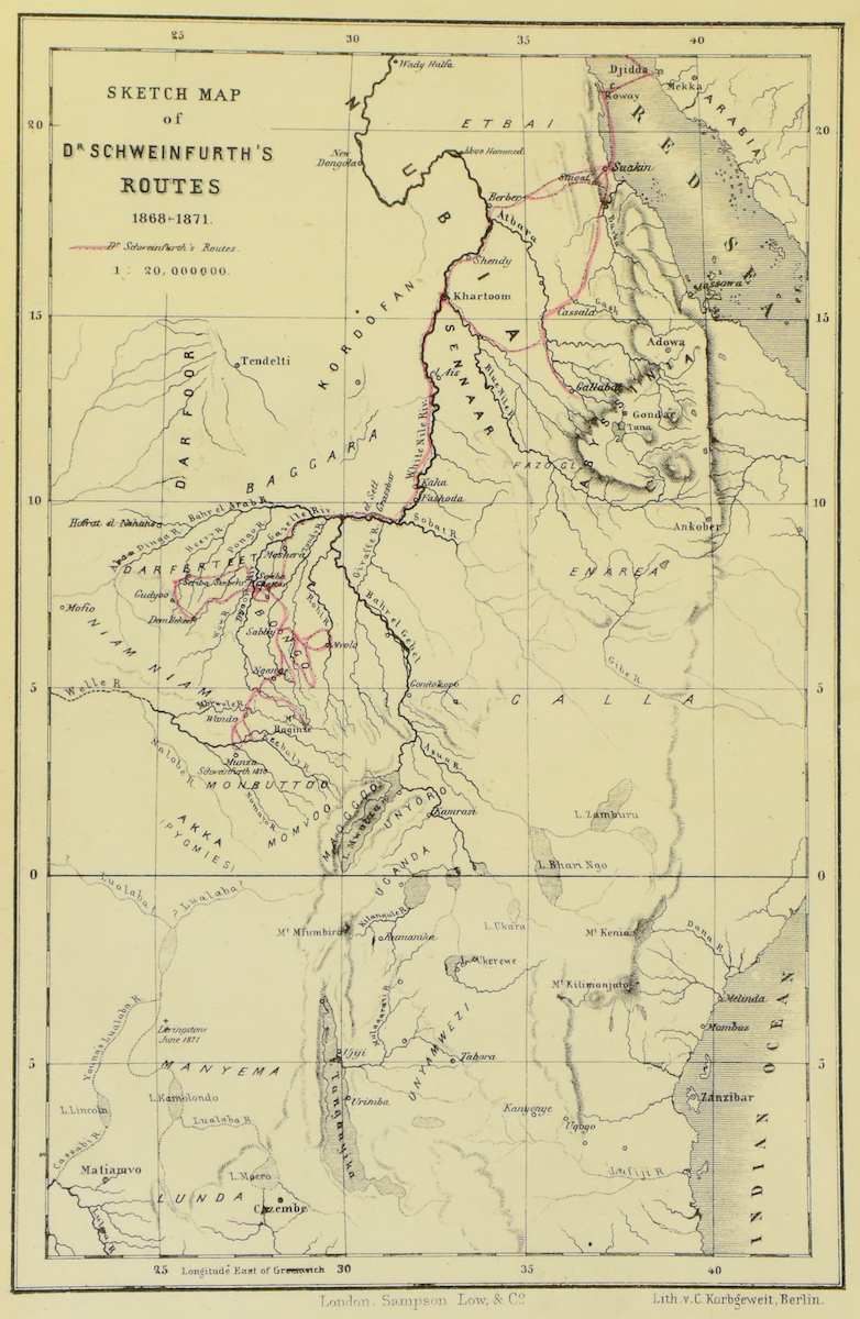 SKETCH MAP OF Dᴿ SCHWEINFURTH’S ROUTES 1868-1871.