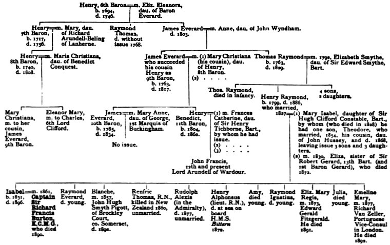 Henry, the sixth Baron, is noteworthy as being the last Lord Arundell of Wardour from whom Isabel was directly descended (see p. 9), and with him our immediate interest in the Arundells of Wardour ceases. Lady Burton was the great-granddaughter of James Everard Arundell, his third and youngest son. Her father, Mr. Henry Raymond Arundell, was twice married. His first wife died within a year of their marriage, leaving one son. Two years later, in 1830, Mr. Henry Arundell married Miss Eliza Gerard, a sister of Sir Robert Gerard of Garswood, who was afterwards created Lord Gerard. The following year, 1831, Isabel, the subject of this memoir, was born.
