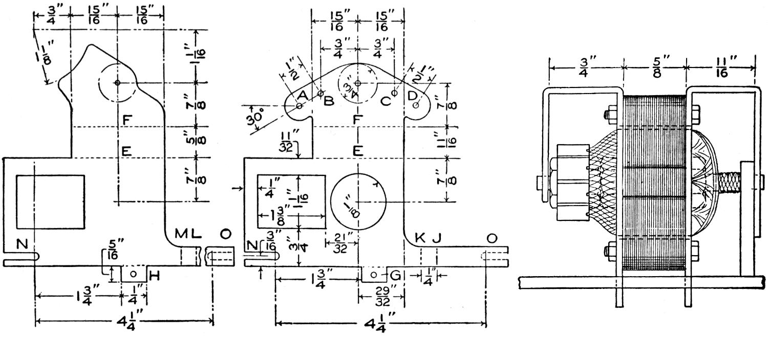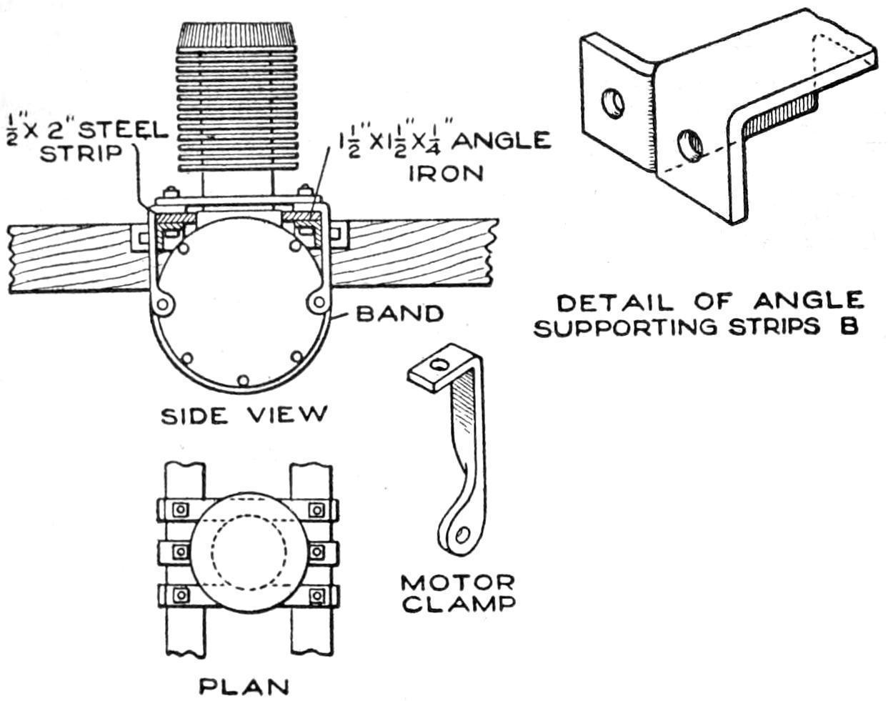 The fitting of the engine may next be undertaken. The exact position and method of setting the engine on the frame will depend on the size and type. It should be placed as near the center as possible, to give proper balance. The drawings show a common air-cooled motor of the one-cylinder type. It is supported, as shown in Figs. 1 and 3 and detailed in Fig. 8. Two iron strips, B, riveted to 1¹⁄₂ by 1¹⁄₂-in. angle irons, extend across the main frame, and support the engine by means of bolts and steel clamps, designed to suit the engine. Cross strips of iron steady the engine, and the clamps are bolted to the crank case. The center clamp is a band that passes under the crank case.
