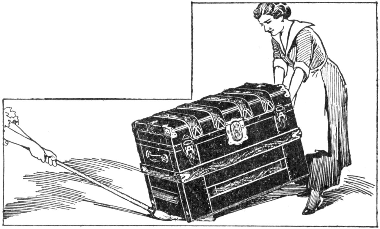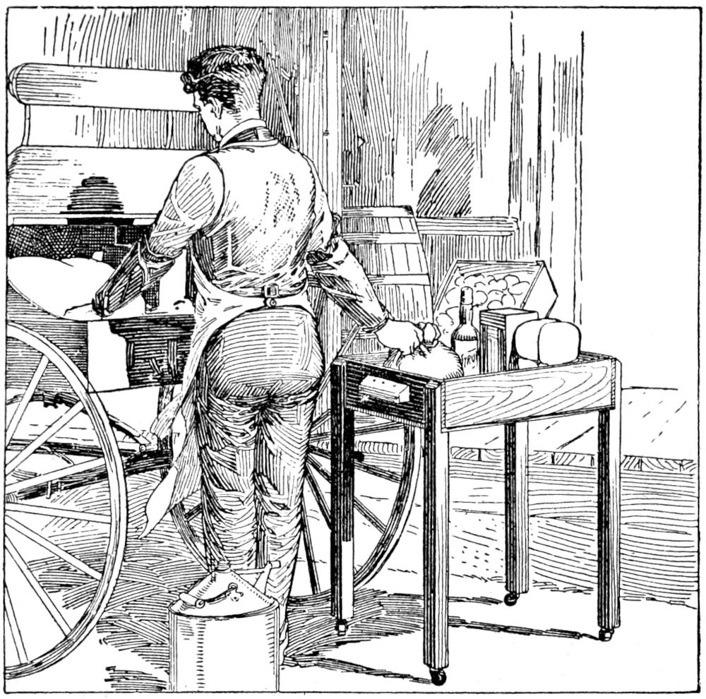 Instead of carrying out an armload, or a boxful, of miscellaneous parcels to the delivery wagon or the customer’s vehicle, an enterprising grocery clerk made a parcel carrier fitted with casters, as shown in the sketch. An ordinary wooden box was used for the tray, and handles were fitted at the ends. The legs were made of light strips nailed as shown. The parcels are loaded into the tray and the arrangement carried or rolled along on the casters, as is convenient. Besides making the work of handling the articles easier, they are kept clean, since it is not necessary to lay them on the walk or other undesirable place.—Avis Gordon Vestal, Chicago, Ill.