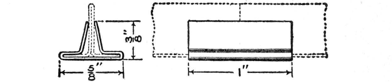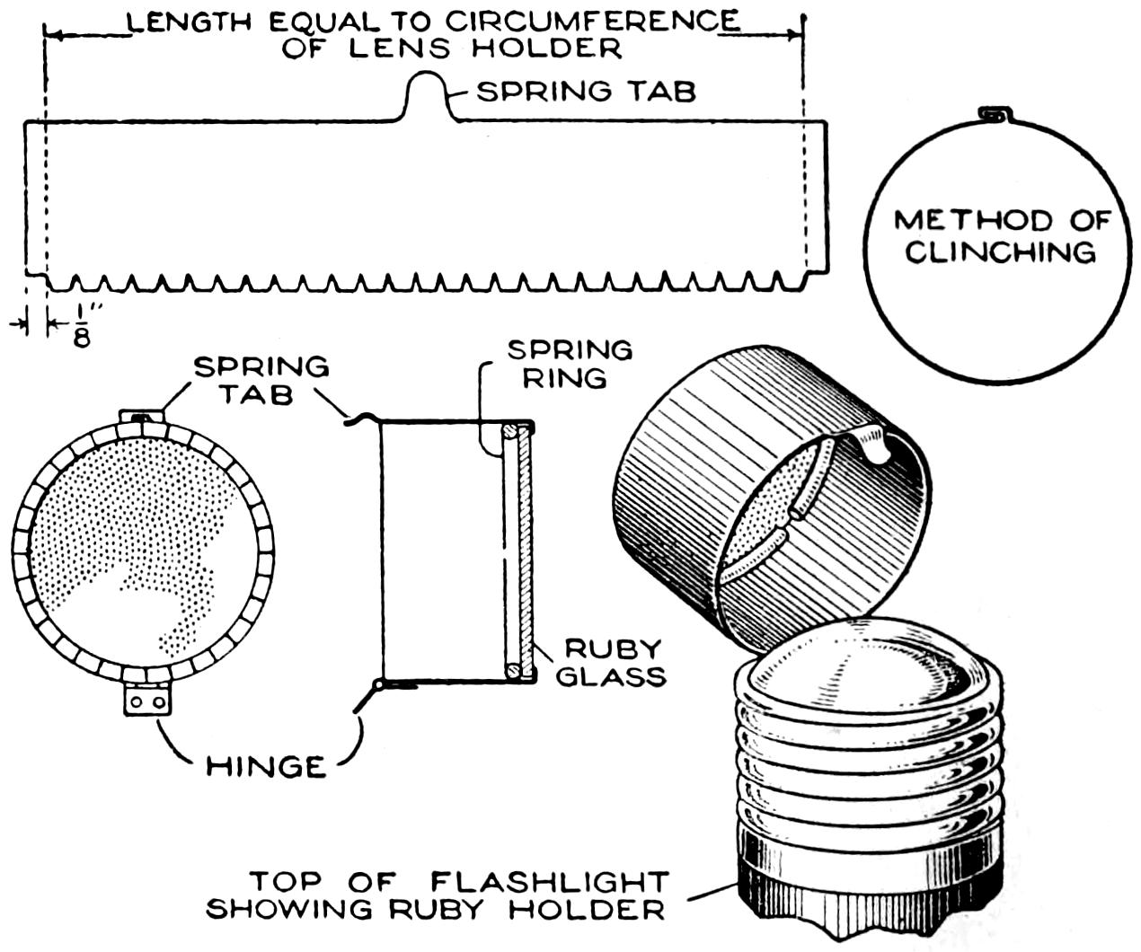 Amateur photographers will find a red lens attachment for a hand flash light a useful arrangement for the dark room, when going in or out, and during the process of developing, especially in temporary quarters. To fit the device in place, measure the distance around the outside of the lens holder, and lay out this dimension on a strip of tin, or other metal, 1 in. wide, as shown. Then add ¹⁄₈ in. at each end, and an extra strip, which should be cut into ¹⁄₄-in. sections, along the whole length. A spring tab, midway along the top edge of the metal, is also made. Curl the piece to a cylindrical form and clinch the joint as detailed, and bend the notched tabs into place. Slip a piece of ruby glass into the cylinder and hold it against the notched tabs with a spring ring. Then solder a small hinge to the edge of the cylinder and to the lens holder on the flash light, so that the spring tab will snap into place. When a white light is wanted, the red-glass fitting is released, as shown.