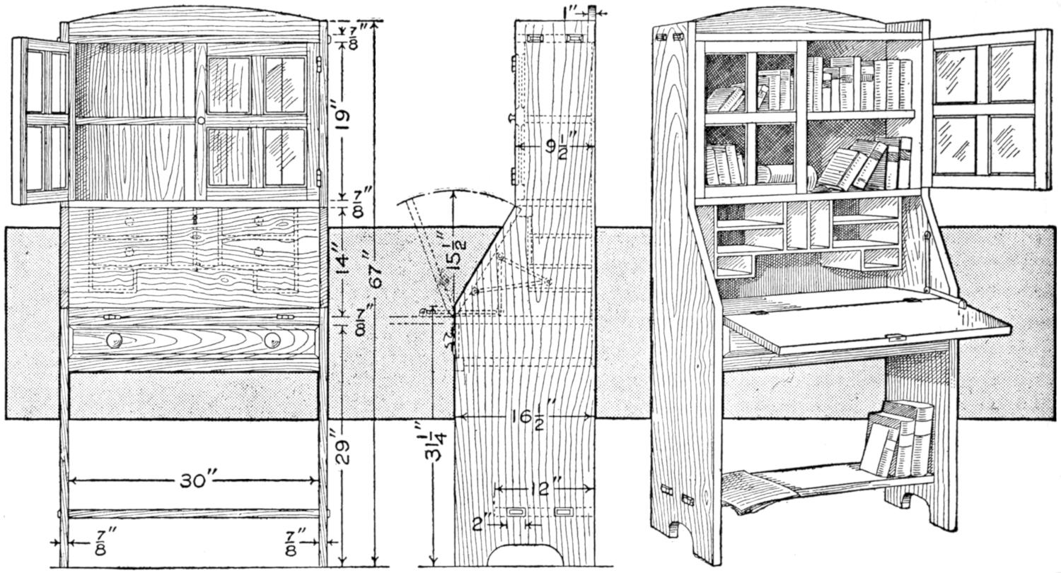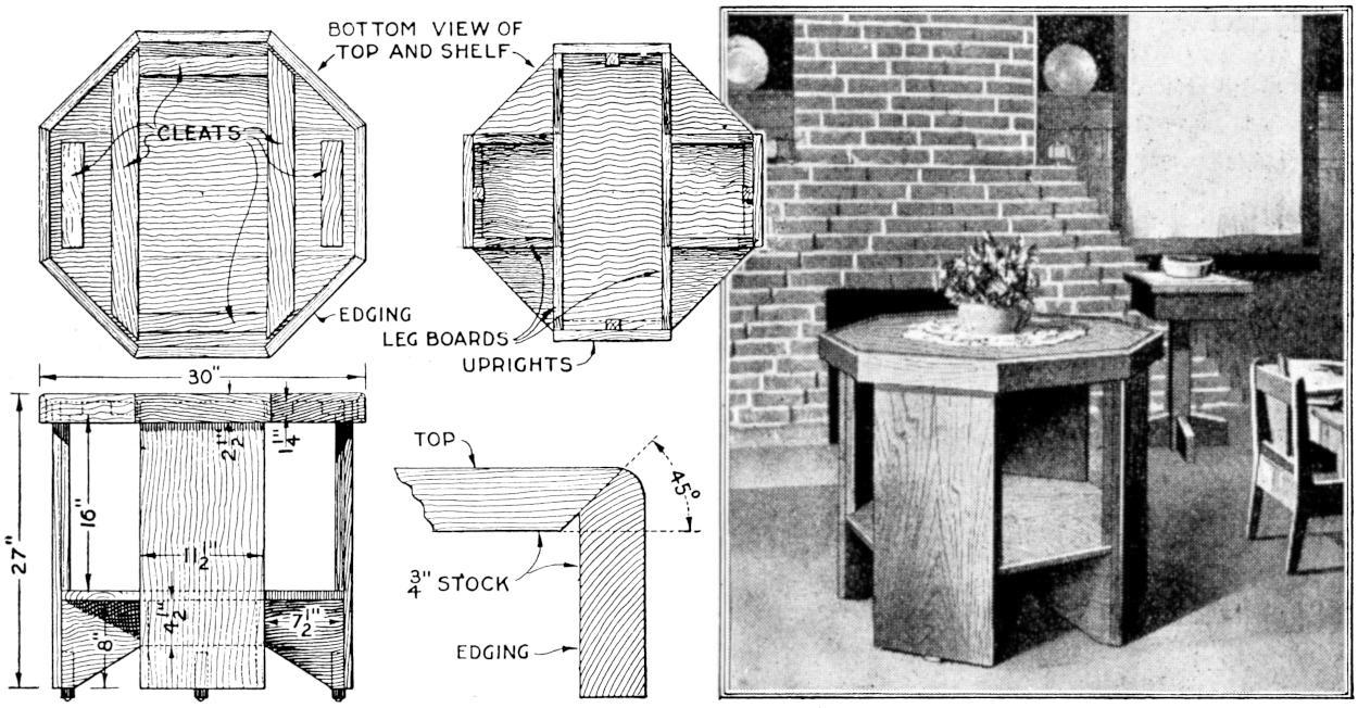 The home craftsman who is fairly skilled with woodworking hand tools will be well repaid for a little extra care in making this mission center table, of unusual design. Most of the woodwork involved in its construction is quite simple, the element calling for careful work being the laying out and shaping of the octagonal top and the shelf. Because of the wide surfaces exposed it will also pay the maker to plane, scrape, and sand down these surfaces carefully. By selecting the best pieces of wood and setting their better sides out, the effect is also enhanced. The table can be finished in a variety of ways to suit the furniture of the room where it is used. Various kinds of hard wood are suitable, quarter-sawed oak being preferable.