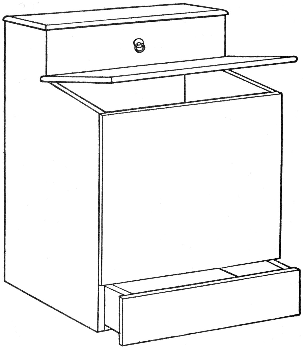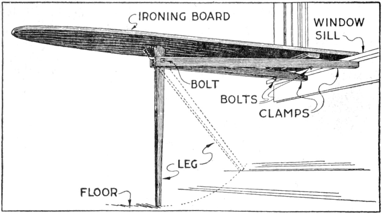 An ironing board is usually most convenient for use when its left end is set near a window, or other source of light. The arrangement shown in the sketch was designed with this in mind, and other interesting features were added. The top is of the usual type. Arranged underneath it is a cross cleat near one end. Bolted through this are two clamps which engage the edge of the window sill or table. They are clamped by lowering the leg from its folded position, underneath the top, as indicated. The bolts at the clamps are adjustable for gripping various thicknesses of table tops, etc., between the clamps and the top. The lower end of the leg can be fitted with a sliding adjustment, if the board is used at different heights, the design being otherwise the same.—T. J. Hubbard, Mendota, Ill.