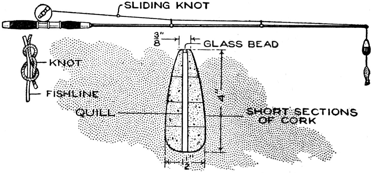 Cork is a good material from which to make the float. Cut the cork in sections, as shown, and fit it over a large quill, which provides a smooth-running hole through the float. Fit a small glass bead in the upper end of the float, as a stop for the knot. The knot is of the figure-eight type, and tied as shown in the detail at the left. It slides easily, but grips the line tightly enough to stop the float. An ordinary float can be altered for use as described.—Charles Carroll, Baltimore, Maryland.