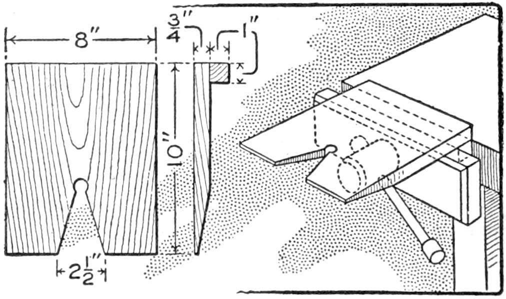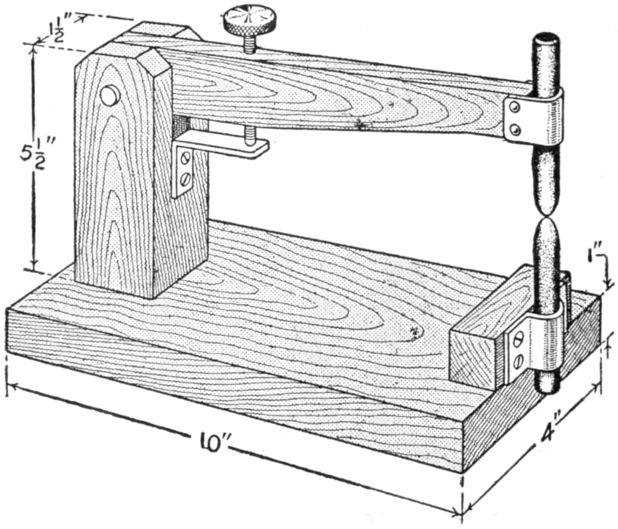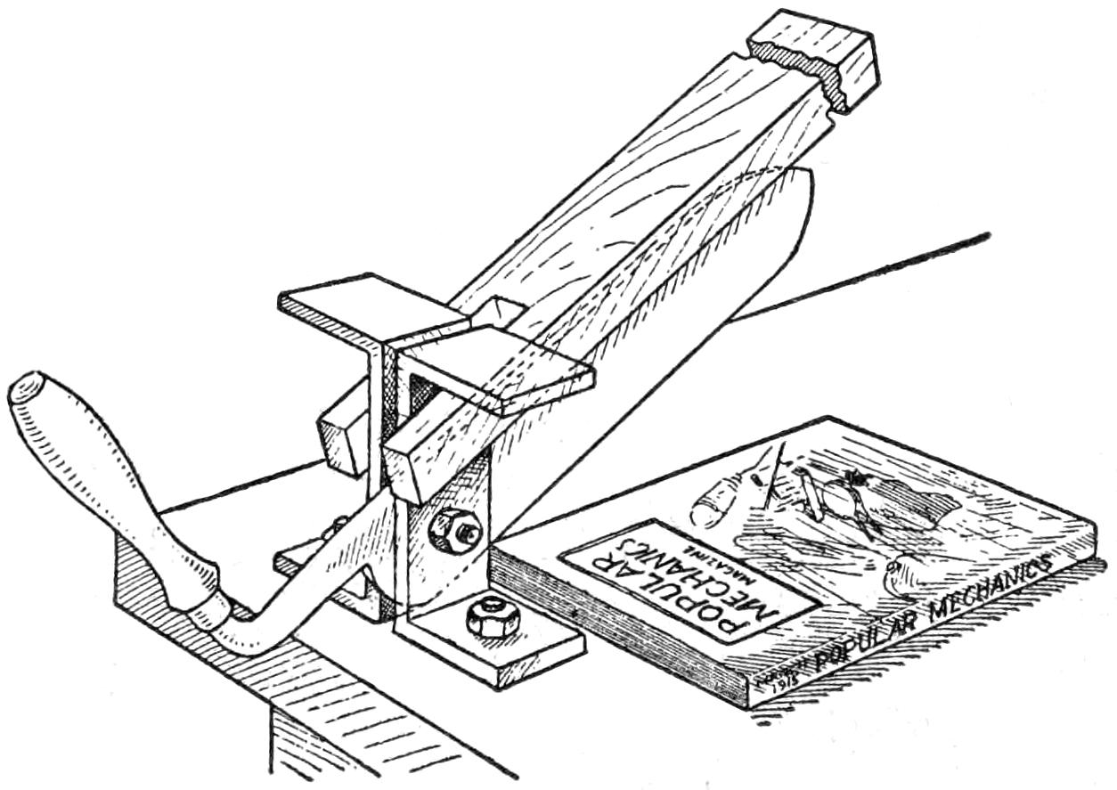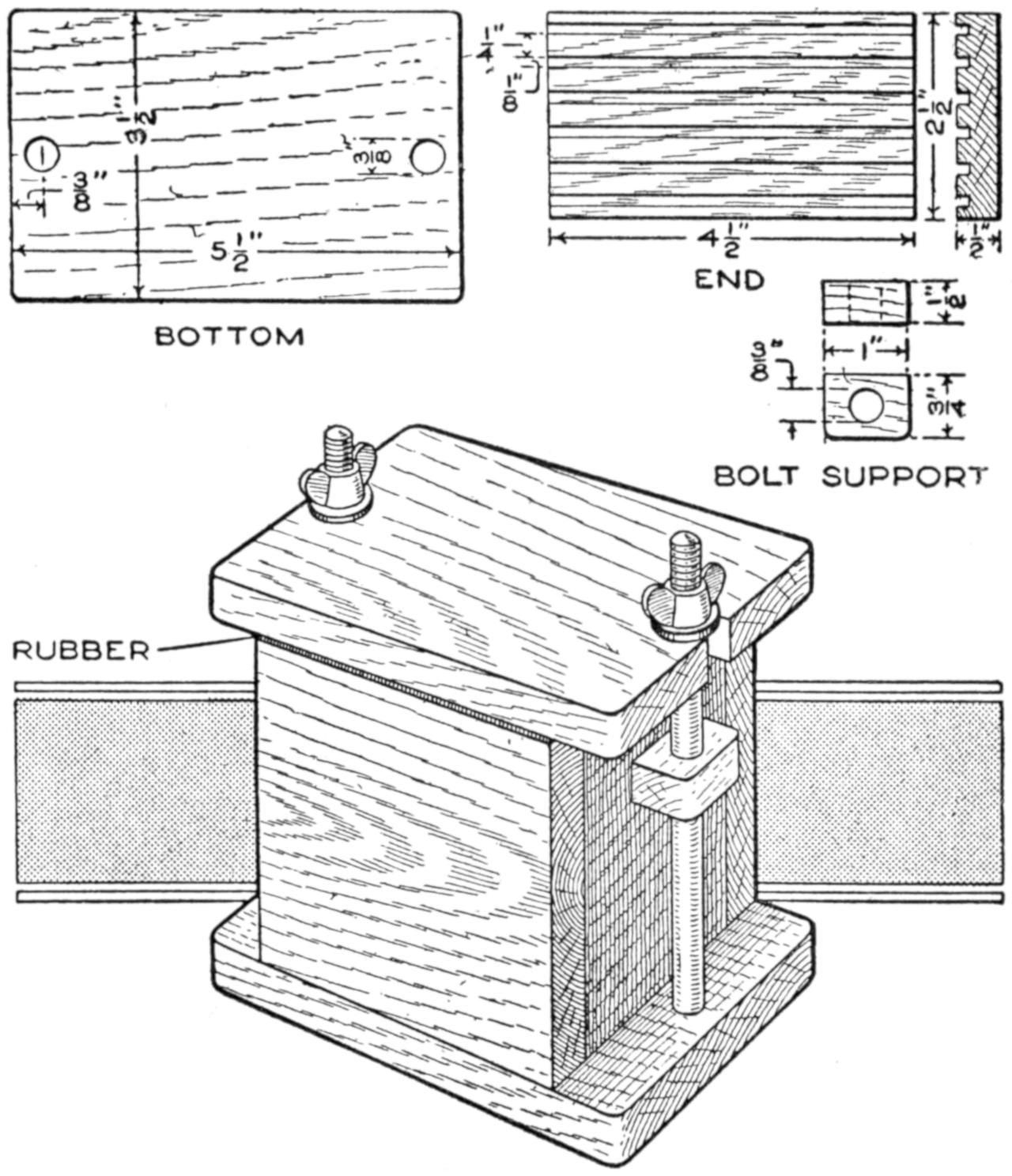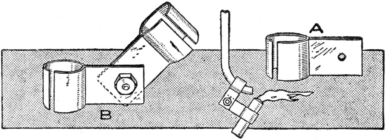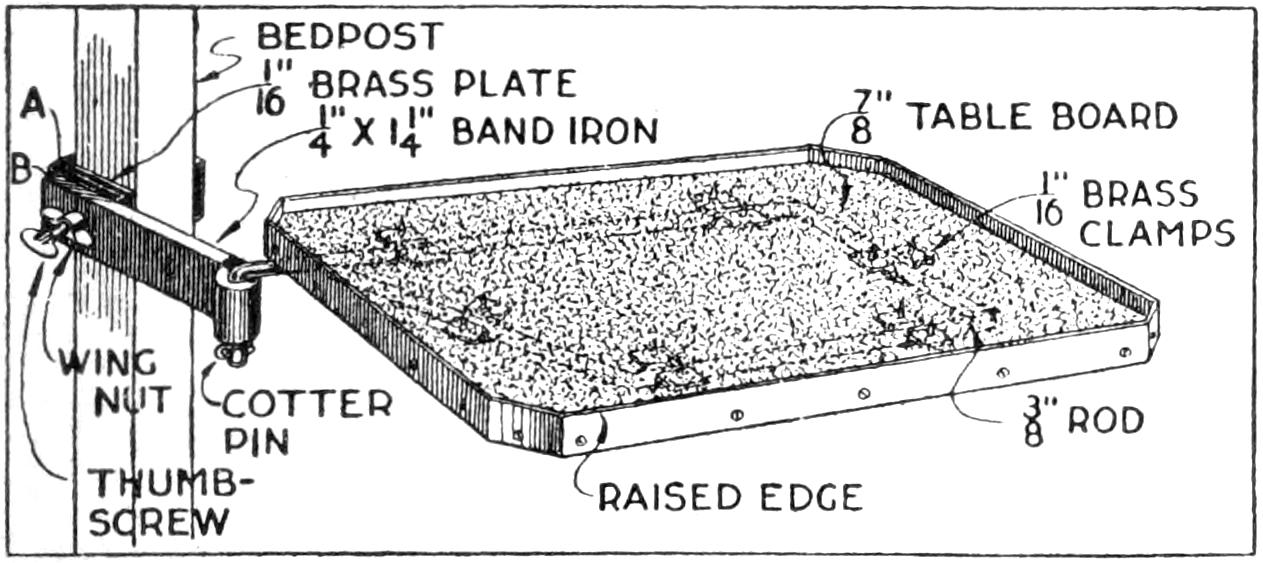 A table arrangement which can be clamped handily to the bedpost and swung out of the way or removed altogether when not in use, is a convenience that has a wide use in the home. A device of this kind, which requires no floor support and can be folded compactly for storage, is shown in the illustration. The table proper consists of a ⁷⁄₈-in. board, of suitable size, the edges of which are banded with metal or thin wooden strips. The board is supported on a frame of iron rod, bent to the form indicated in the dotted lines, and clamped with ¹⁄₁₆-in. brass clamps. The end of this frame rod is bent at an angle and pivoted in a metal bracket. A cotter pin guards against accidental loosening of the joint. The clamping device is made of ¹⁄₄ by 1¹⁄₄-in. band iron, and is bent to fit loosely around the bedpost. A brass plate, A, is fitted inside of the main piece B, as shown. A thumbscrew is threaded into the piece B, its point engaging the brass plate, which acts as a guard. In fastening the piece B on the bedpost, the thumbscrew is set, and the wing nut also tightened.—A. Lavery, Garfield, N. J.