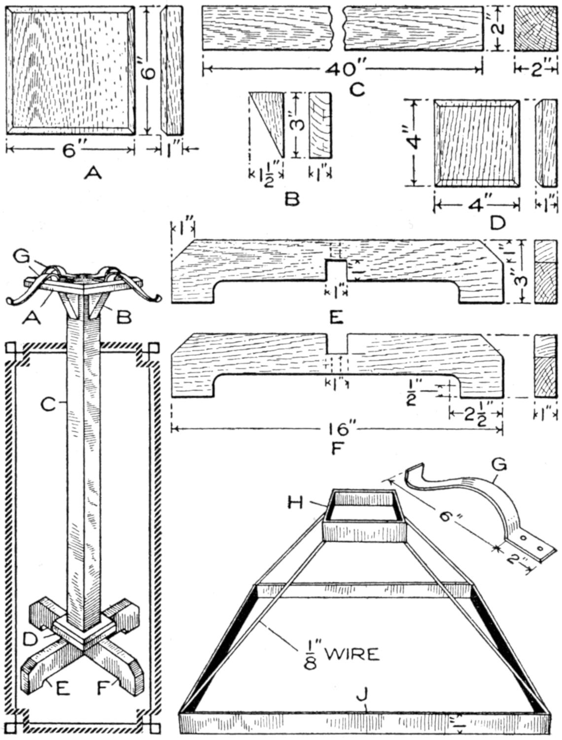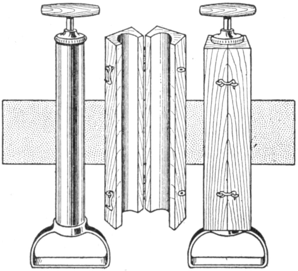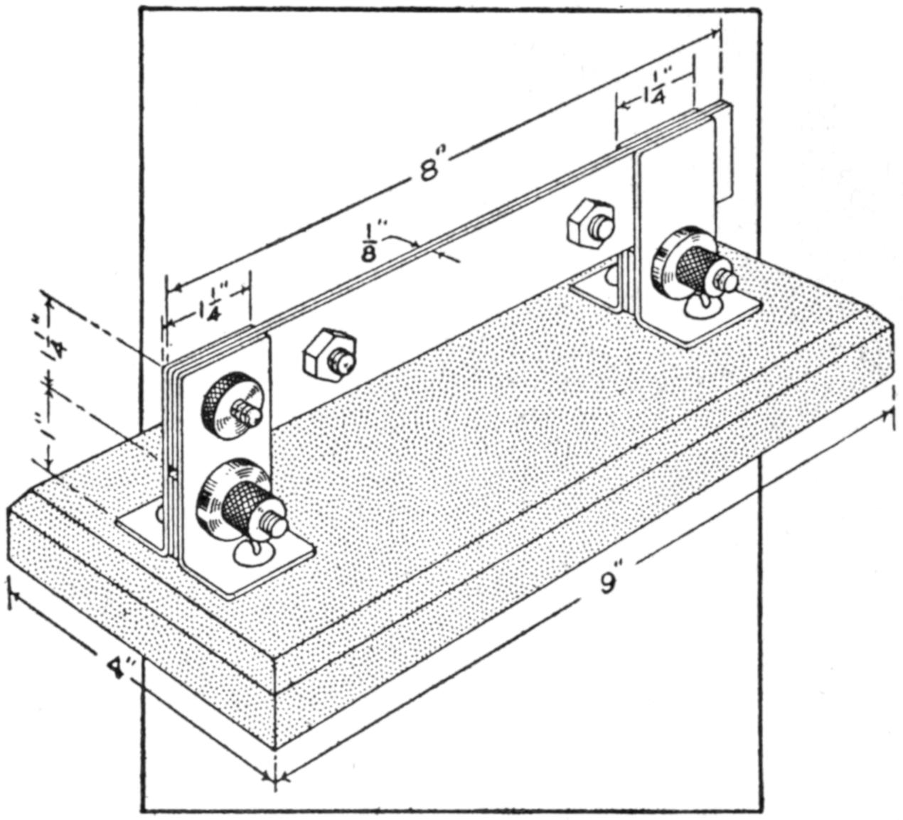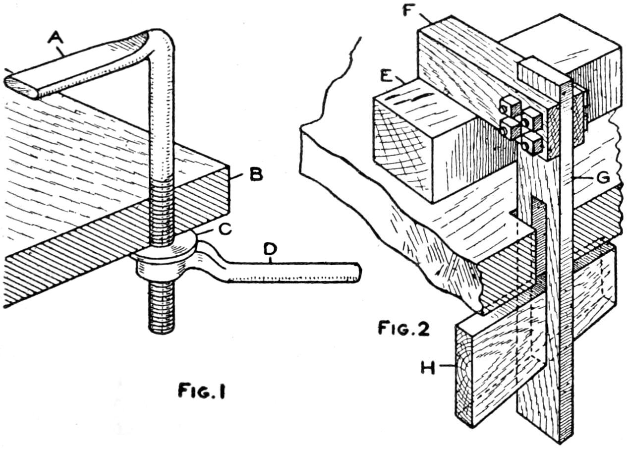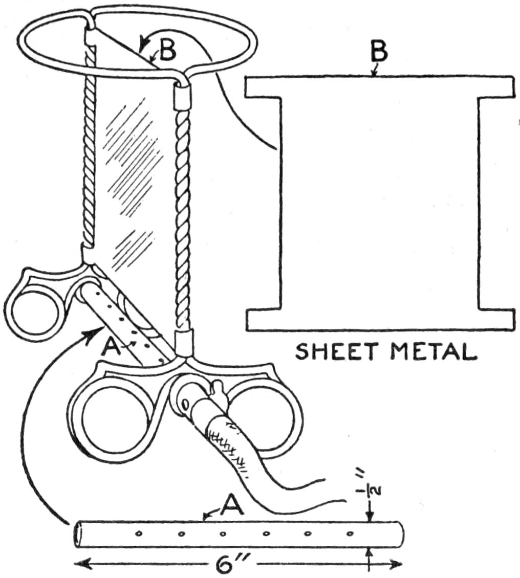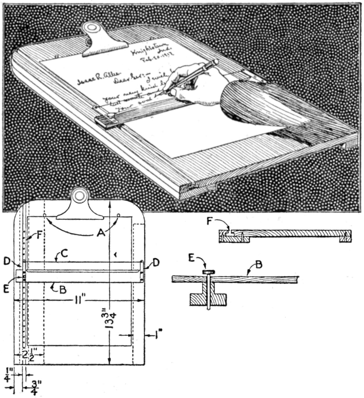 A table arrangement which can be clamped handily to the bedpost and swung out of the way or removed altogether when not in use, is a convenience that has a wide use in the home. A device of this kind, which requires no floor support and can be folded compactly for storage, is shown in the illustration. The table proper consists of a ⁷⁄₈-in. board, of suitable size, the edges of which are banded with metal or thin wooden strips. The board is supported on a frame of iron rod, bent to the form indicated in the dotted lines, and clamped with ¹⁄₁₆-in. brass clamps. The end of this frame rod is bent at an angle and pivoted in a metal bracket. A cotter pin guards against accidental loosening of the joint. The clamping device is made of ¹⁄₄ by 1¹⁄₄-in. band iron, and is bent to fit loosely around the bedpost. A brass plate, A, is fitted inside of the main piece B, as shown. A thumbscrew is threaded into the piece B, its point engaging the brass plate, which acts as a guard. In fastening the piece B on the bedpost, the thumbscrew is set, and the wing nut also tightened.—A. Lavery, Garfield, N. J.