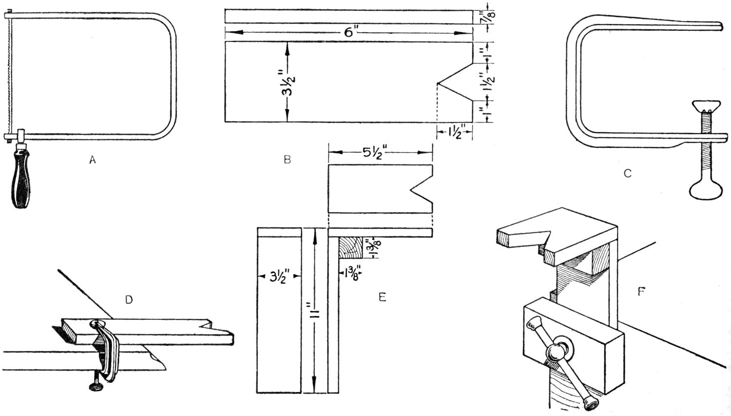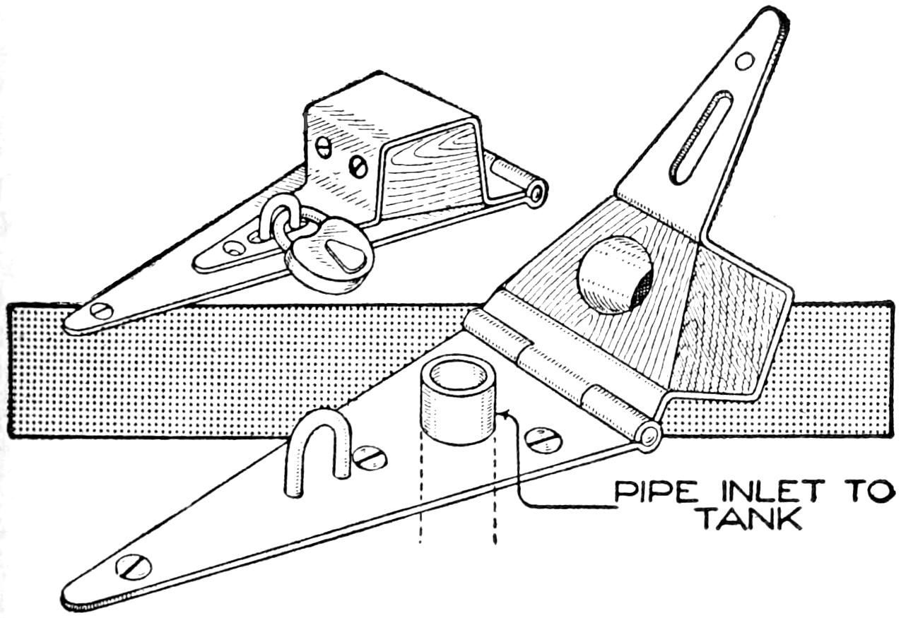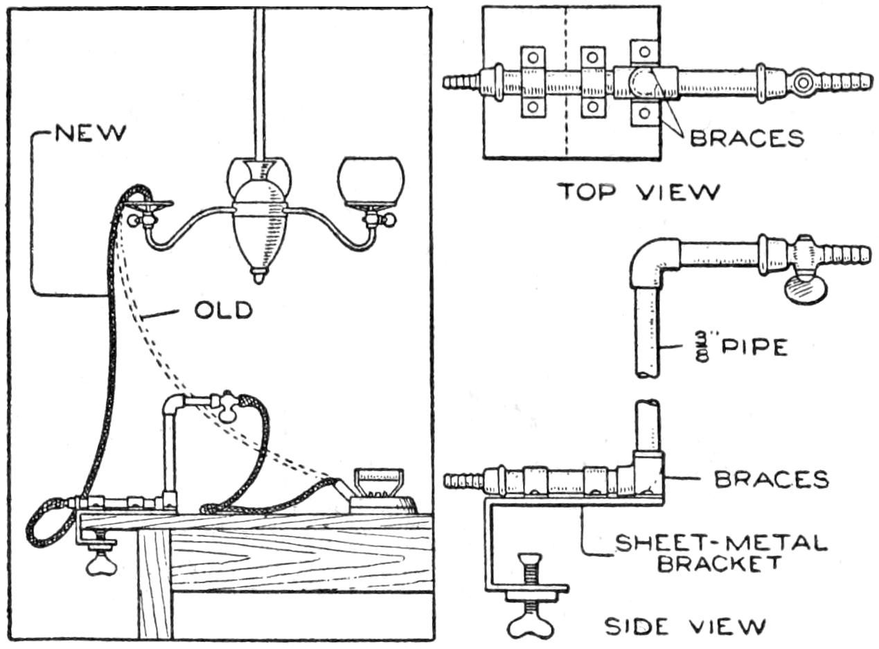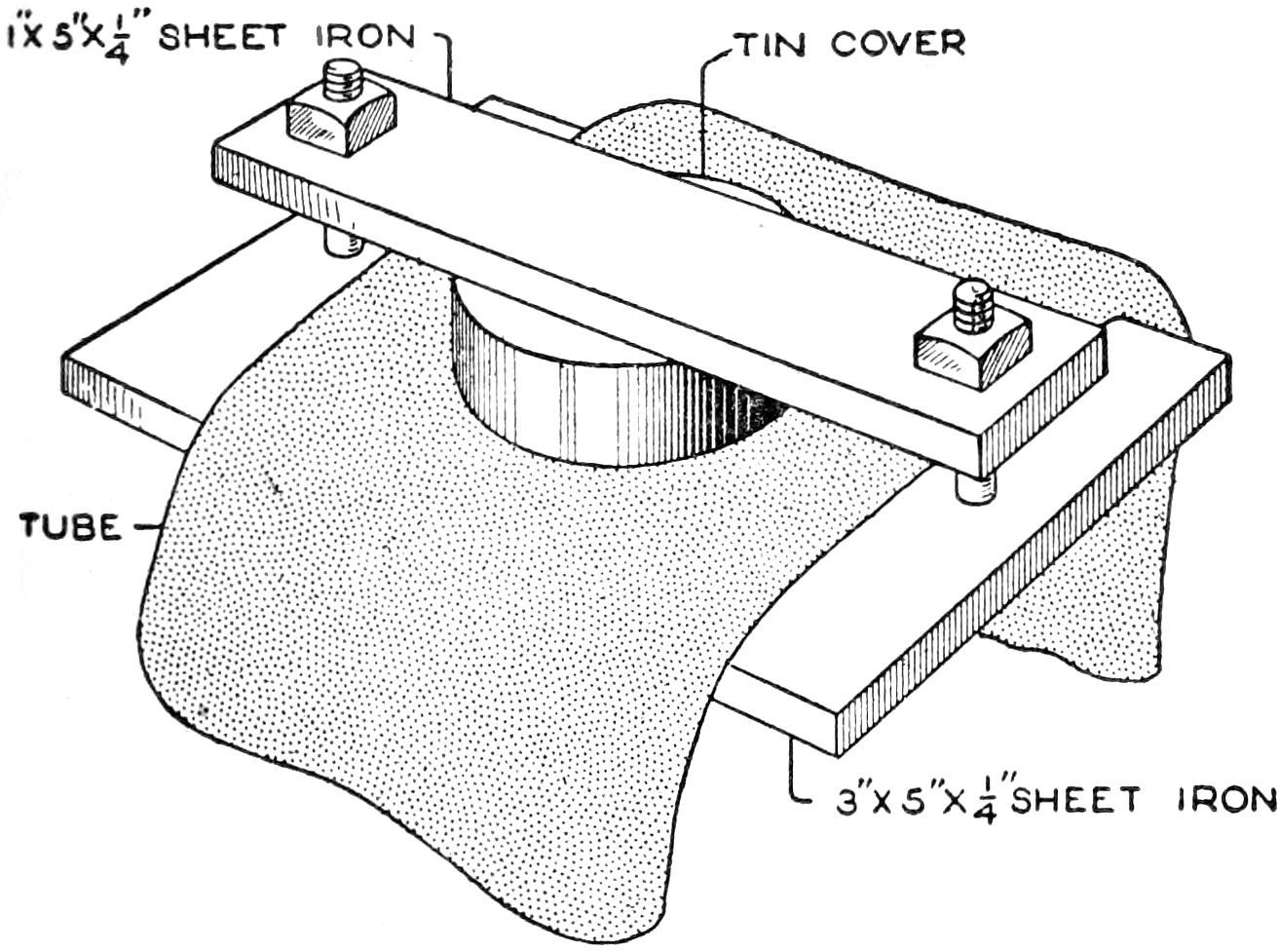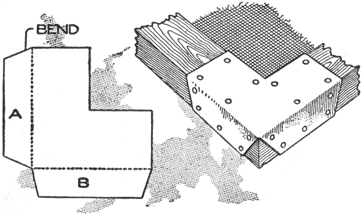 A table arrangement which can be clamped handily to the bedpost and swung out of the way or removed altogether when not in use, is a convenience that has a wide use in the home. A device of this kind, which requires no floor support and can be folded compactly for storage, is shown in the illustration. The table proper consists of a ⁷⁄₈-in. board, of suitable size, the edges of which are banded with metal or thin wooden strips. The board is supported on a frame of iron rod, bent to the form indicated in the dotted lines, and clamped with ¹⁄₁₆-in. brass clamps. The end of this frame rod is bent at an angle and pivoted in a metal bracket. A cotter pin guards against accidental loosening of the joint. The clamping device is made of ¹⁄₄ by 1¹⁄₄-in. band iron, and is bent to fit loosely around the bedpost. A brass plate, A, is fitted inside of the main piece B, as shown. A thumbscrew is threaded into the piece B, its point engaging the brass plate, which acts as a guard. In fastening the piece B on the bedpost, the thumbscrew is set, and the wing nut also tightened.—A. Lavery, Garfield, N. J.