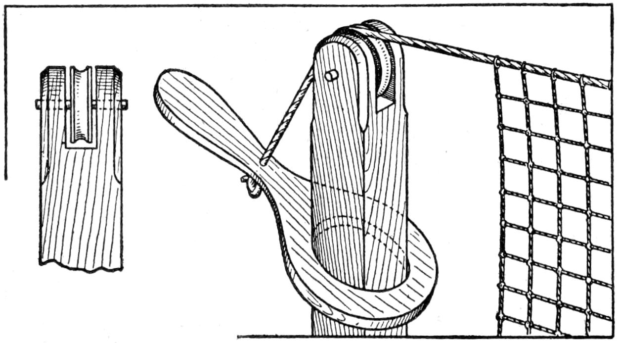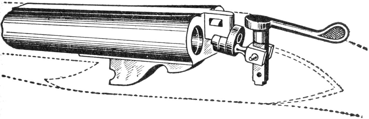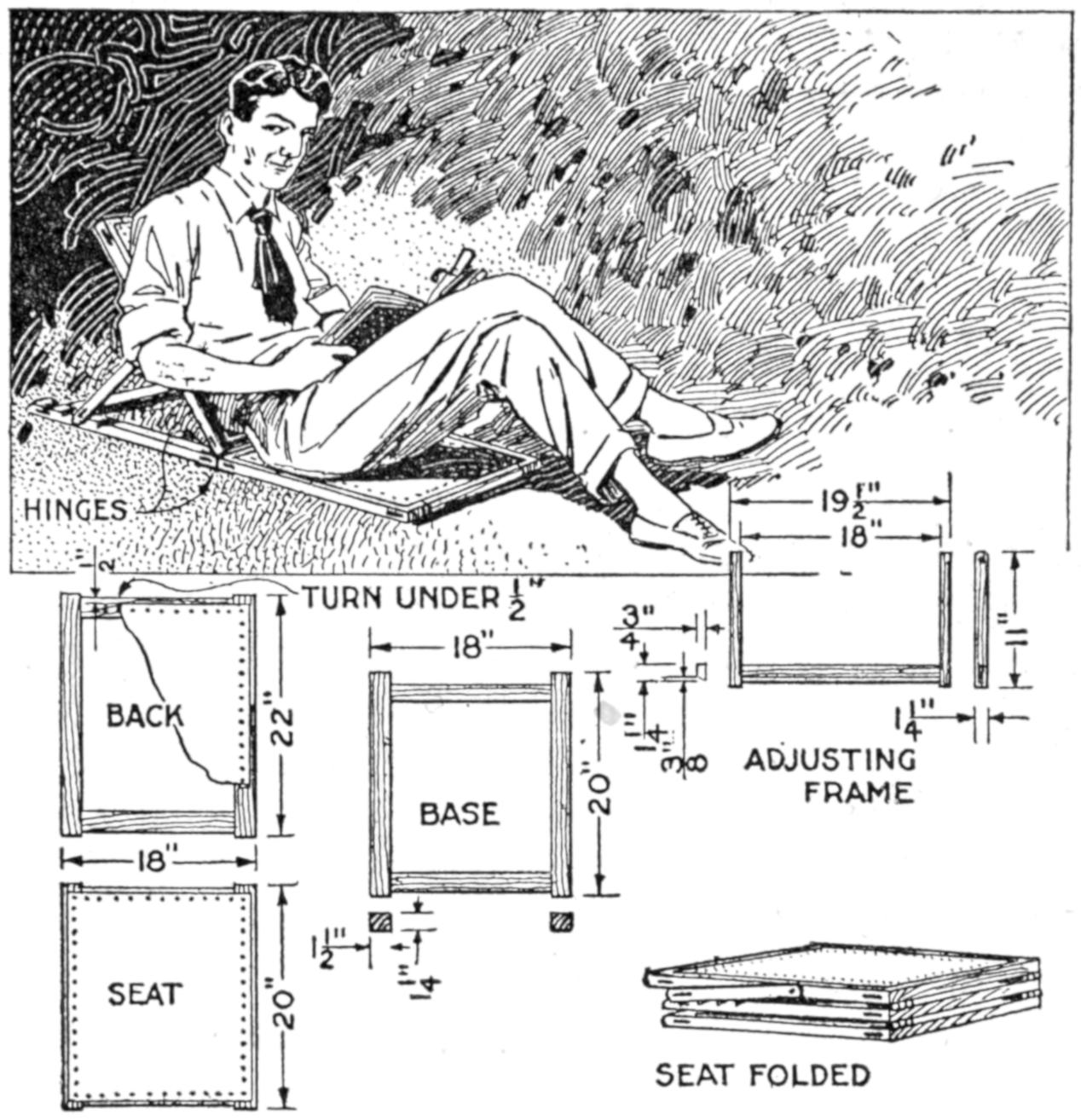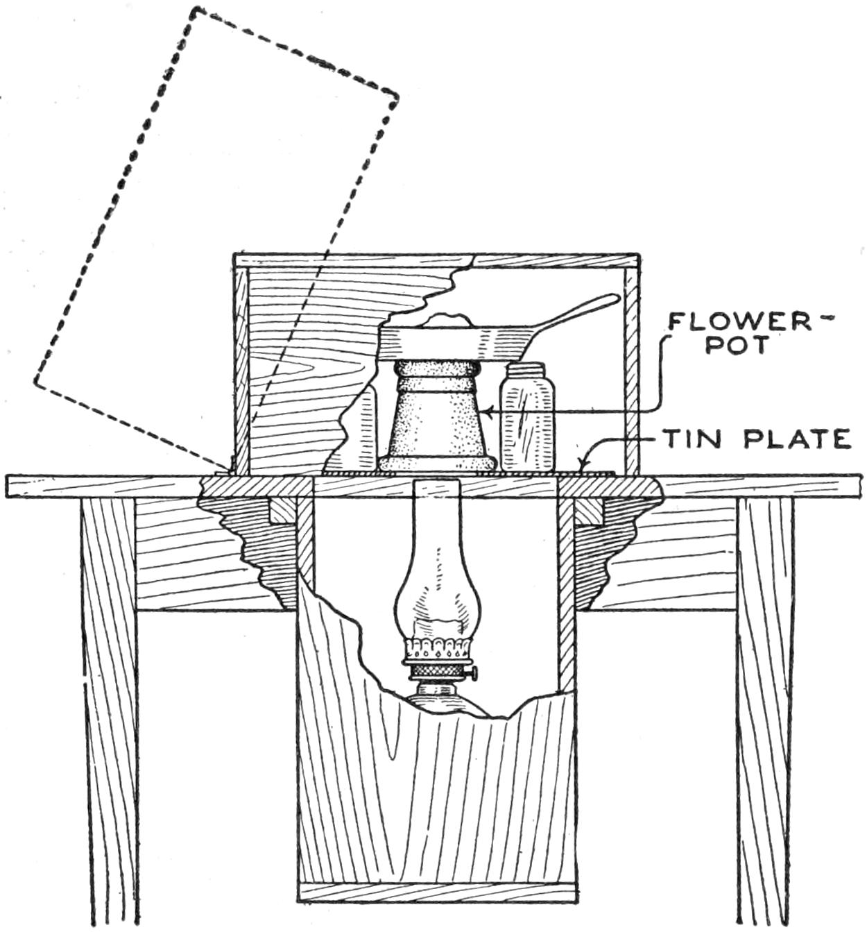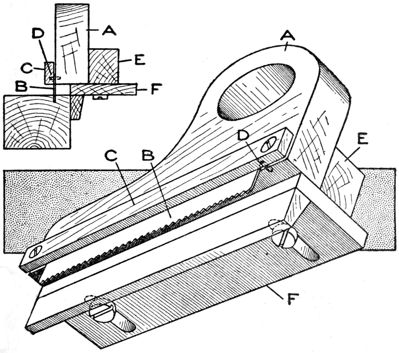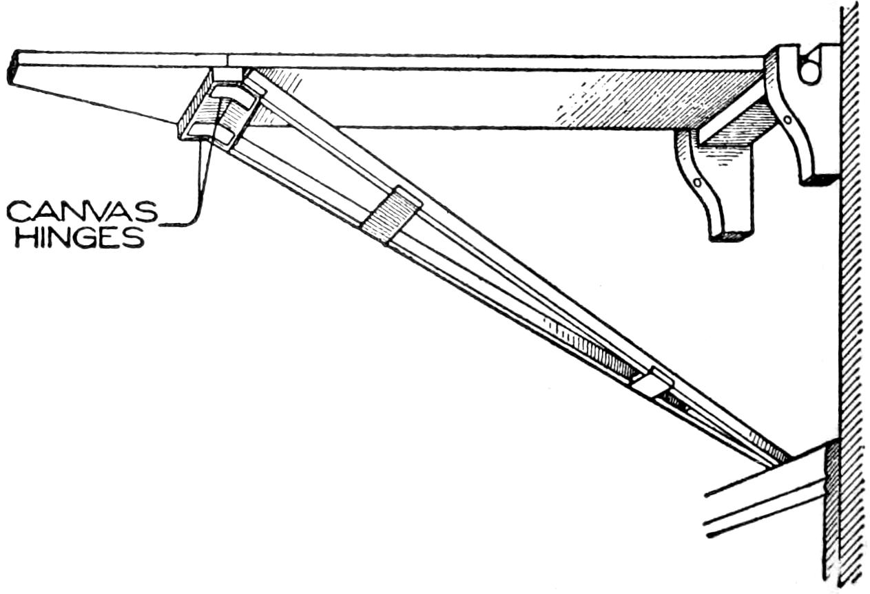 A table arrangement which can be clamped handily to the bedpost and swung out of the way or removed altogether when not in use, is a convenience that has a wide use in the home. A device of this kind, which requires no floor support and can be folded compactly for storage, is shown in the illustration. The table proper consists of a ⁷⁄₈-in. board, of suitable size, the edges of which are banded with metal or thin wooden strips. The board is supported on a frame of iron rod, bent to the form indicated in the dotted lines, and clamped with ¹⁄₁₆-in. brass clamps. The end of this frame rod is bent at an angle and pivoted in a metal bracket. A cotter pin guards against accidental loosening of the joint. The clamping device is made of ¹⁄₄ by 1¹⁄₄-in. band iron, and is bent to fit loosely around the bedpost. A brass plate, A, is fitted inside of the main piece B, as shown. A thumbscrew is threaded into the piece B, its point engaging the brass plate, which acts as a guard. In fastening the piece B on the bedpost, the thumbscrew is set, and the wing nut also tightened.—A. Lavery, Garfield, N. J.