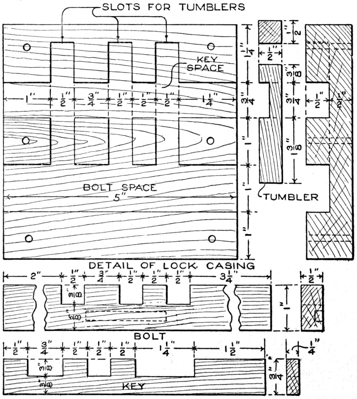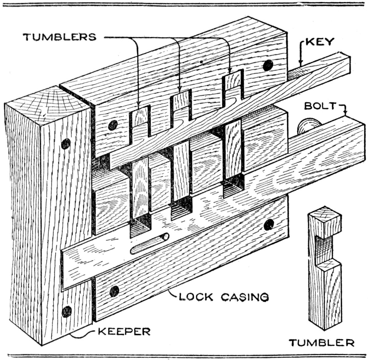 A simple method of providing a homemade locking device for a tier of drawers, the use of only one keyed lock being necessary, as is common in manufactured cases, is shown in the sketch. This is applicable to new or old cases, where a space of about 1¹⁄₂ in. is available between the back of the drawers and the rear of the case.
