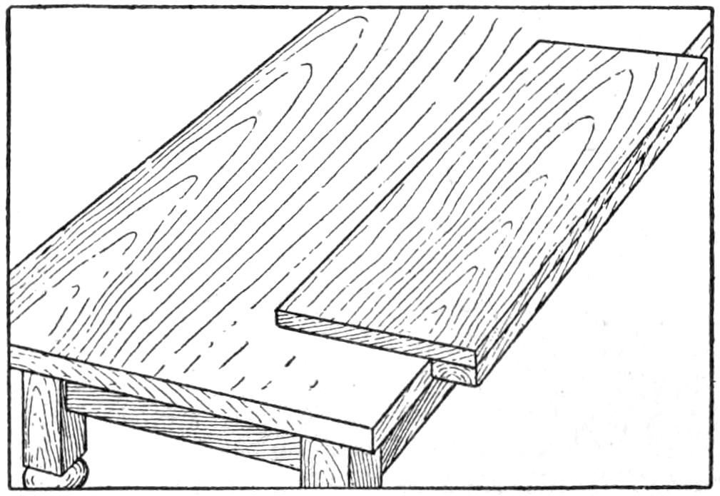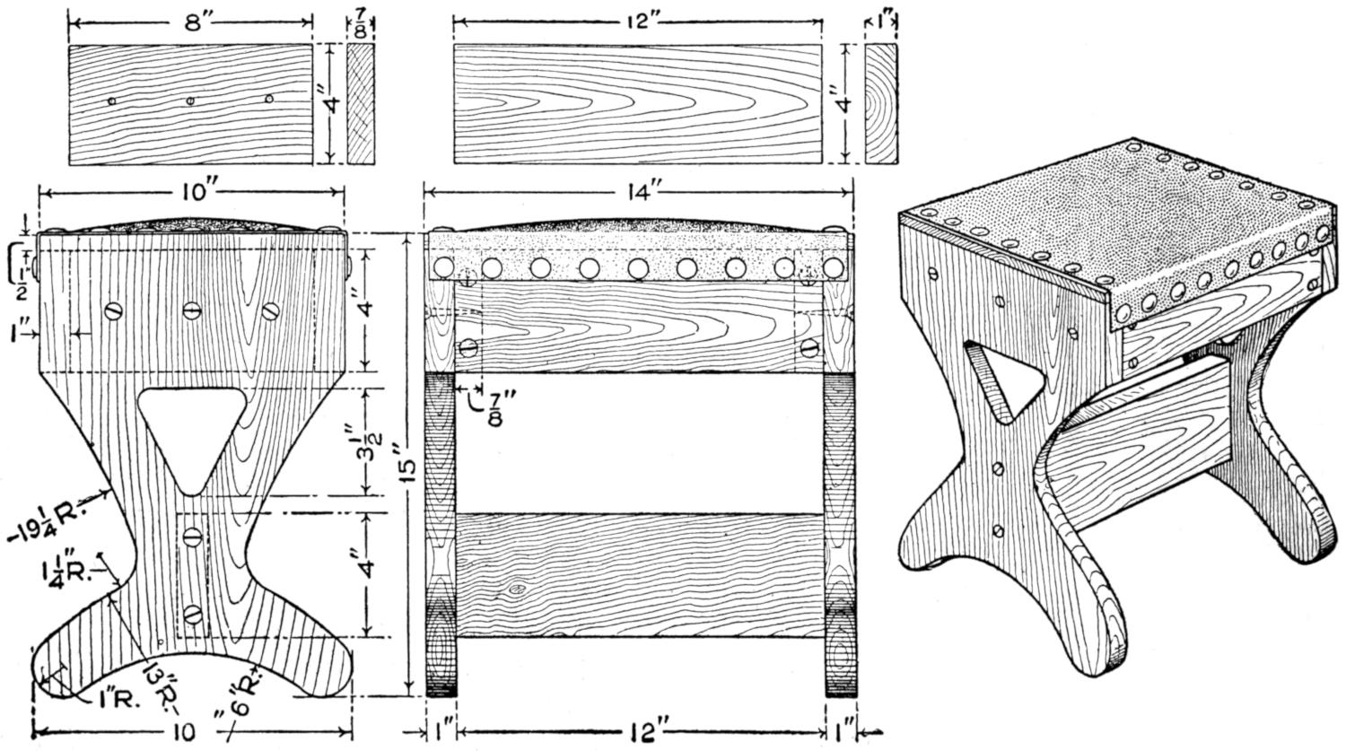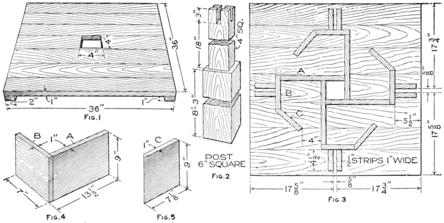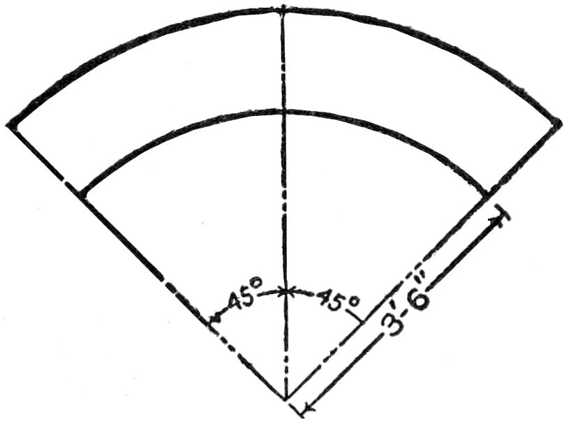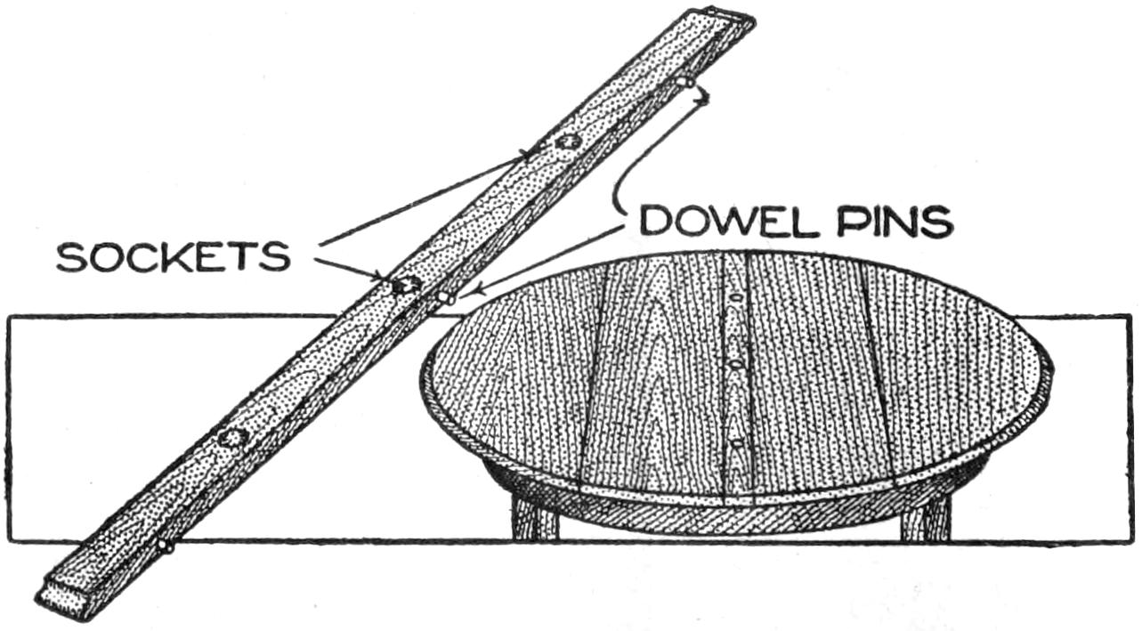 When the top and shelf are dry, brace the top with cleats screwed on underneath, as shown in the bottom view of the top. Lay out the shelf accurately, and shape it to a perfect octagon, 25 in. across from opposite parallel sides. Make a strip, 1⁵⁄₈ in. wide, and use it in marking the layout for the top, from the shelf as a pattern, the edges of the top being parallel with those of the shelf and 1⁵⁄₈ in. from them.