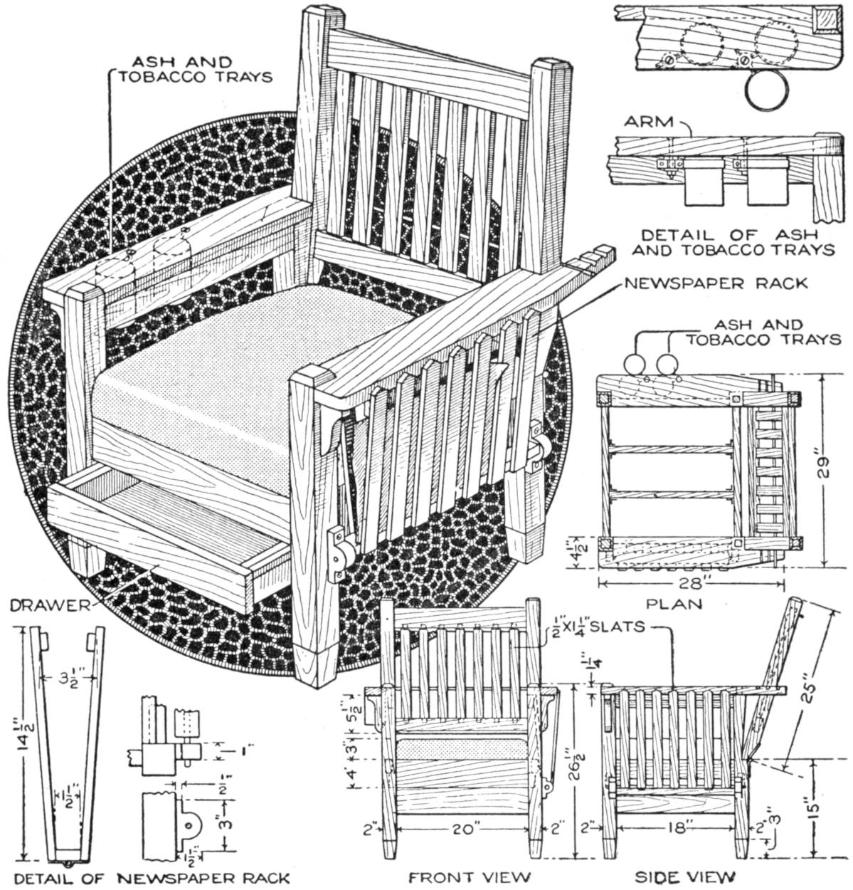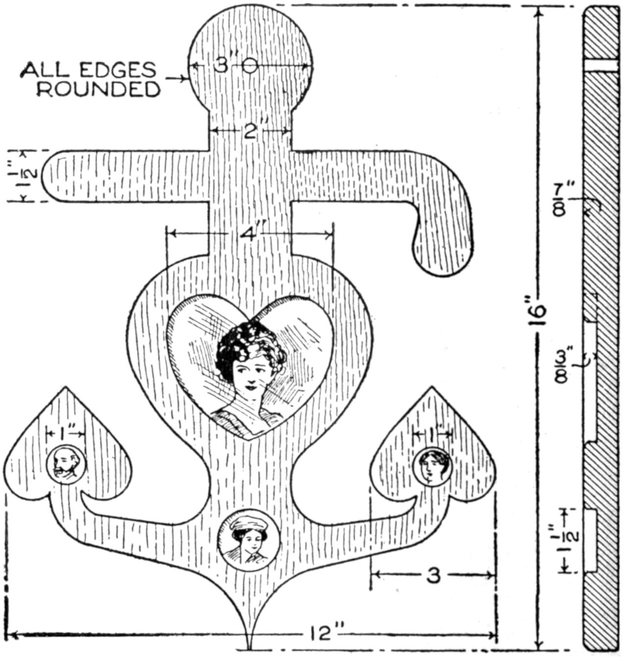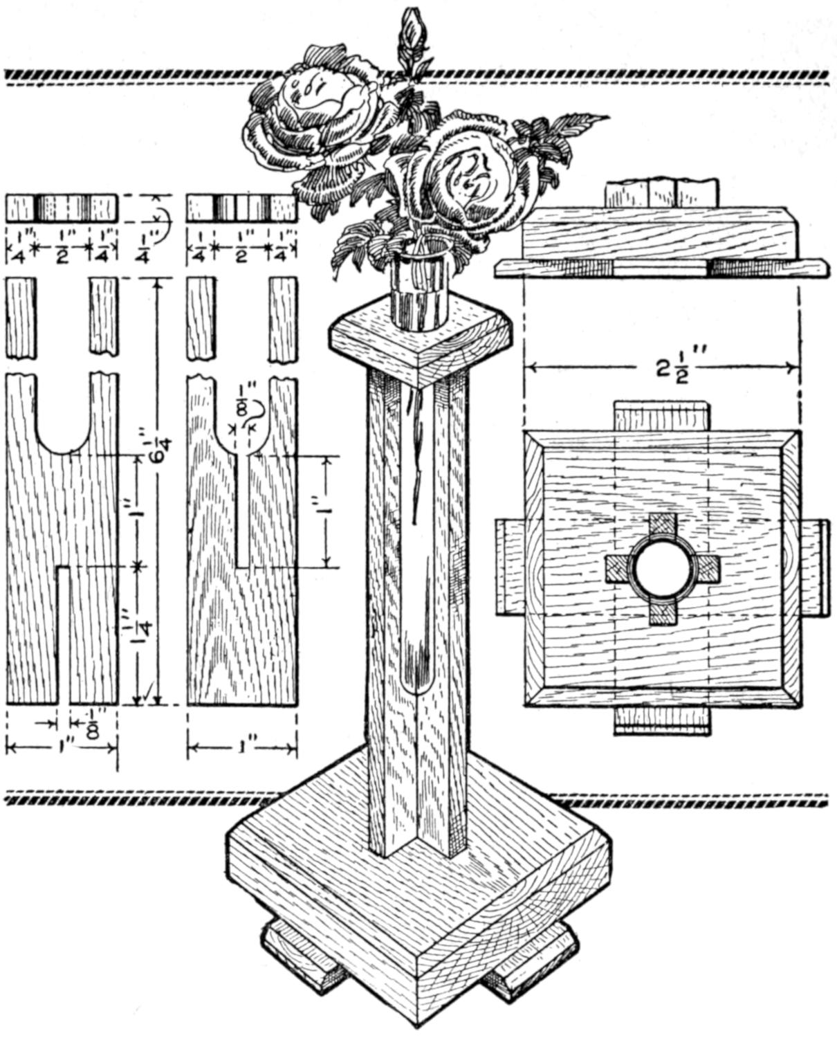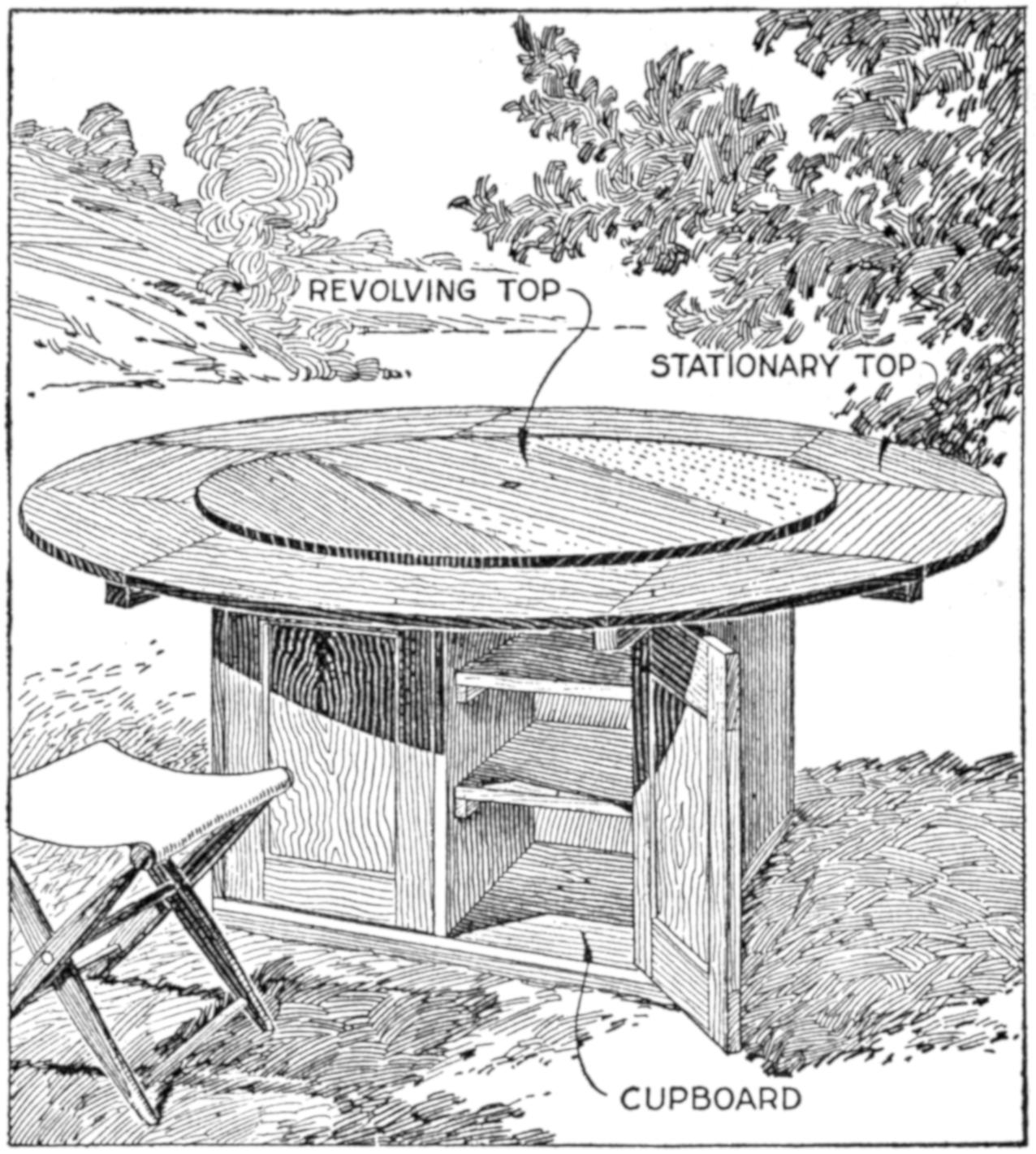 When the top and shelf are dry, brace the top with cleats screwed on underneath, as shown in the bottom view of the top. Lay out the shelf accurately, and shape it to a perfect octagon, 25 in. across from opposite parallel sides. Make a strip, 1⁵⁄₈ in. wide, and use it in marking the layout for the top, from the shelf as a pattern, the edges of the top being parallel with those of the shelf and 1⁵⁄₈ in. from them.