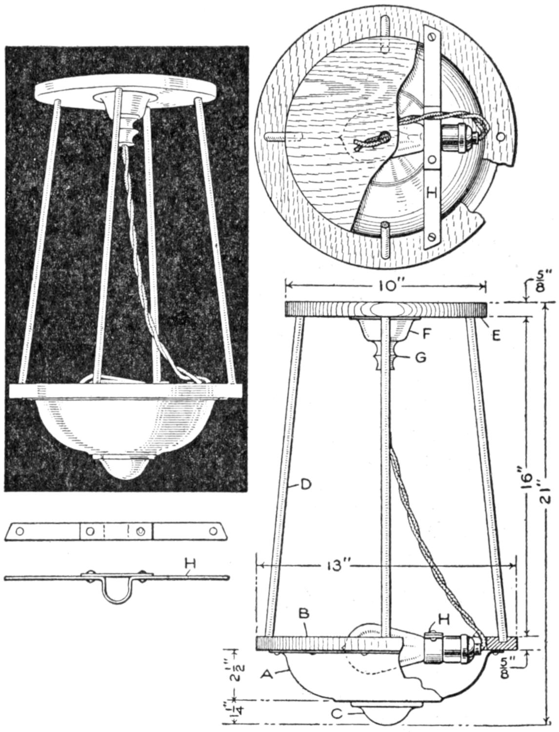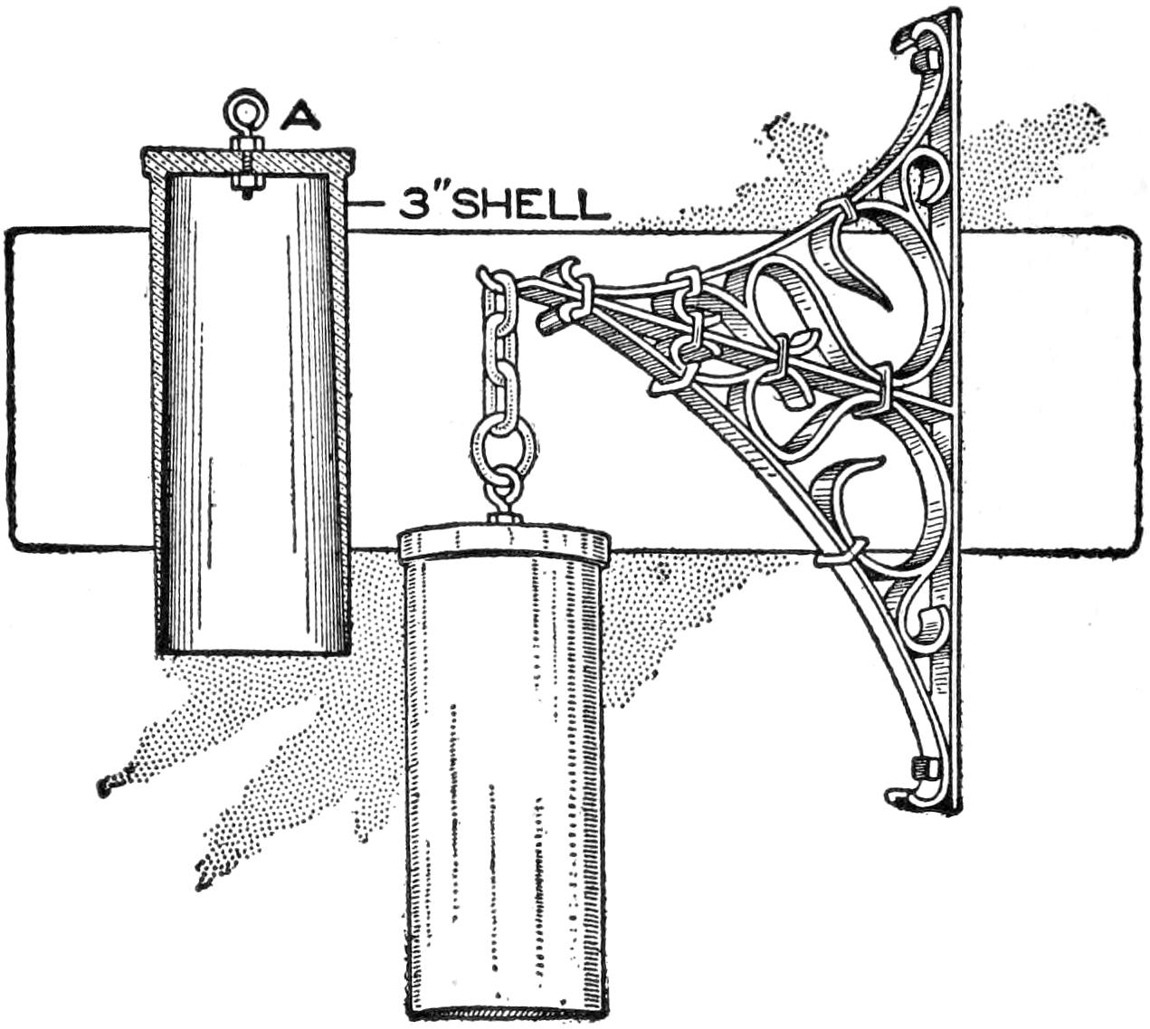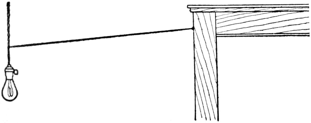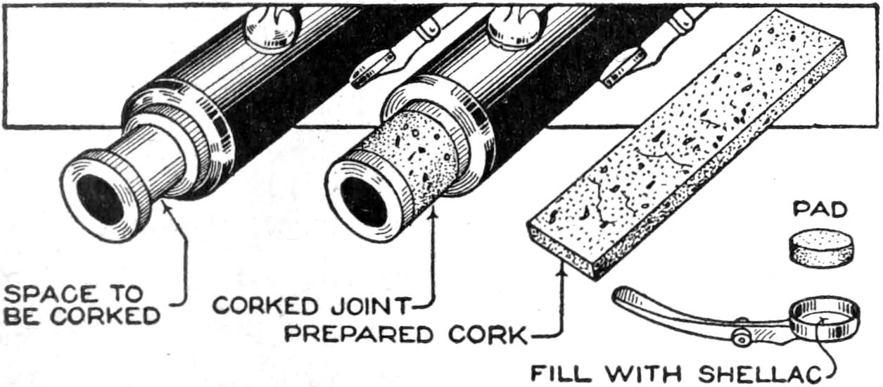 A number of wooden candlesticks were to be fitted with fixtures for electric lights, and it was found that the types ordinarily available could not be attached in the usual manner. A simple method was, therefore, devised, as shown in the sketch, and proved practical. A short length of brass tubing, A, was screwed into a hole drilled in the bottom of the candle socket, both ends of the tube being threaded. A hole was drilled through the side of the tube, and another through the side of the candlestick cup, as indicated. The hole in the wood was fitted with an insulation ring, B. The wiring, suitably taped, was carried through the opening for it, into the tube, and fastened in the usual manner to a standard keyless socket, which was then screwed to the end of the tube, making a substantial support. The lights were controlled conveniently at the usual wall switches.—Livingston Haviland, Buffalo, N. Y.