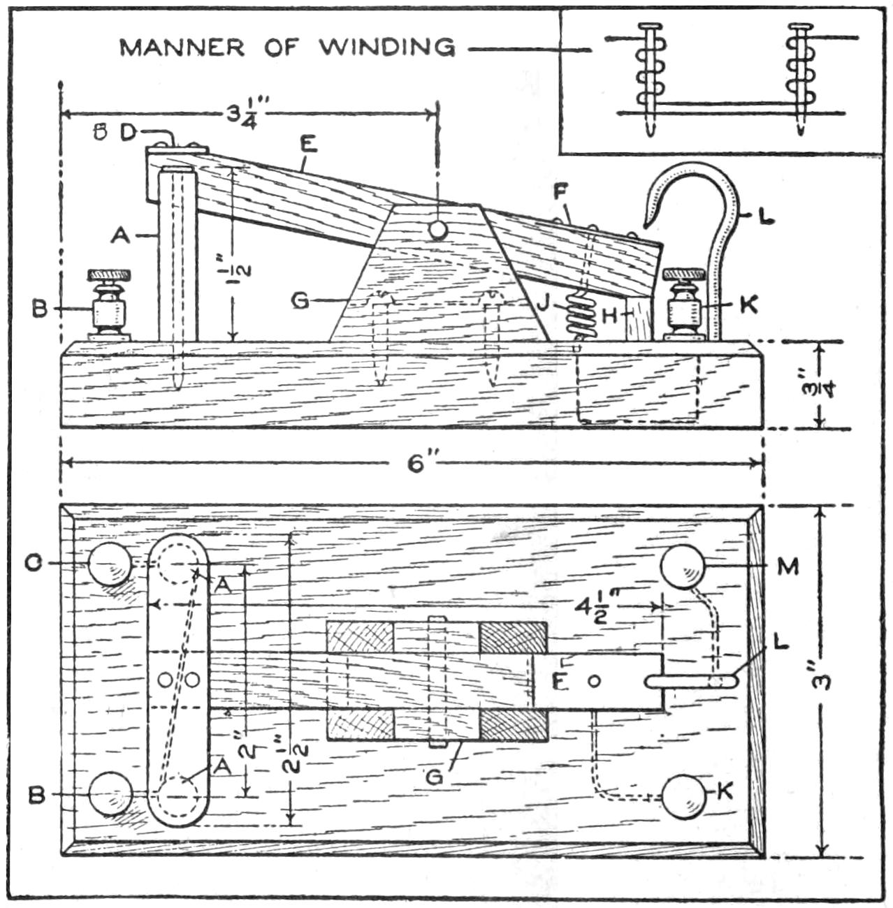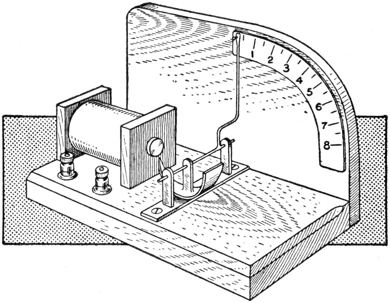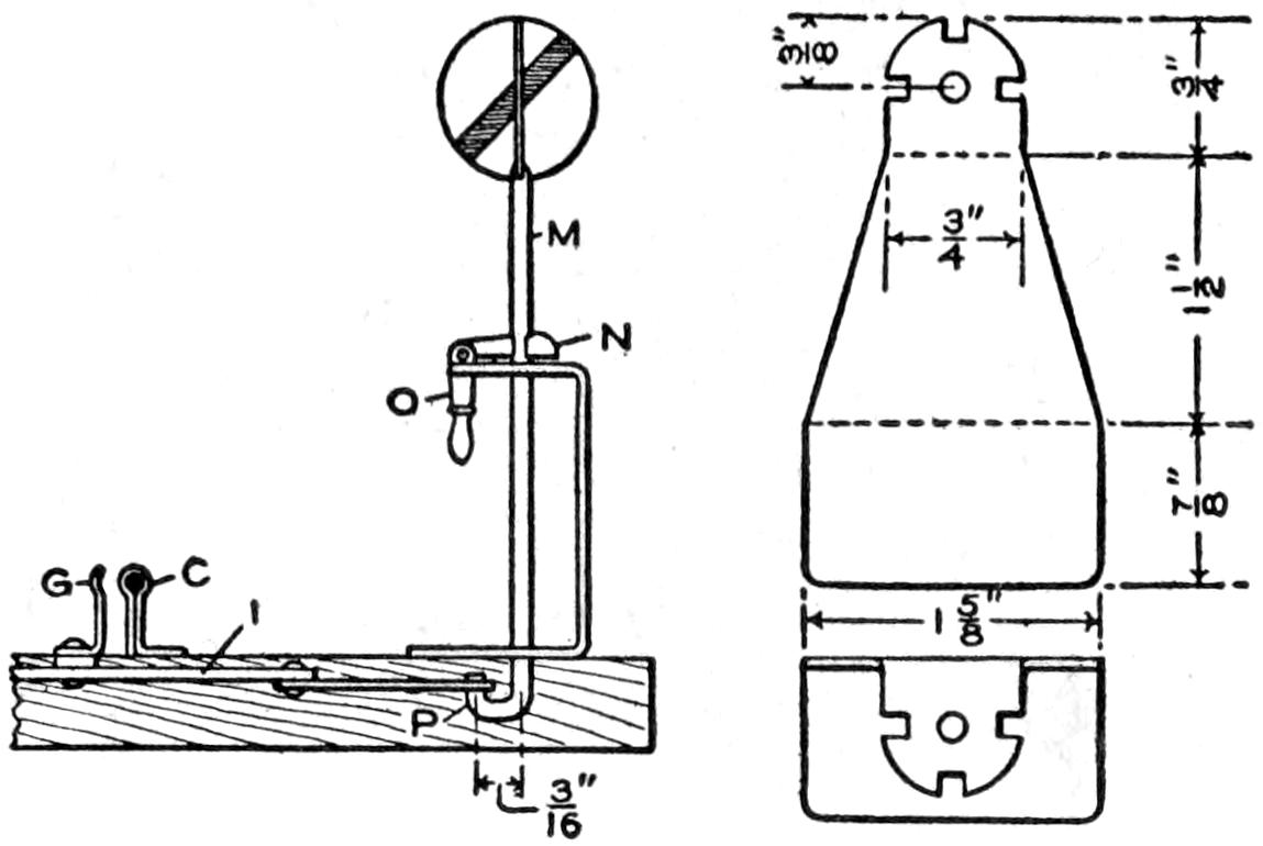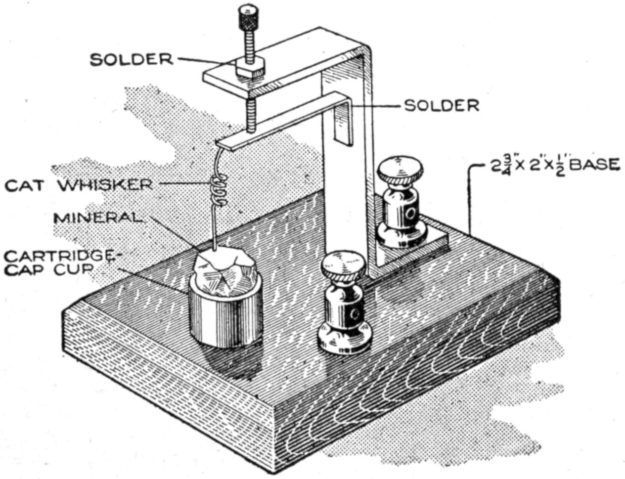 A cheap and serviceable wireless detector was made from odds and ends such as any amateur can obtain. The base was made of wood, saturated in paraffin. The mineral cup is a brass cap from a cartridge fuse. The upright was made of a piece of copper, ¹⁄₂ by 4¹⁄₂ in. long, and is fastened to the base by an old-battery binding post. The spring which supports the cat whisker is made of a strip of copper, ¹⁄₃₂ in. by ³⁄₁₆ in. wide. The cat whisker is soldered to the spring, and the spring is bolted to the upright. The setscrew, which regulates the pressure of the cat whisker upon the mineral, works in a nut, soldered over a hole in the top of the upright. The cat whisker is made of No. 22 gauge bare copper wire. The connection between the cup and the battery binding post, at the front edge, is made on the under side of the base.—Charles Brinkmann, Chicago, Ill.