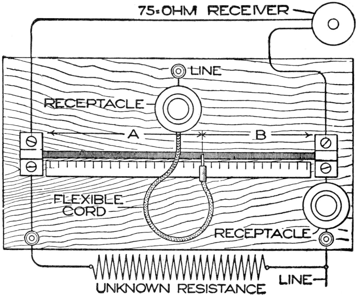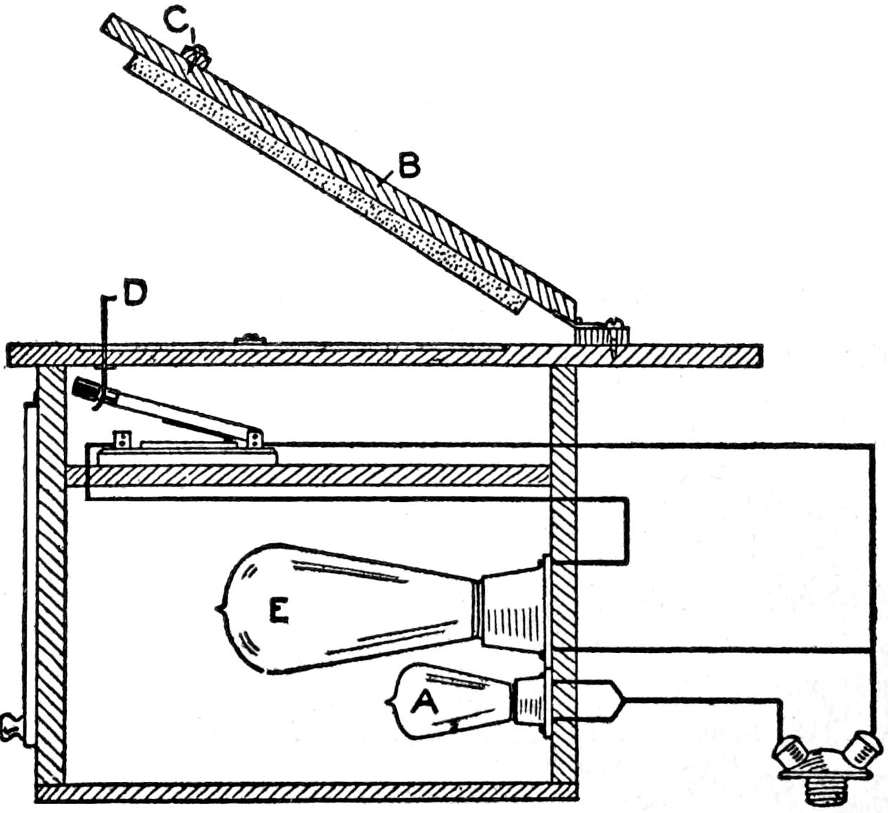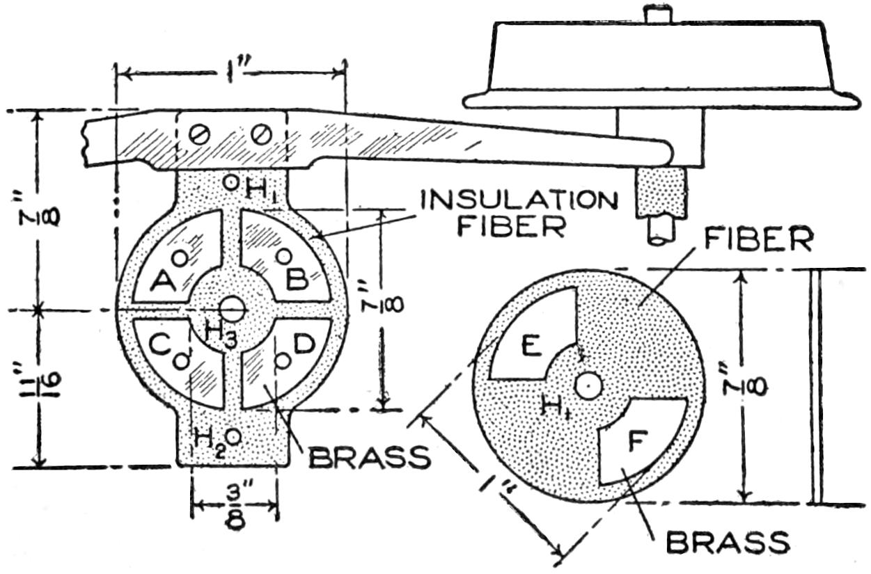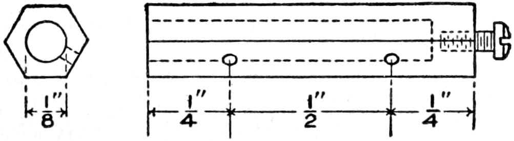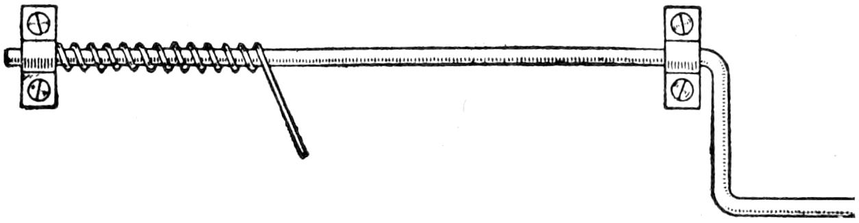 A cheap and serviceable wireless detector was made from odds and ends such as any amateur can obtain. The base was made of wood, saturated in paraffin. The mineral cup is a brass cap from a cartridge fuse. The upright was made of a piece of copper, ¹⁄₂ by 4¹⁄₂ in. long, and is fastened to the base by an old-battery binding post. The spring which supports the cat whisker is made of a strip of copper, ¹⁄₃₂ in. by ³⁄₁₆ in. wide. The cat whisker is soldered to the spring, and the spring is bolted to the upright. The setscrew, which regulates the pressure of the cat whisker upon the mineral, works in a nut, soldered over a hole in the top of the upright. The cat whisker is made of No. 22 gauge bare copper wire. The connection between the cup and the battery binding post, at the front edge, is made on the under side of the base.—Charles Brinkmann, Chicago, Ill.