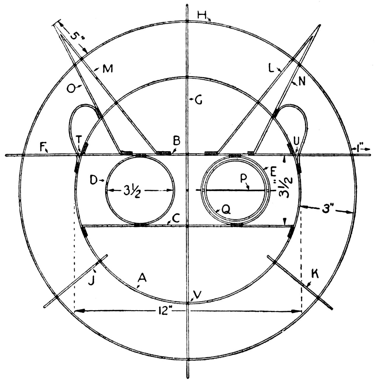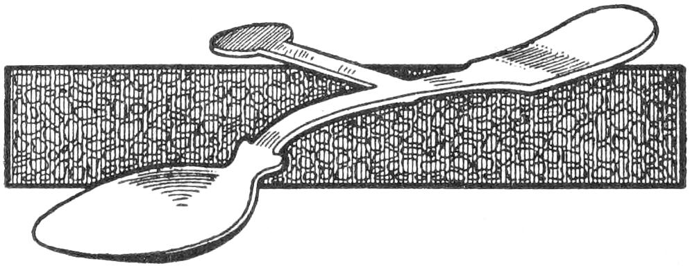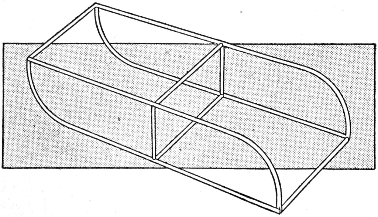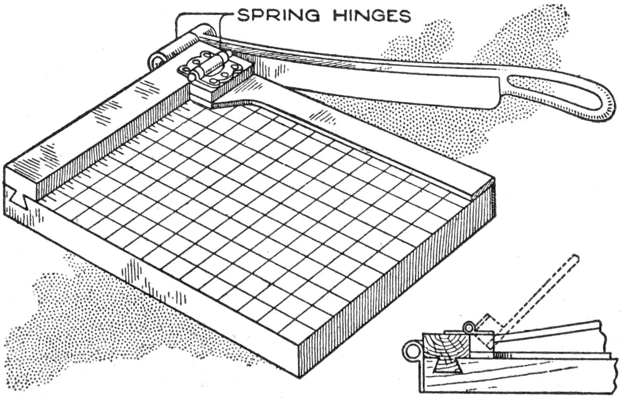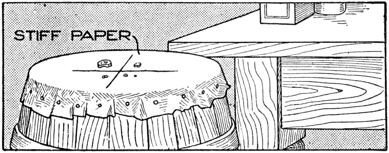 To provide a simple homemade device for cutting apples and other fruit into quarters and at the same time removing the core, the arrangement shown in the sketch was made. The circular frame is built up around a ring, ³⁄₄ in. in diameter, and the ribs and handles are soldered to it. A strip of galvanised iron, ¹⁄₂ in. wide, was used for the cutting portion, and the lower edge was filed sharp, and then finished with a small oil stone. In use, the cutter is set over the fruit, as shown, and by pressure on the handles, it is cut neatly.—L. N. Brown, Baltimore, Md.