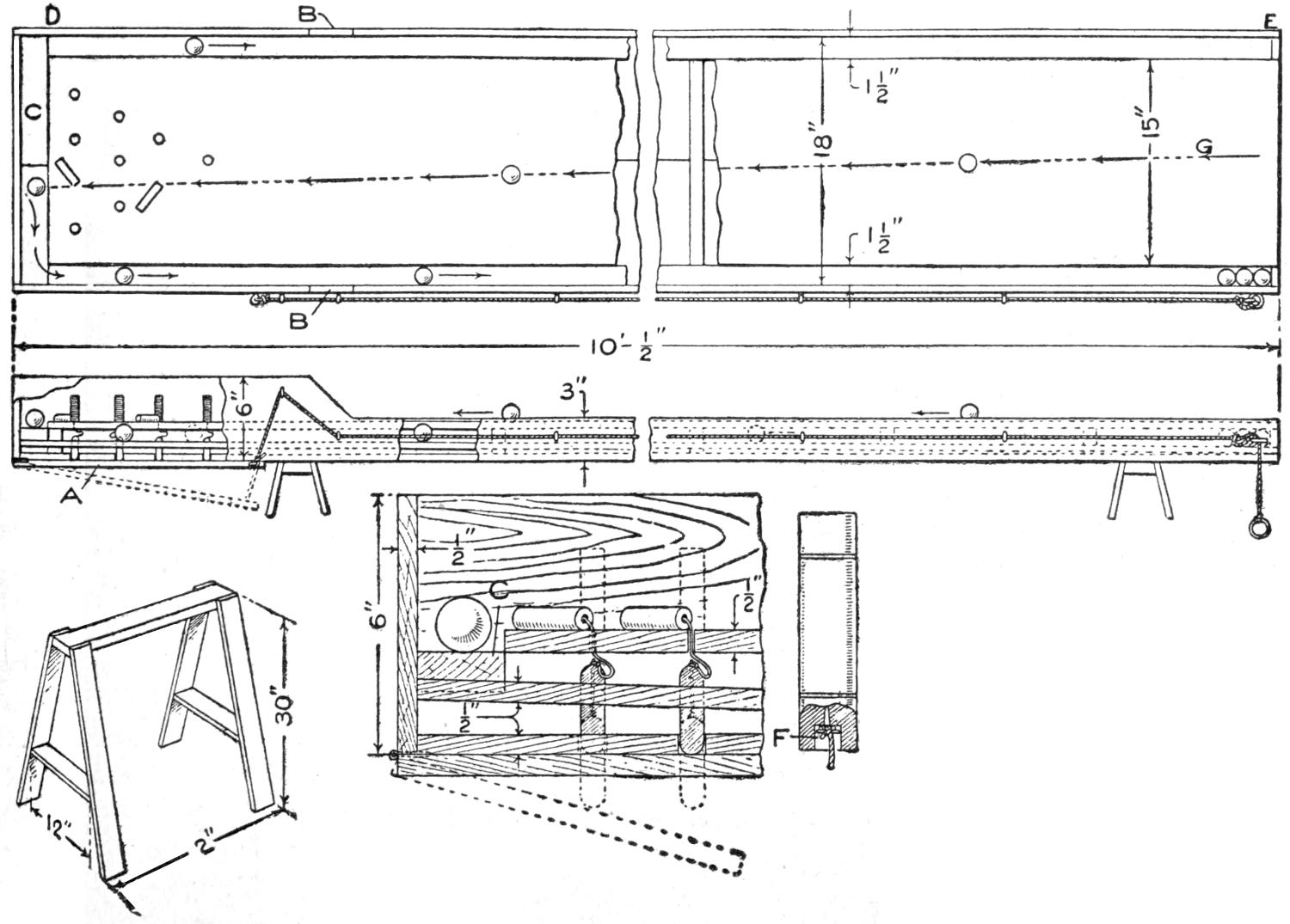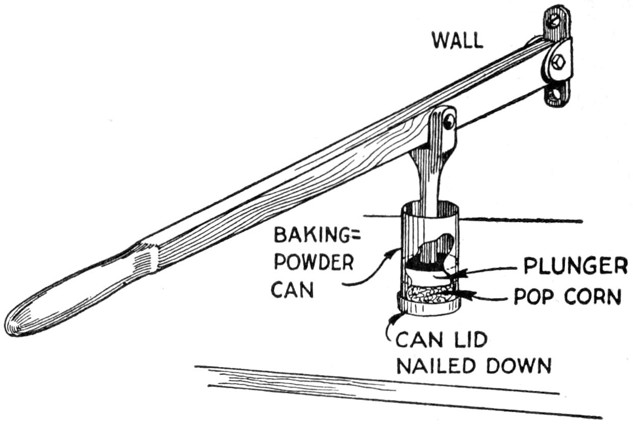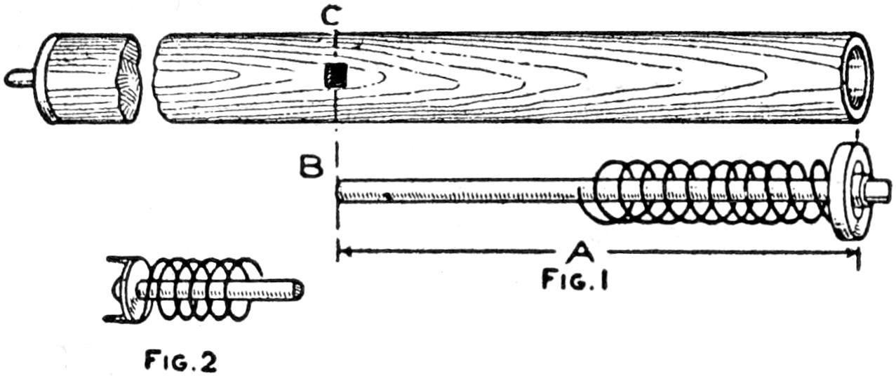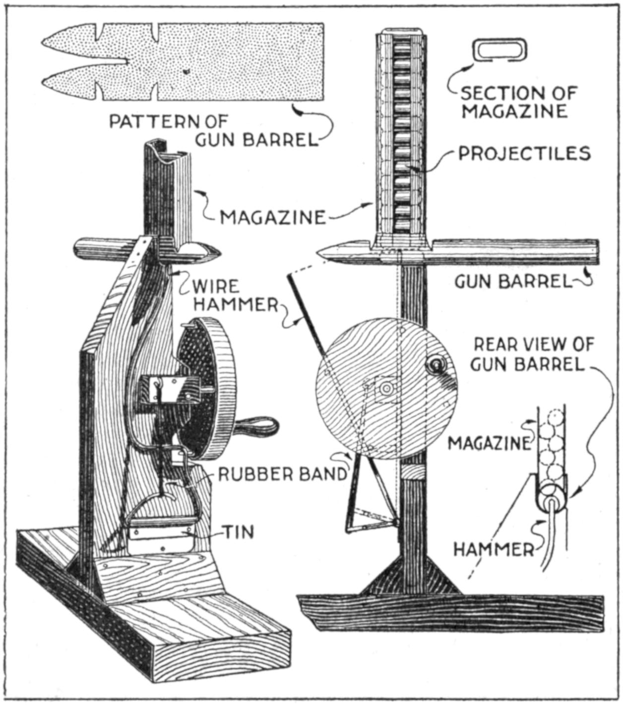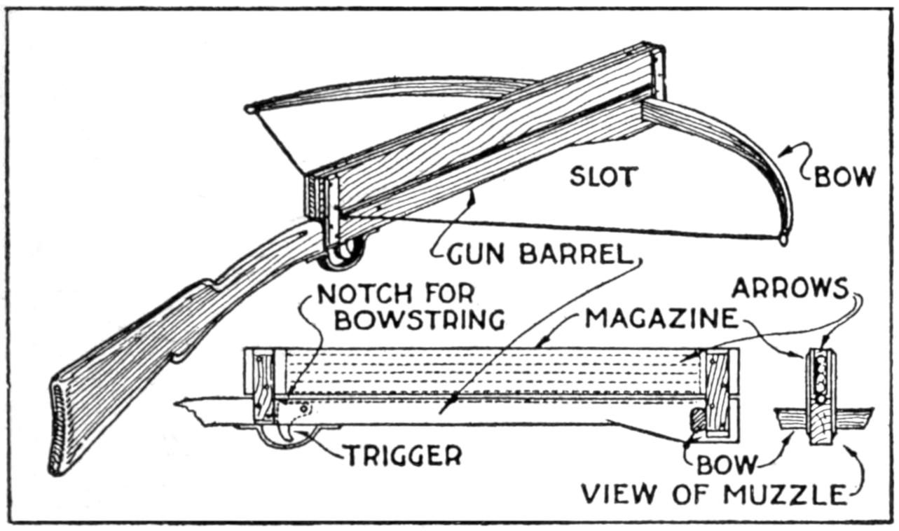 A new type of bow gun that a boy can make, and which will give him plenty of good sport, is one of the repeating or magazine variety. To make the gun, cut a soft pine board, 40 in.[459] long and 5 in. wide. With a saw and knife, cut the gun form as shown. Cut a groove along the top of the barrel, where the arrow will lie ready to be shot out when the hickory bow is released. The magazine holding the five arrows is made of thin boards, 24 in. long, and is held in place by four small strips. The magazine is 3 in. deep, thus permitting the five arrows to lie evenly in it without crowding. The bow is of seasoned hickory and is set into the end of the barrel. The notch in which the bowstring catches, should be cut just under the rear end of the magazine. The trigger is an L-shaped, pivoted piece, and pushes the cord off the notch when ready to fire. As soon as the first arrow leaves the gun the one just above it drops down into the groove when the bowstring is again pulled back into place behind the notch. Pressure on the trigger shoots this arrow, another takes its place, and the cord is pulled back once more. The arrows should be of light pine, 22 in. long and ¹⁄₂ in. square, the rear end notched and the front pointed. To make the arrow shoot in a straight course, and to give it proper weight, the head end should be bored with a ³⁄₁₆ in. bit, 3 in. deep, and melted lead run into the hole.—E. F. Dalton, Cincinnati, Ohio.
