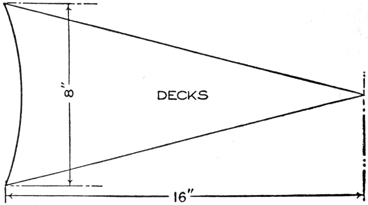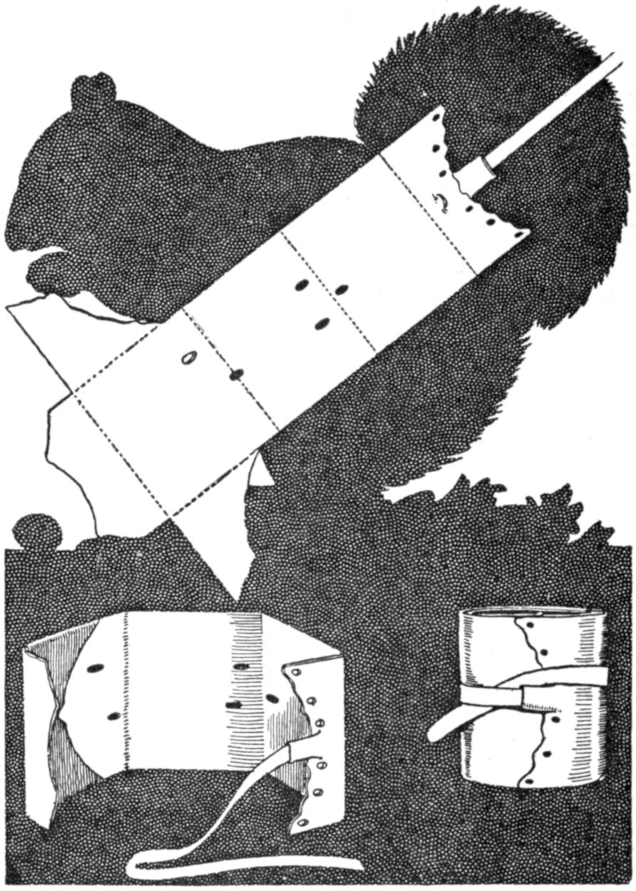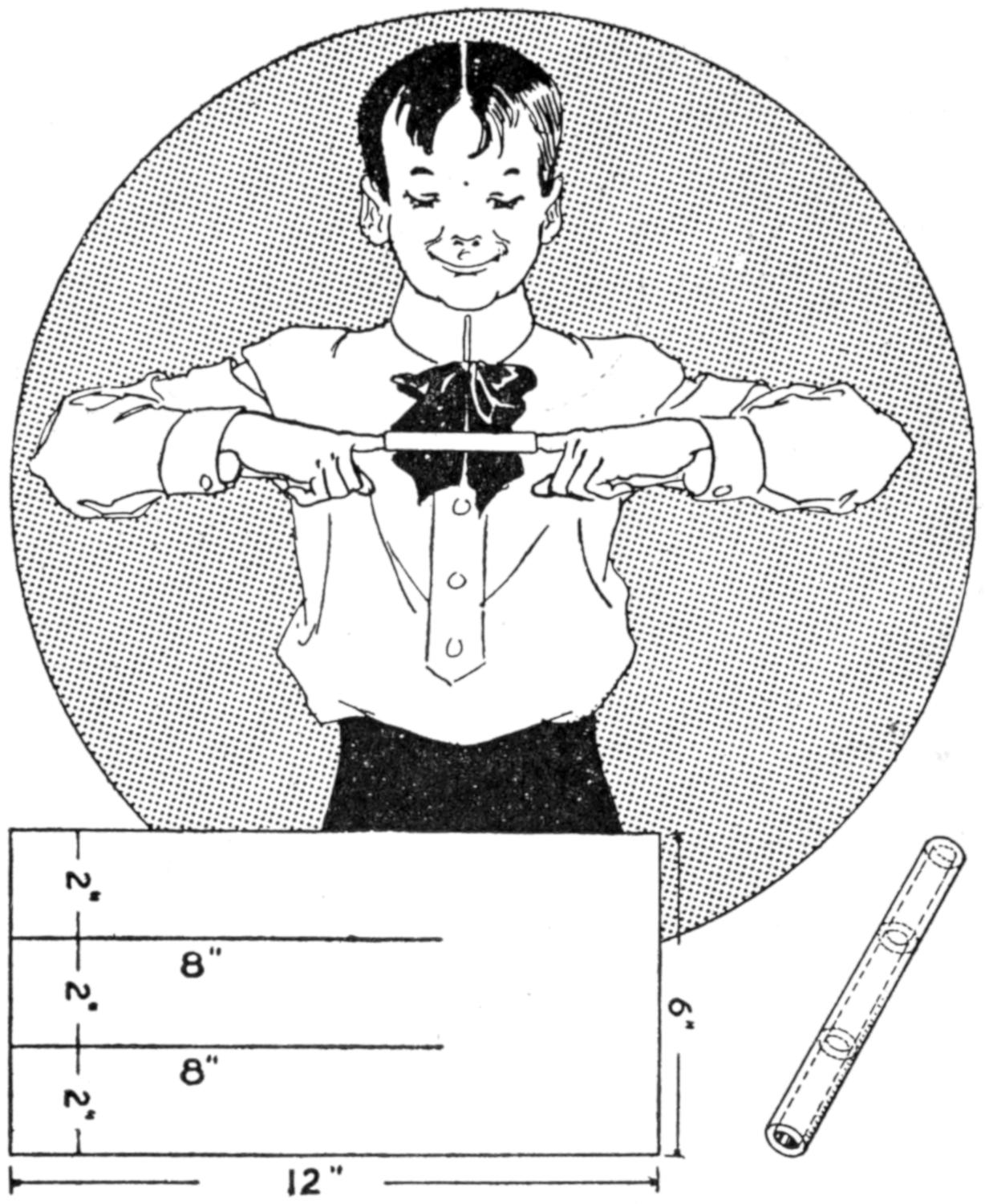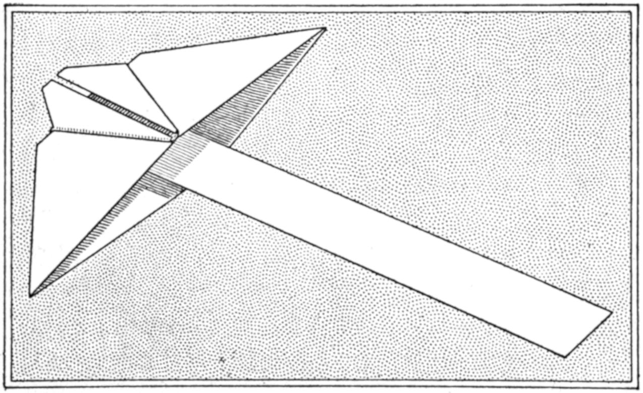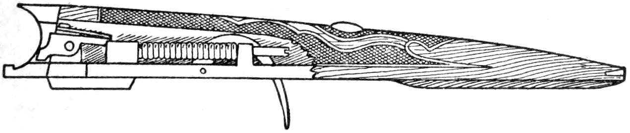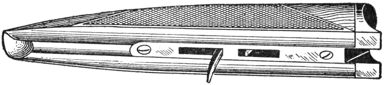A new type of bow gun that a boy can make, and which will give him plenty of good sport, is one of the repeating or magazine variety. To make the gun, cut a soft pine board, 40 in.[459] long and 5 in. wide. With a saw and knife, cut the gun form as shown. Cut a groove along the top of the barrel, where the arrow will lie ready to be shot out when the hickory bow is released. The magazine holding the five arrows is made of thin boards, 24 in. long, and is held in place by four small strips. The magazine is 3 in. deep, thus permitting the five arrows to lie evenly in it without crowding. The bow is of seasoned hickory and is set into the end of the barrel. The notch in which the bowstring catches, should be cut just under the rear end of the magazine. The trigger is an L-shaped, pivoted piece, and pushes the cord off the notch when ready to fire. As soon as the first arrow leaves the gun the one just above it drops down into the groove when the bowstring is again pulled back into place behind the notch. Pressure on the trigger shoots this arrow, another takes its place, and the cord is pulled back once more. The arrows should be of light pine, 22 in. long and ¹⁄₂ in. square, the rear end notched and the front pointed. To make the arrow shoot in a straight course, and to give it proper weight, the head end should be bored with a ³⁄₁₆ in. bit, 3 in. deep, and melted lead run into the hole.—E. F. Dalton, Cincinnati, Ohio.