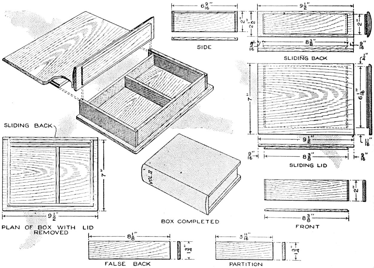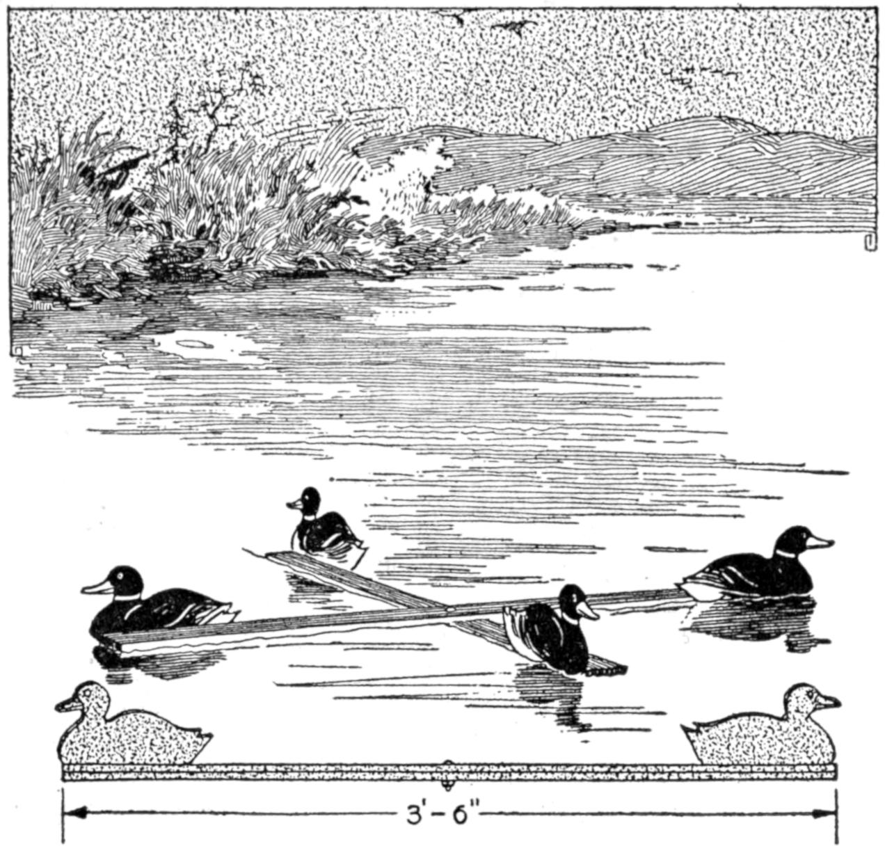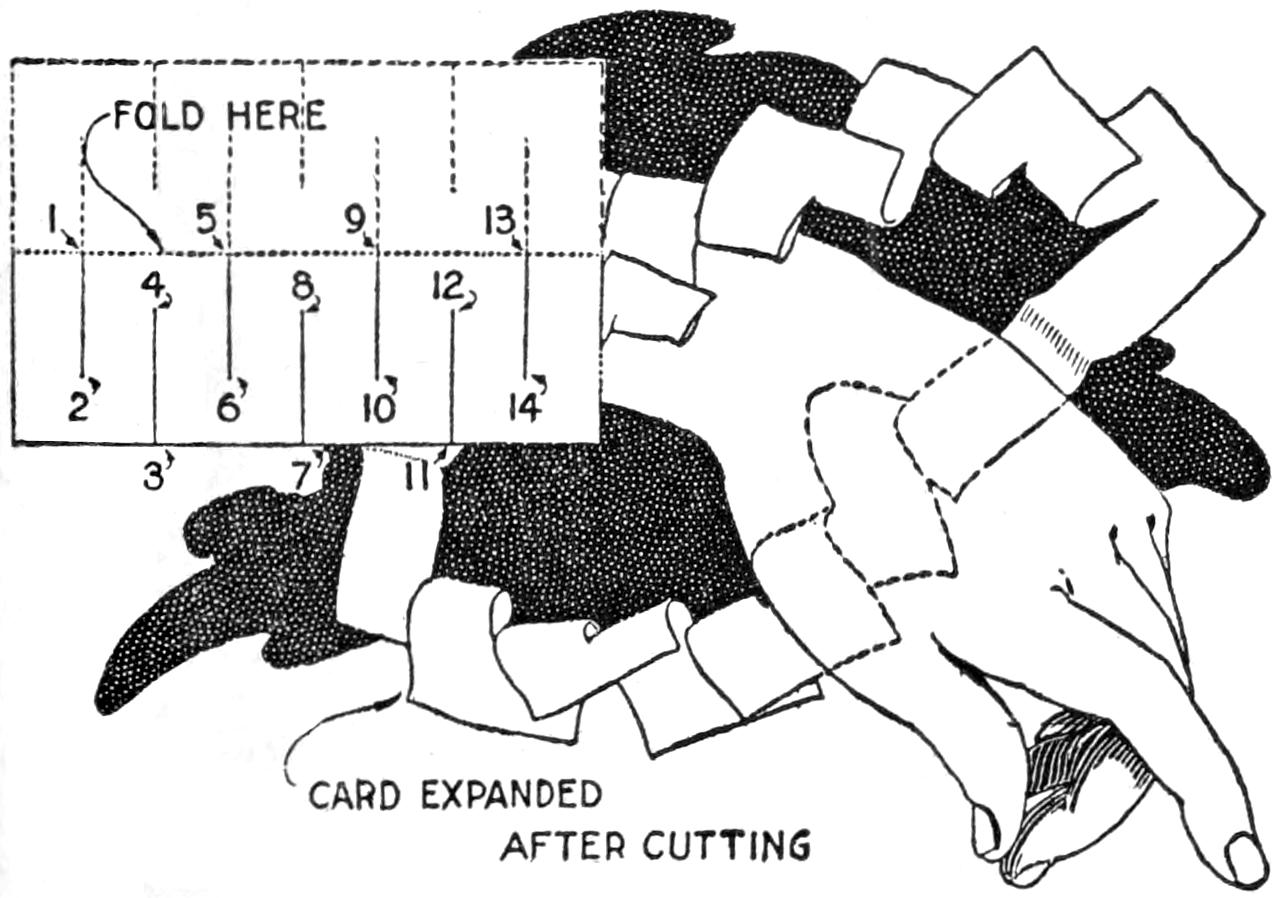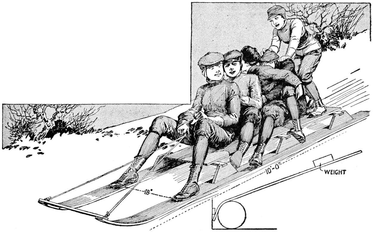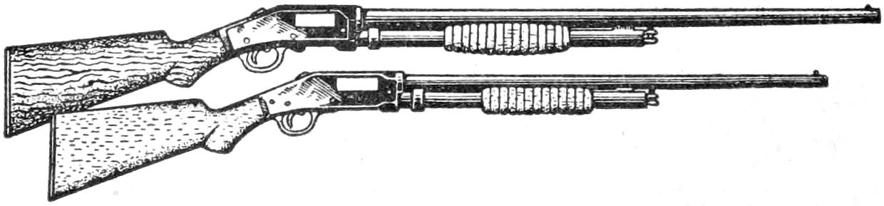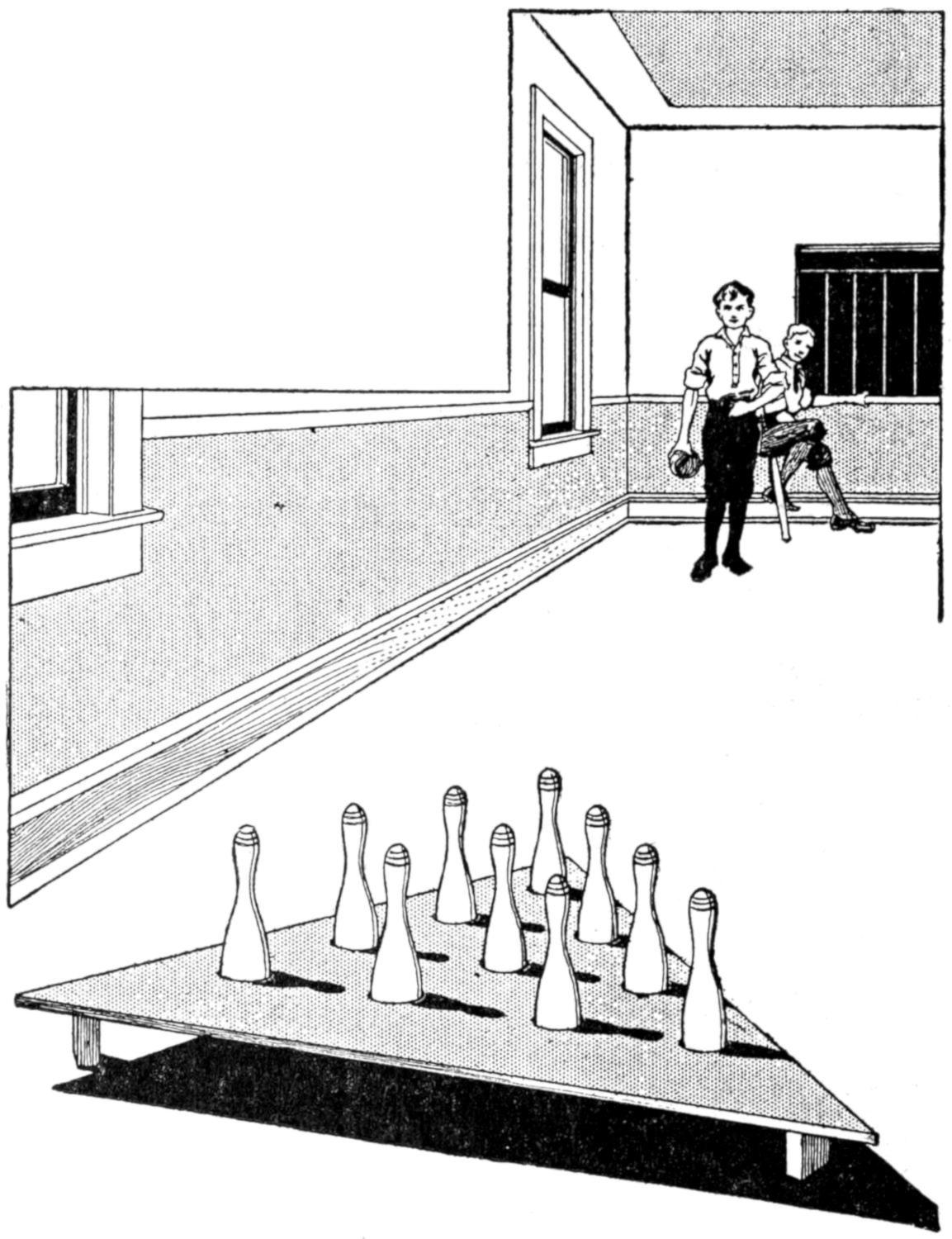 A new type of bow gun that a boy can make, and which will give him plenty of good sport, is one of the repeating or magazine variety. To make the gun, cut a soft pine board, 40 in.[459] long and 5 in. wide. With a saw and knife, cut the gun form as shown. Cut a groove along the top of the barrel, where the arrow will lie ready to be shot out when the hickory bow is released. The magazine holding the five arrows is made of thin boards, 24 in. long, and is held in place by four small strips. The magazine is 3 in. deep, thus permitting the five arrows to lie evenly in it without crowding. The bow is of seasoned hickory and is set into the end of the barrel. The notch in which the bowstring catches, should be cut just under the rear end of the magazine. The trigger is an L-shaped, pivoted piece, and pushes the cord off the notch when ready to fire. As soon as the first arrow leaves the gun the one just above it drops down into the groove when the bowstring is again pulled back into place behind the notch. Pressure on the trigger shoots this arrow, another takes its place, and the cord is pulled back once more. The arrows should be of light pine, 22 in. long and ¹⁄₂ in. square, the rear end notched and the front pointed. To make the arrow shoot in a straight course, and to give it proper weight, the head end should be bored with a ³⁄₁₆ in. bit, 3 in. deep, and melted lead run into the hole.—E. F. Dalton, Cincinnati, Ohio.