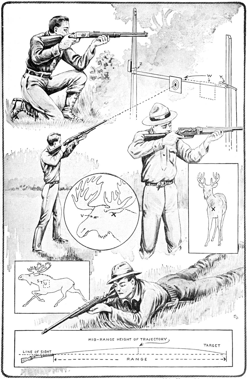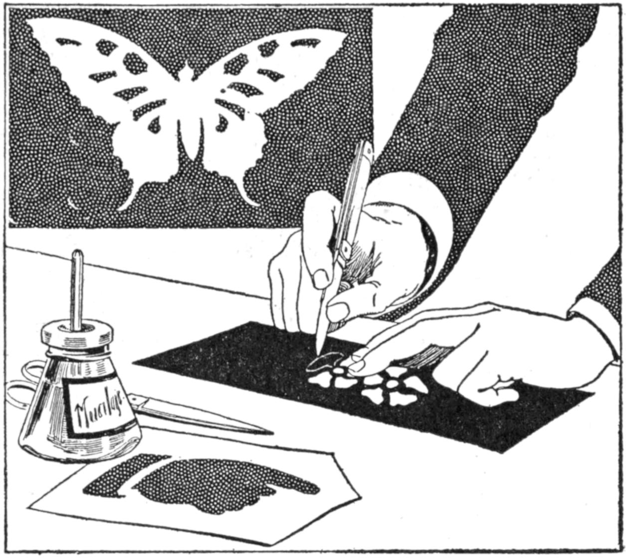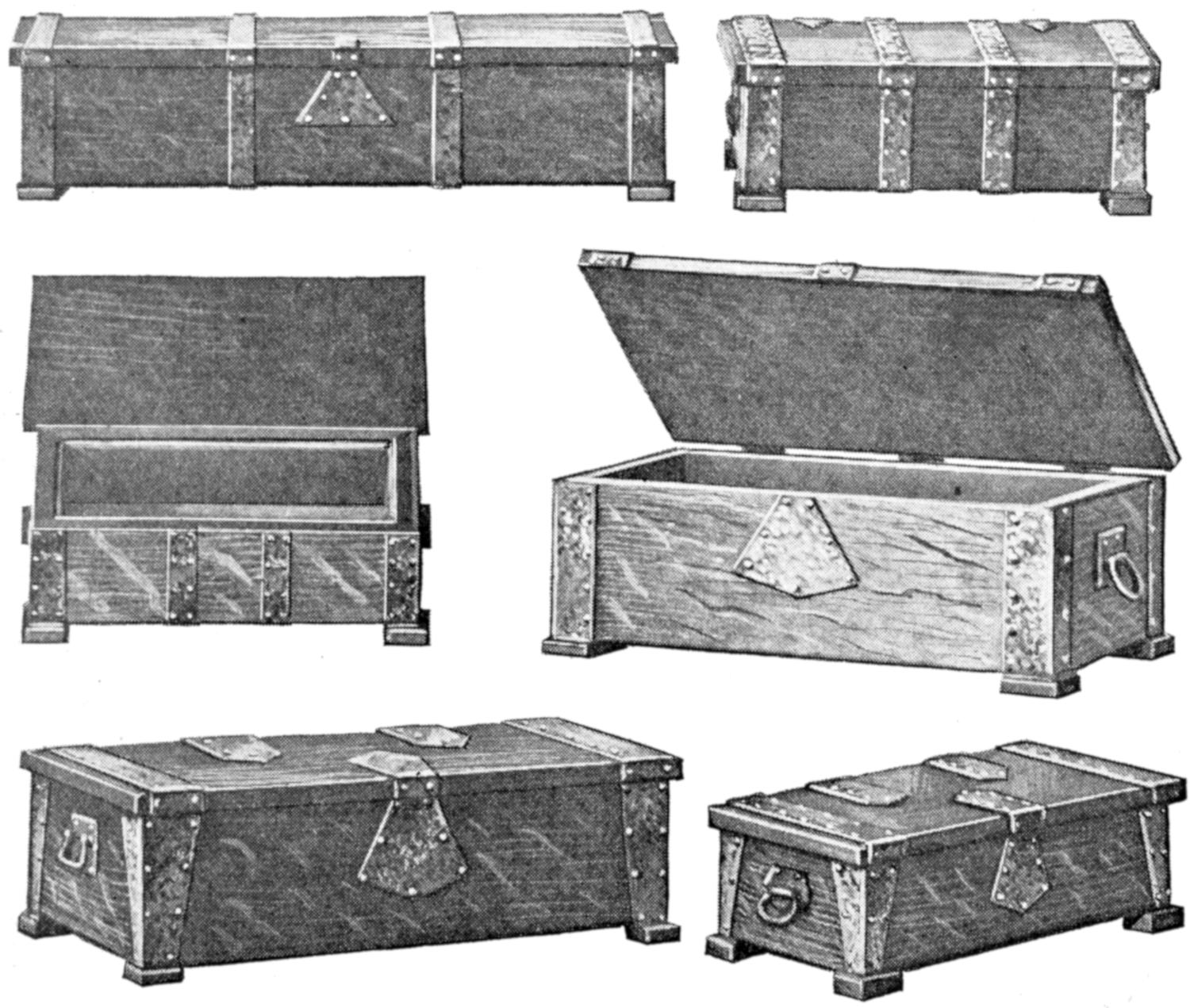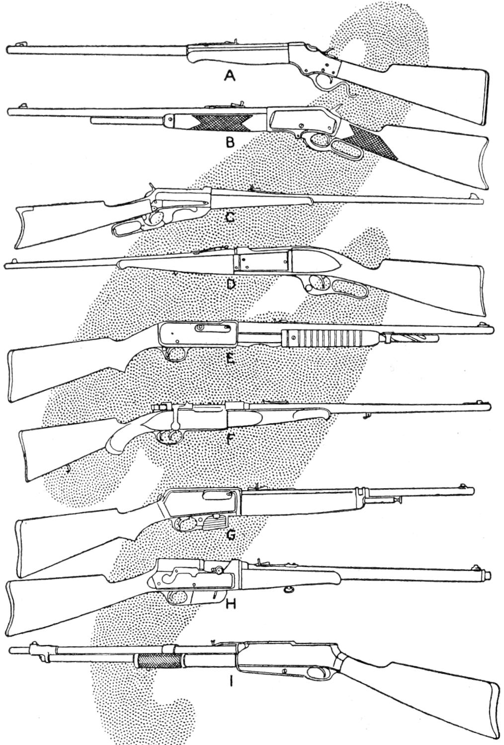 A new type of bow gun that a boy can make, and which will give him plenty of good sport, is one of the repeating or magazine variety. To make the gun, cut a soft pine board, 40 in.[459] long and 5 in. wide. With a saw and knife, cut the gun form as shown. Cut a groove along the top of the barrel, where the arrow will lie ready to be shot out when the hickory bow is released. The magazine holding the five arrows is made of thin boards, 24 in. long, and is held in place by four small strips. The magazine is 3 in. deep, thus permitting the five arrows to lie evenly in it without crowding. The bow is of seasoned hickory and is set into the end of the barrel. The notch in which the bowstring catches, should be cut just under the rear end of the magazine. The trigger is an L-shaped, pivoted piece, and pushes the cord off the notch when ready to fire. As soon as the first arrow leaves the gun the one just above it drops down into the groove when the bowstring is again pulled back into place behind the notch. Pressure on the trigger shoots this arrow, another takes its place, and the cord is pulled back once more. The arrows should be of light pine, 22 in. long and ¹⁄₂ in. square, the rear end notched and the front pointed. To make the arrow shoot in a straight course, and to give it proper weight, the head end should be bored with a ³⁄₁₆ in. bit, 3 in. deep, and melted lead run into the hole.—E. F. Dalton, Cincinnati, Ohio.