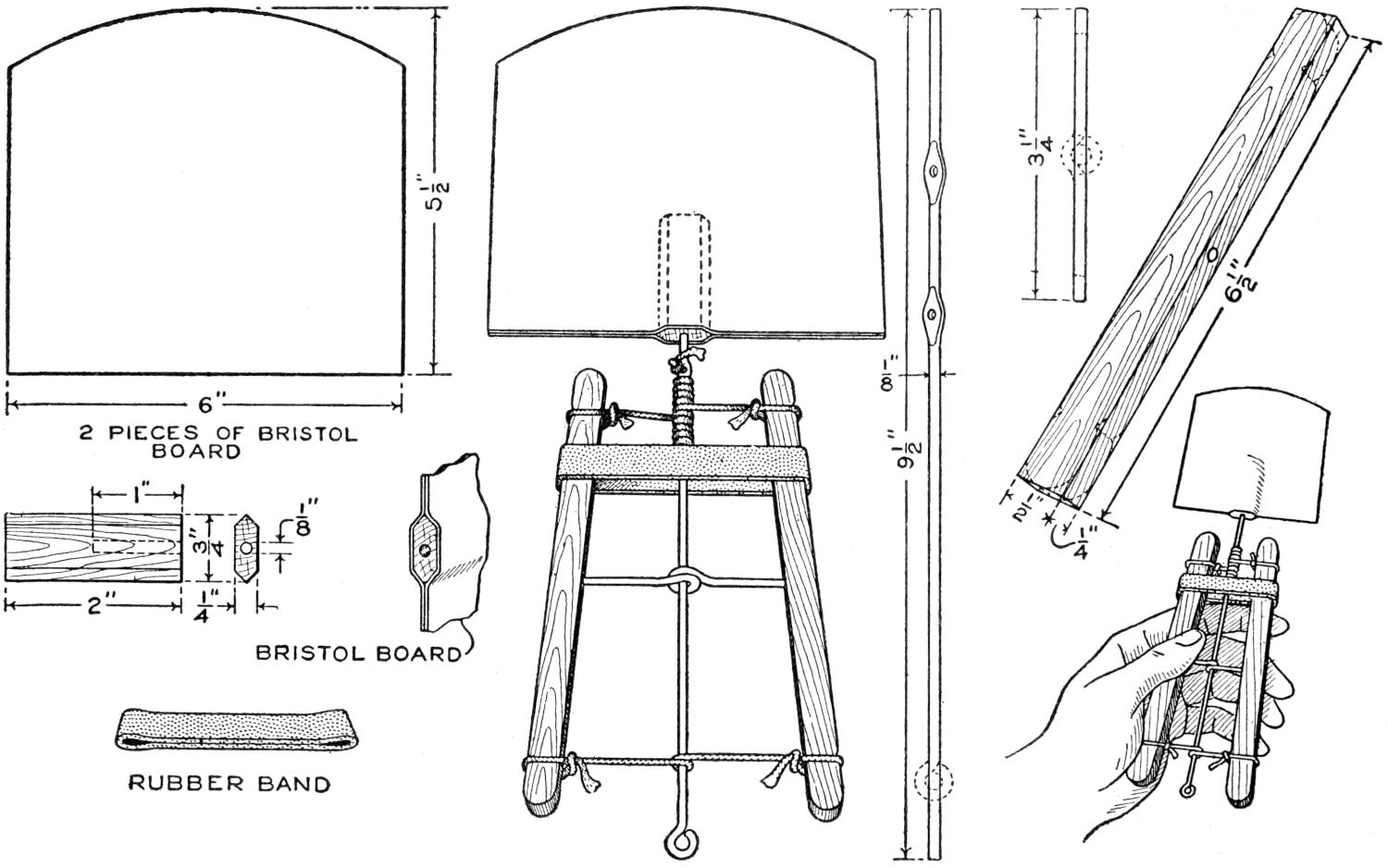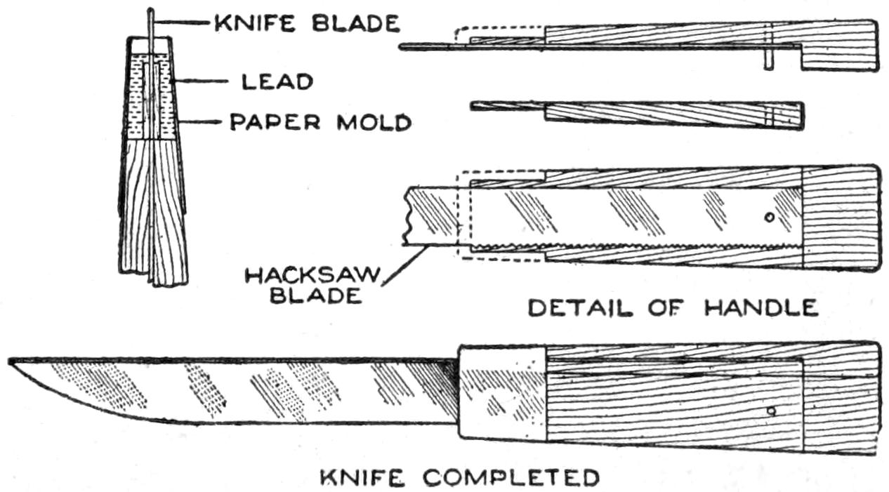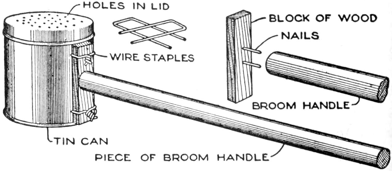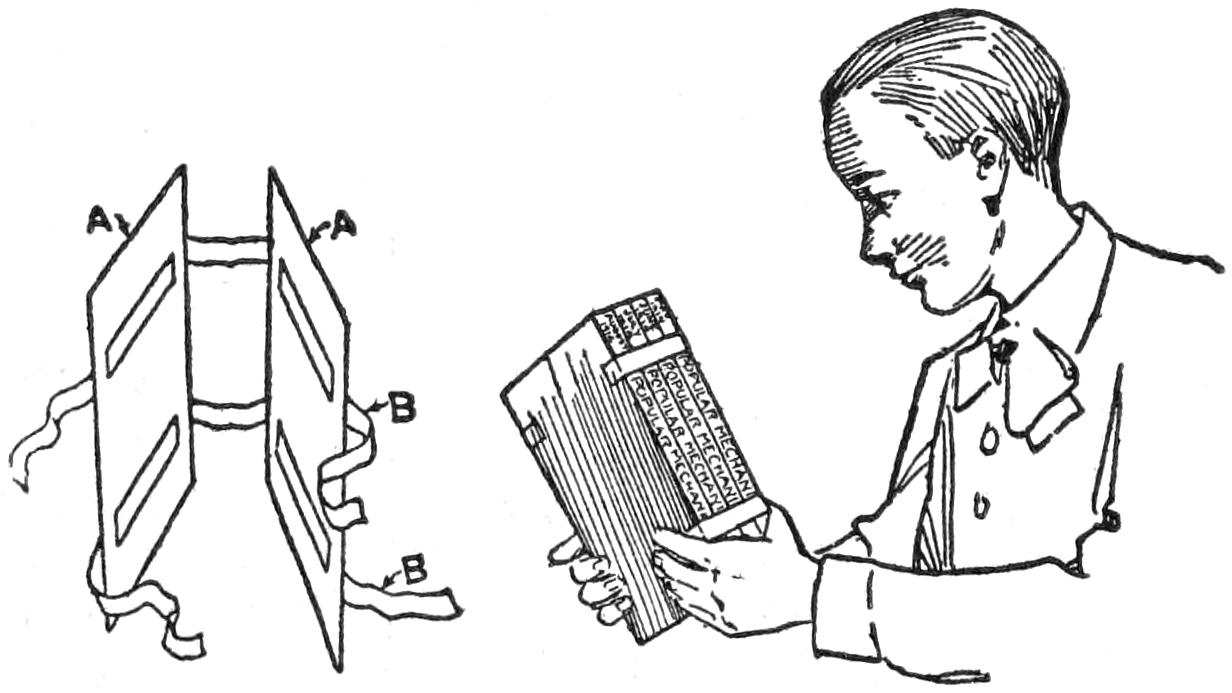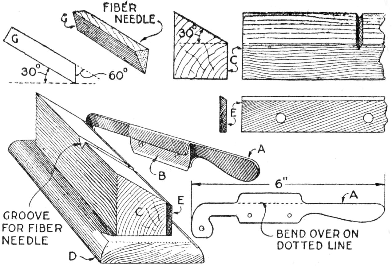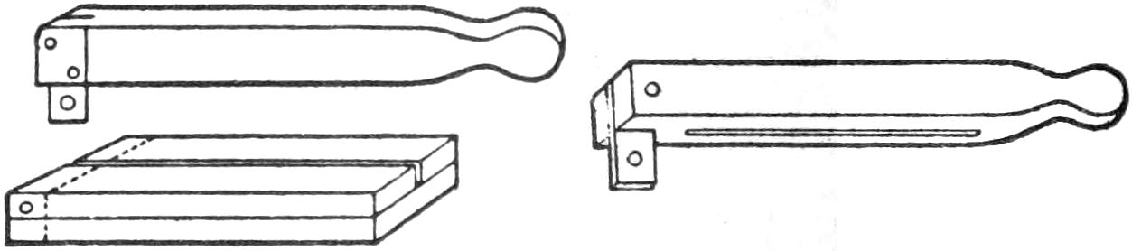 A compact outfit, which the soldier or camper will appreciate, consists of a comb, brush, and mirror, clamped together, as shown in the sketch. Two long staples are set into the back of the brush handle, as indicated. From a board, ¹⁄₄ in. thick, the backing for the metal “trench mirror” is made, with the handle portion small enough to fit into the staples. A small brass strip acts as a spring when placed near the end of the mirror handle, and holds the outfit snugly.