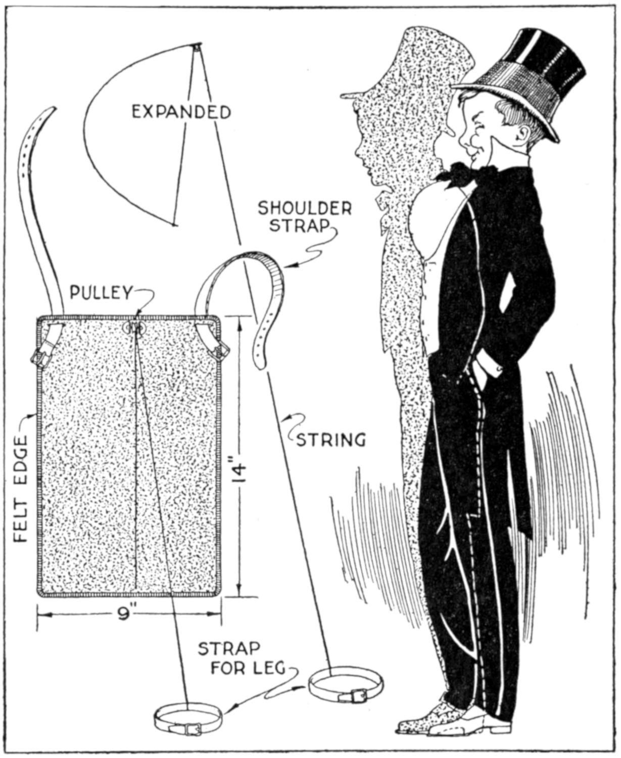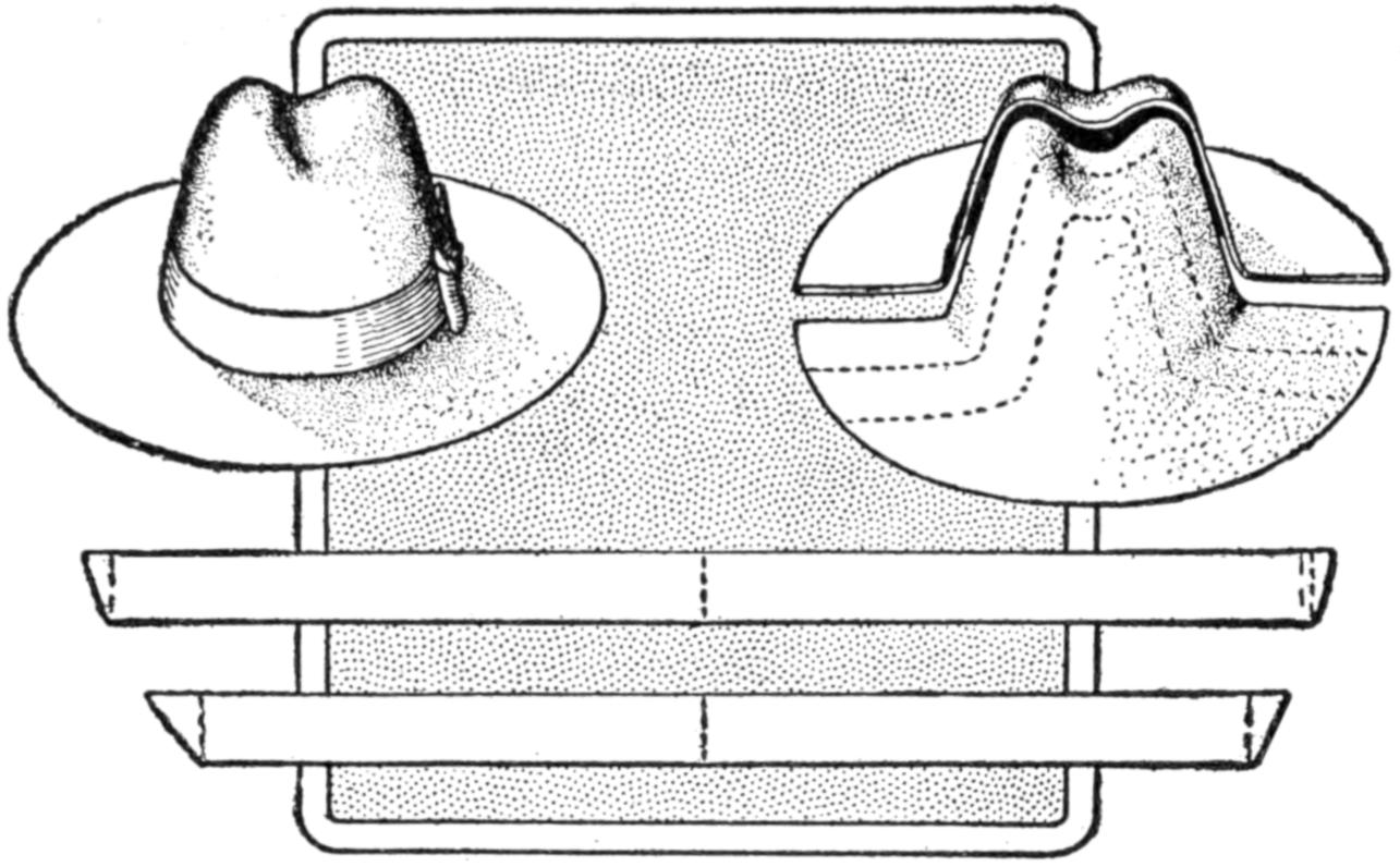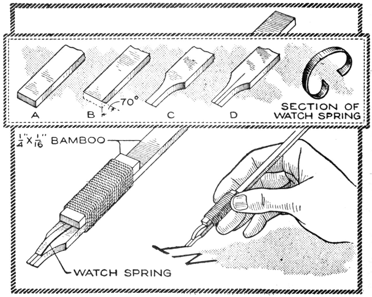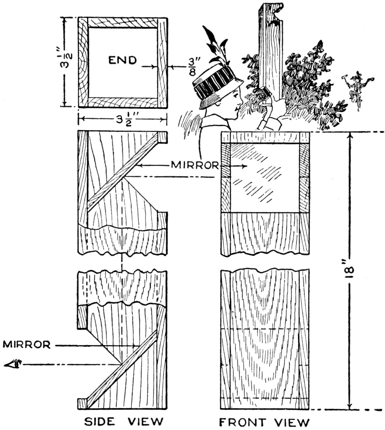 A compact outfit, which the soldier or camper will appreciate, consists of a comb, brush, and mirror, clamped together, as shown in the sketch. Two long staples are set into the back of the brush handle, as indicated. From a board, ¹⁄₄ in. thick, the backing for the metal “trench mirror” is made, with the handle portion small enough to fit into the staples. A small brass strip acts as a spring when placed near the end of the mirror handle, and holds the outfit snugly.