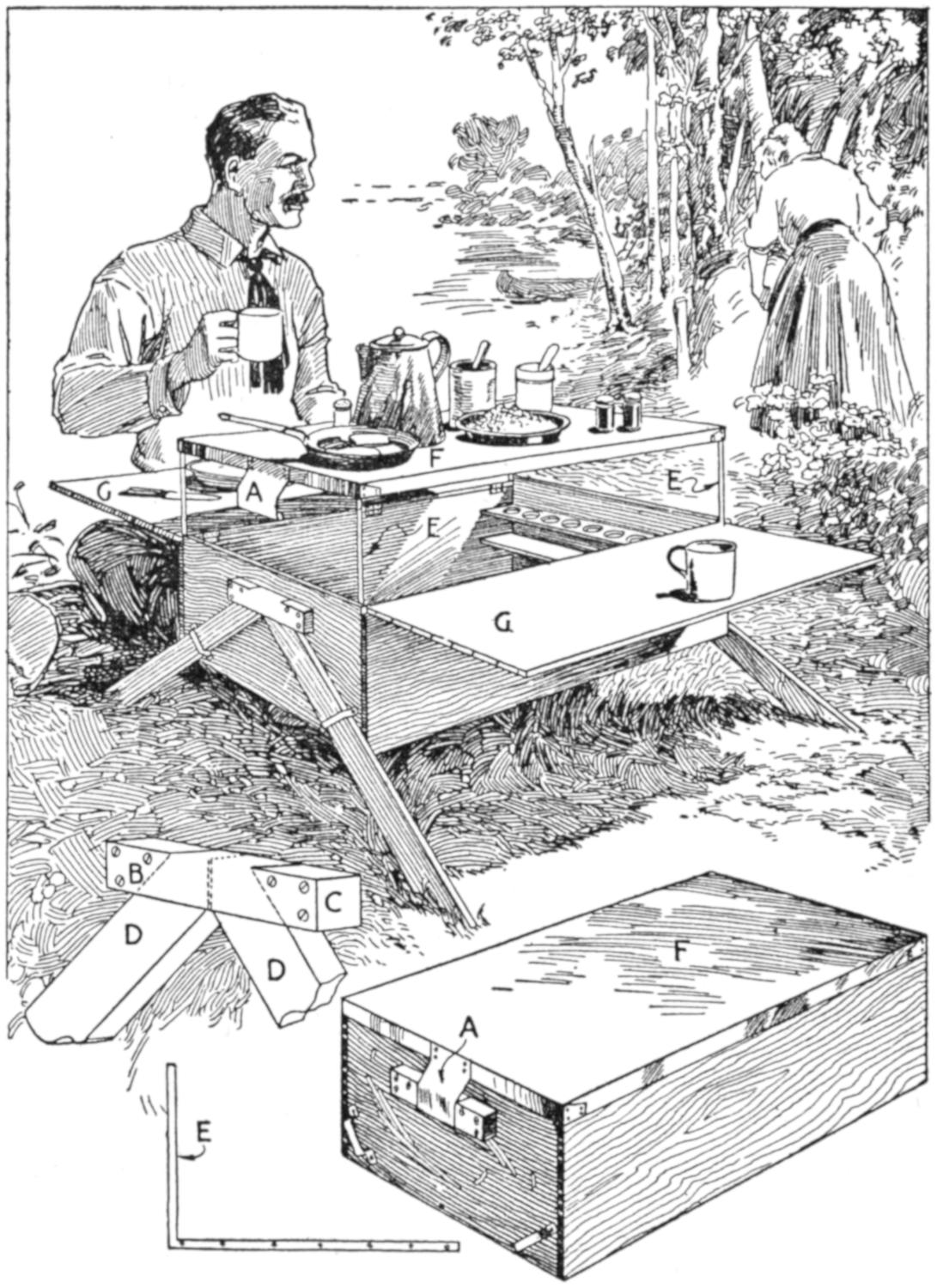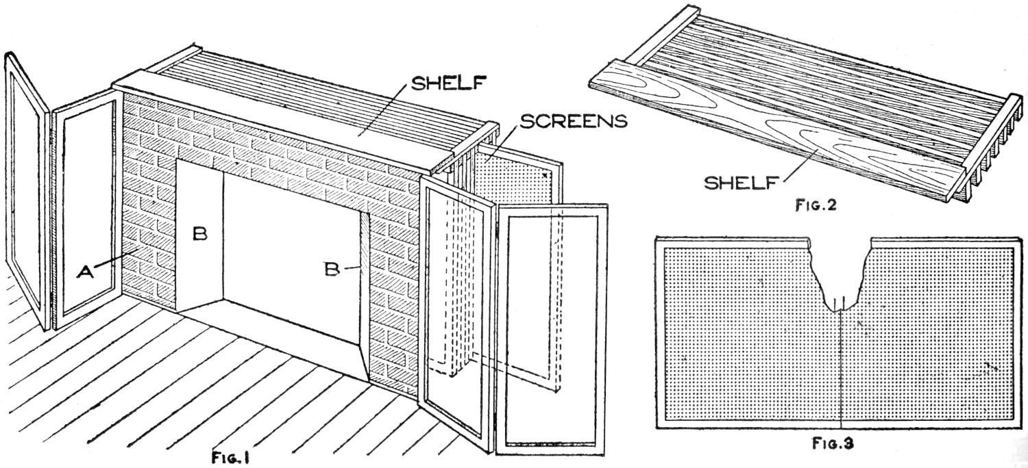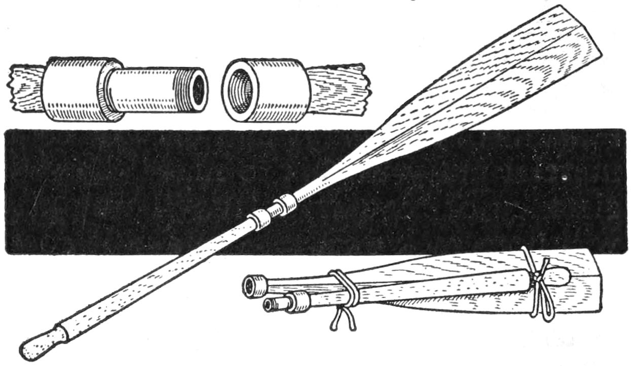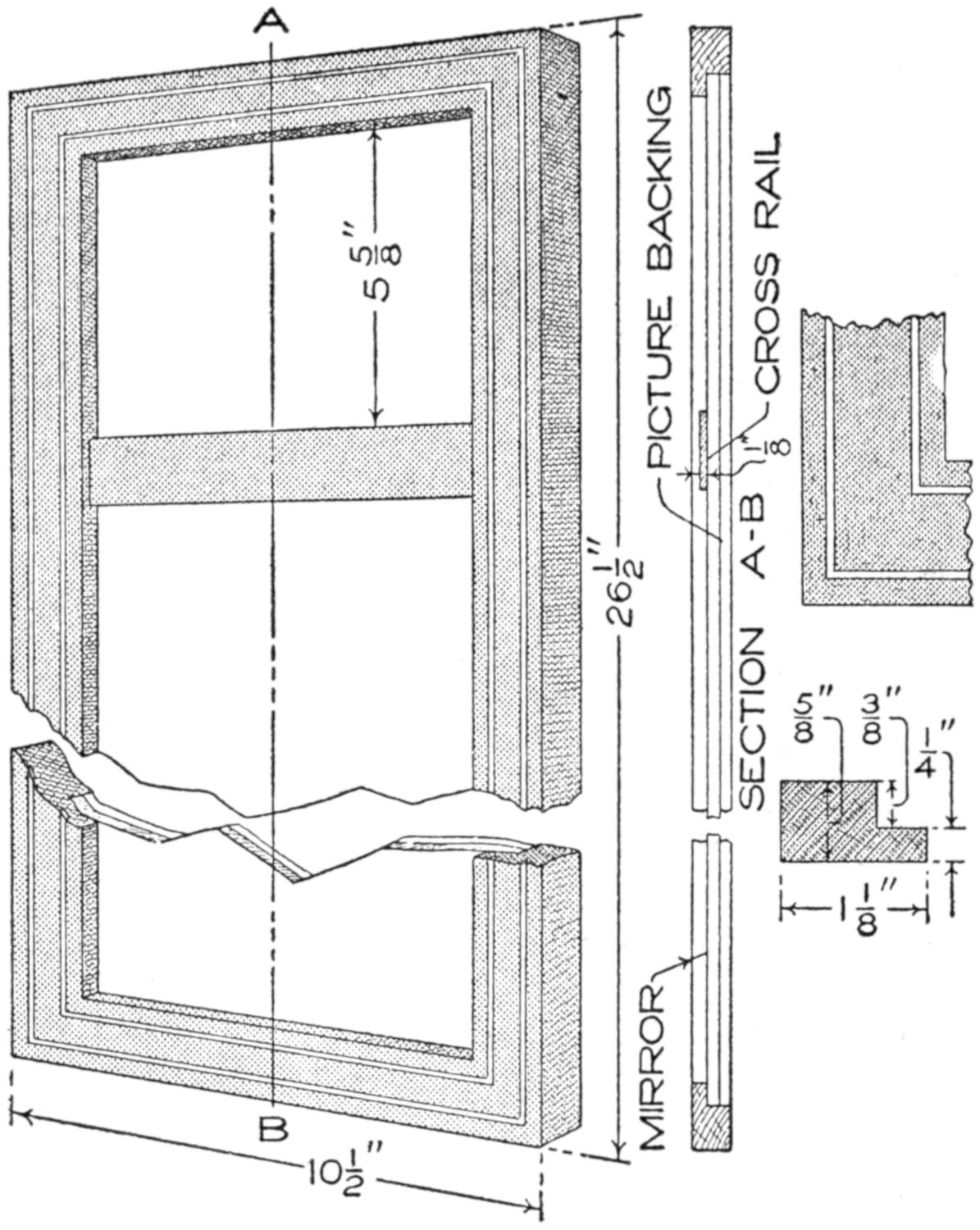 A compact outfit, which the soldier or camper will appreciate, consists of a comb, brush, and mirror, clamped together, as shown in the sketch. Two long staples are set into the back of the brush handle, as indicated. From a board, ¹⁄₄ in. thick, the backing for the metal “trench mirror” is made, with the handle portion small enough to fit into the staples. A small brass strip acts as a spring when placed near the end of the mirror handle, and holds the outfit snugly.