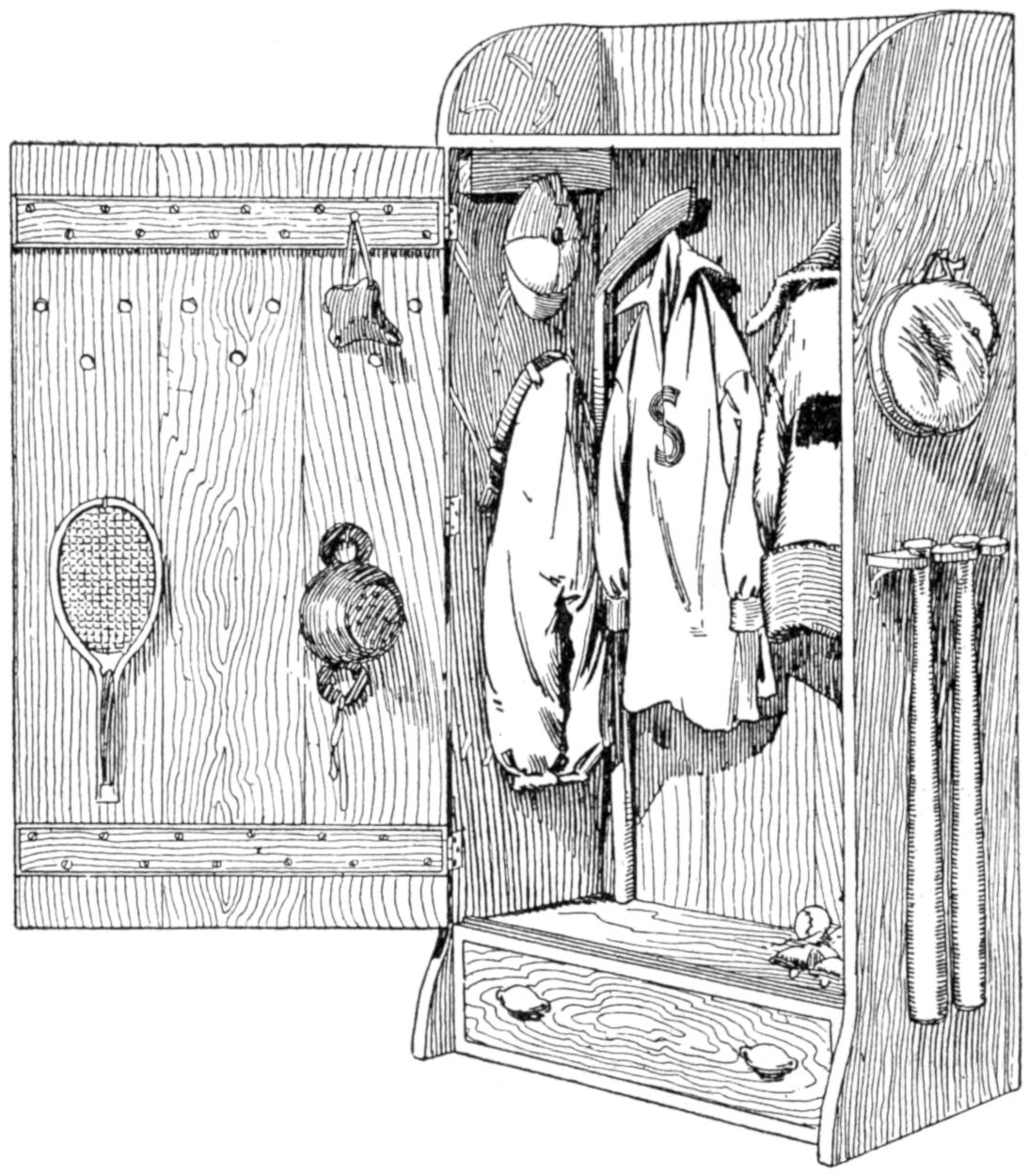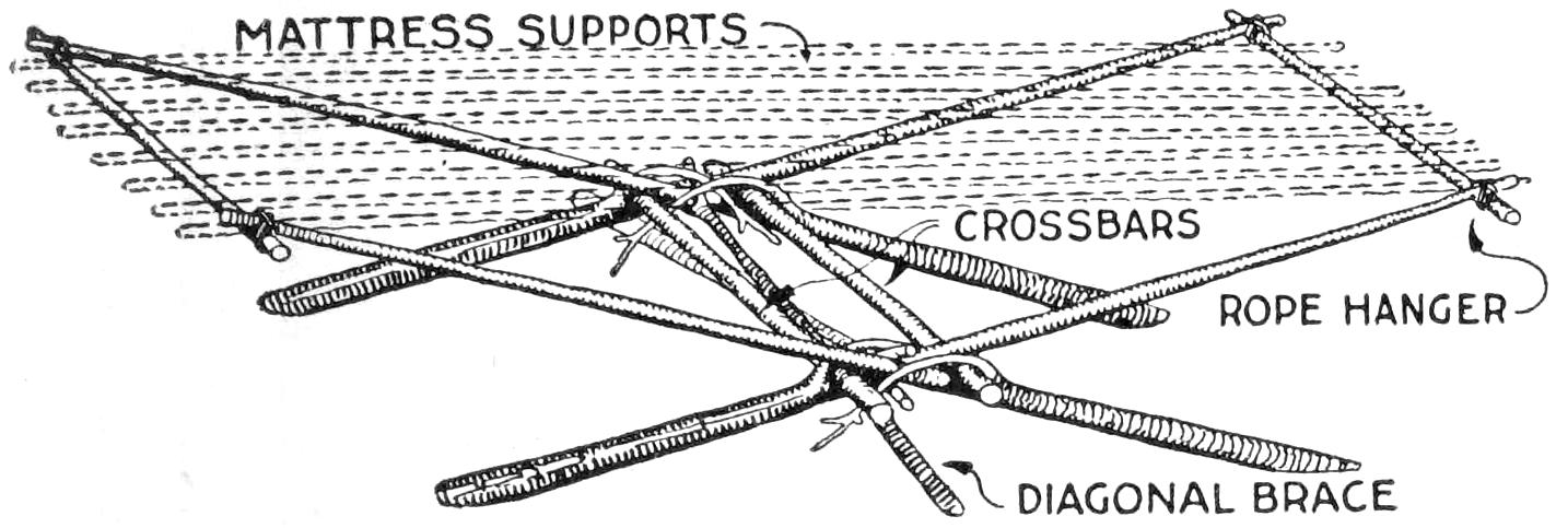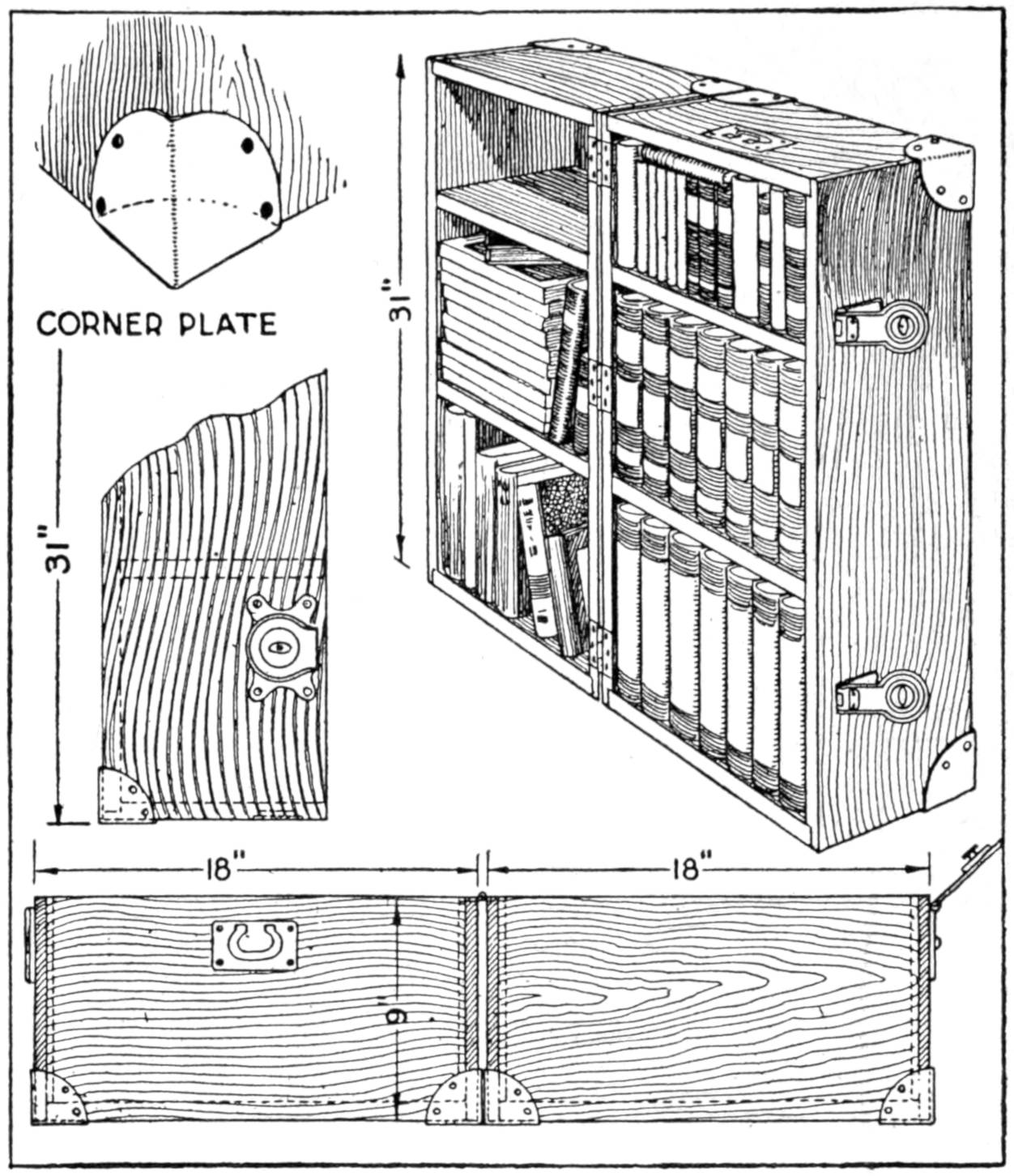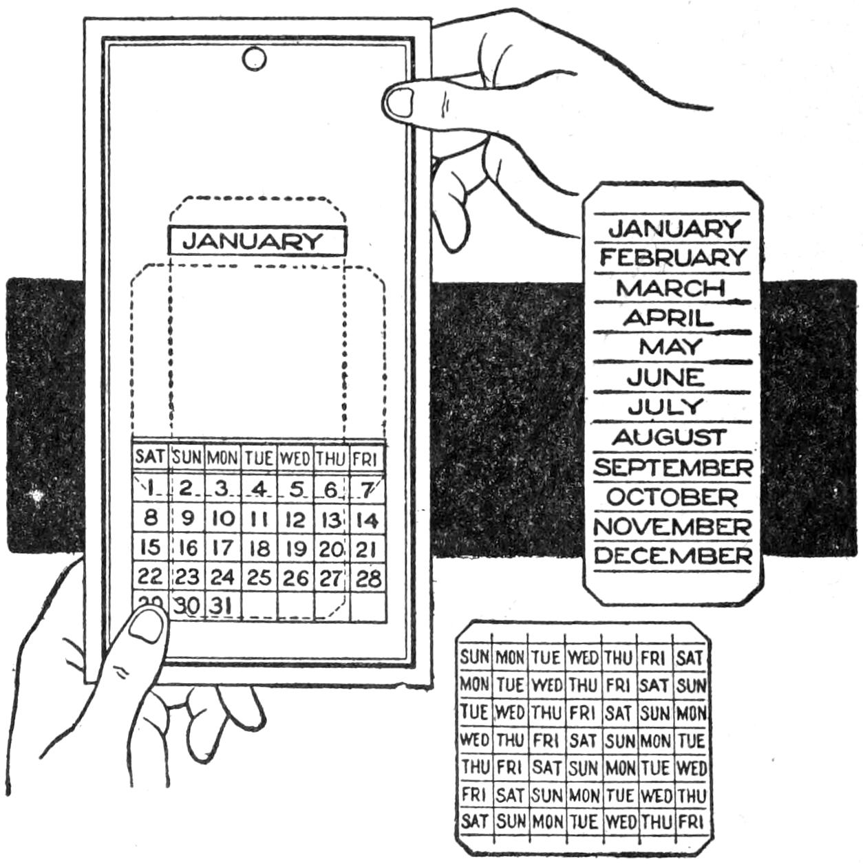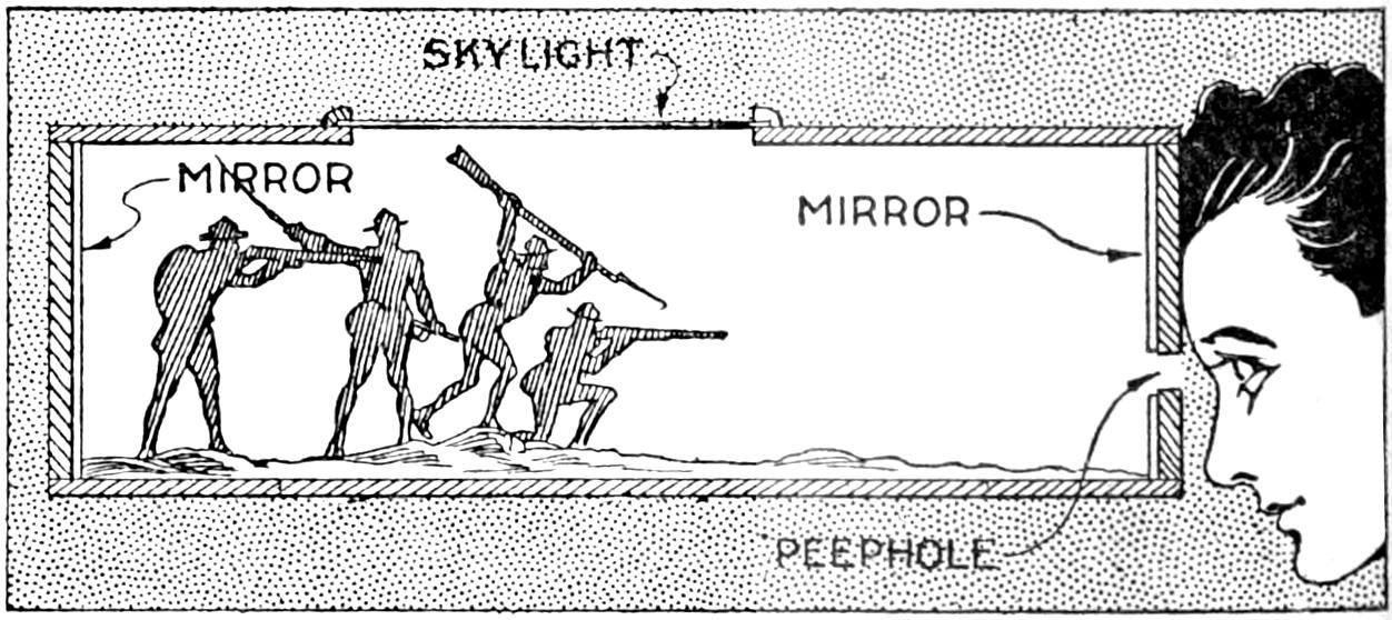 A compact outfit, which the soldier or camper will appreciate, consists of a comb, brush, and mirror, clamped together, as shown in the sketch. Two long staples are set into the back of the brush handle, as indicated. From a board, ¹⁄₄ in. thick, the backing for the metal “trench mirror” is made, with the handle portion small enough to fit into the staples. A small brass strip acts as a spring when placed near the end of the mirror handle, and holds the outfit snugly.